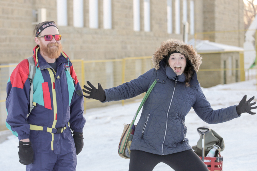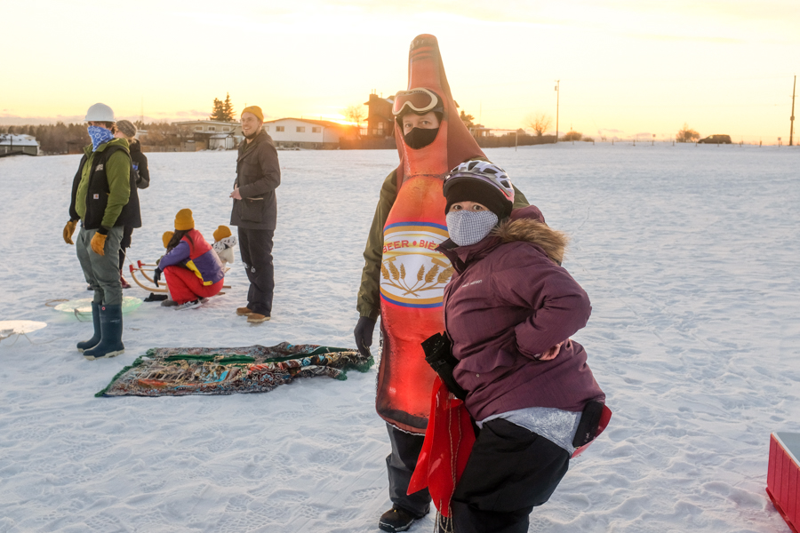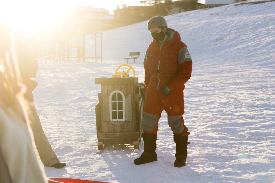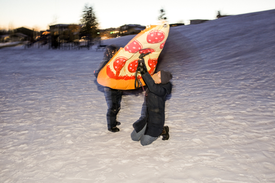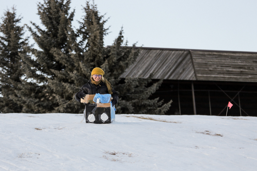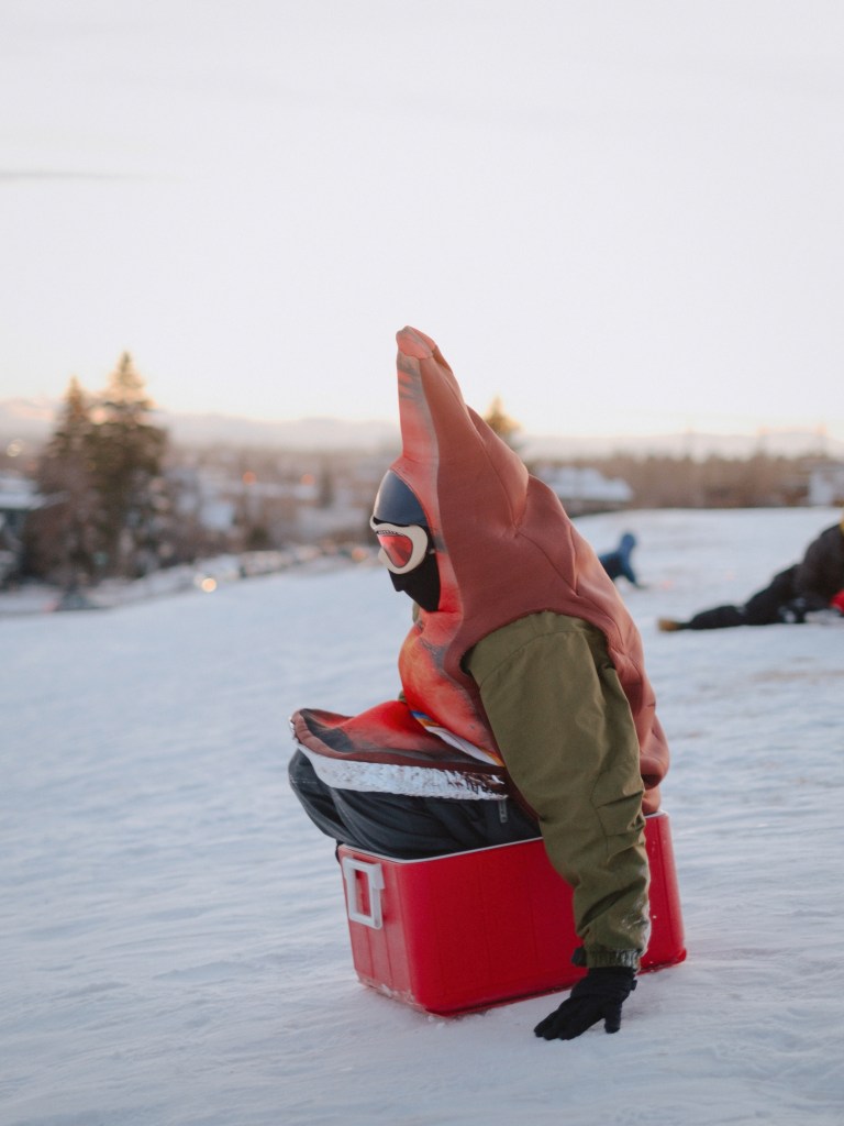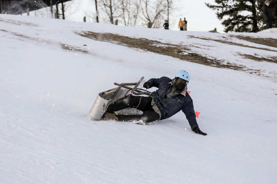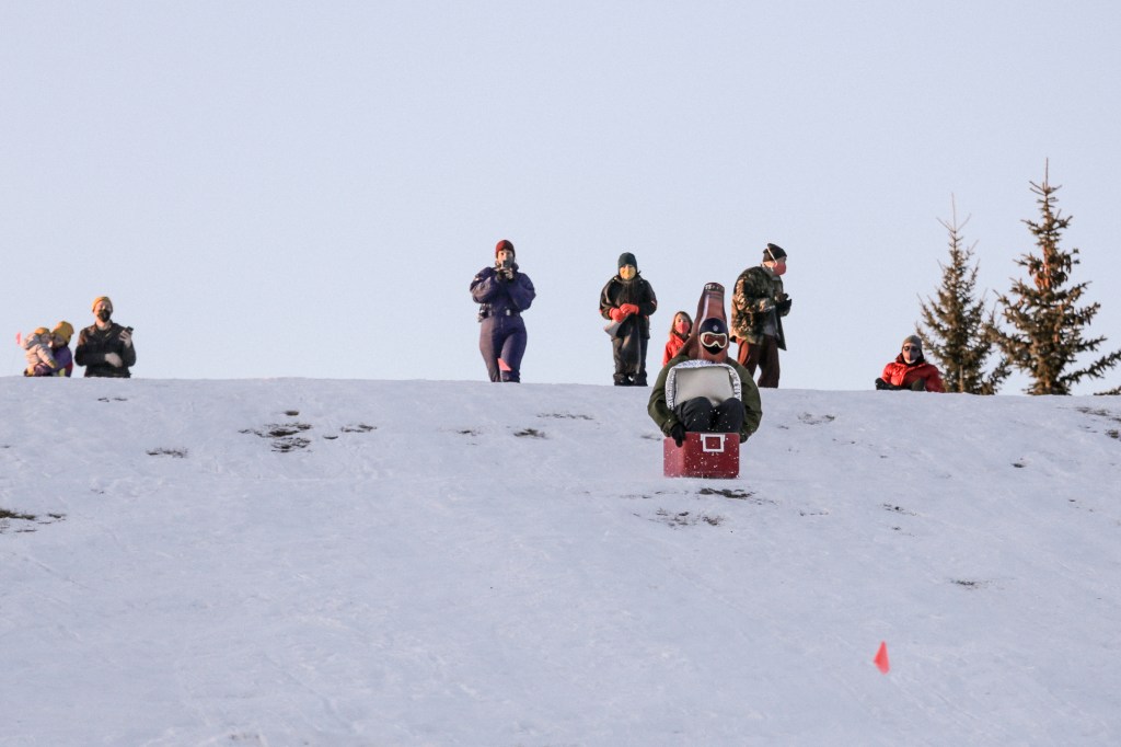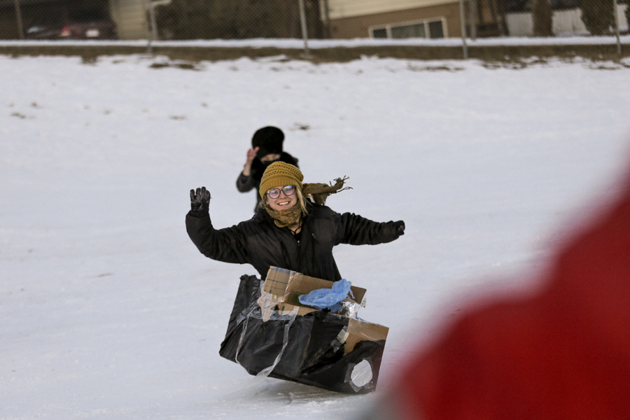 Sledding Day! Photos by Allison SetoDaniel racing his cooler, wearing a beer costume. Photo by Nikki Tambourine