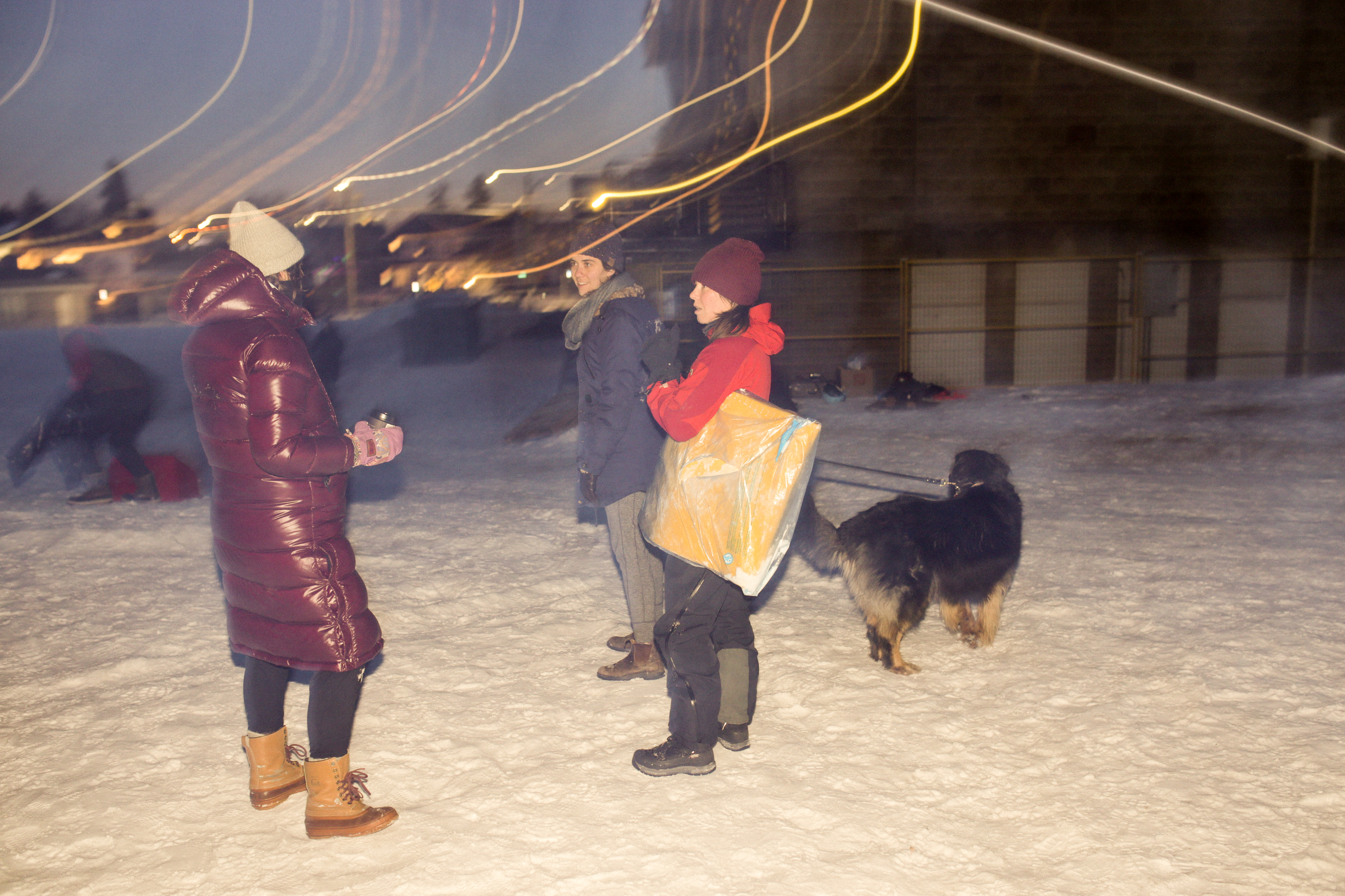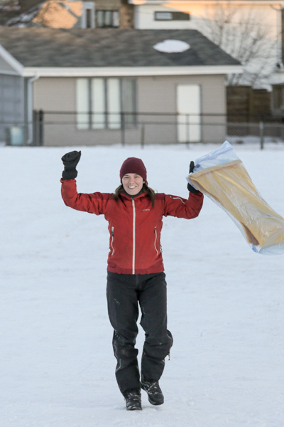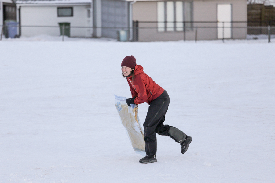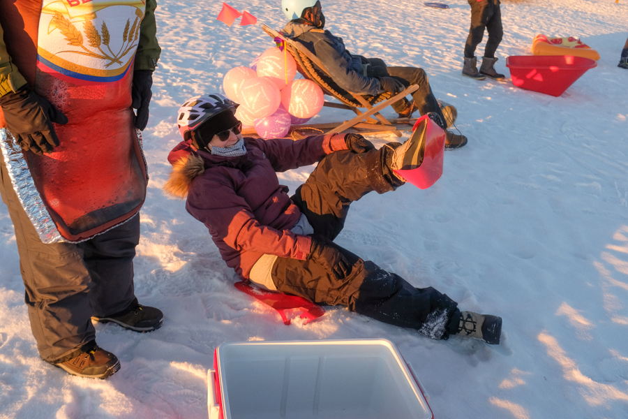 Genevieve Pare with her yoga mat/ziploc bag sledGrand finale! Photo by Allison SetoFinal race!