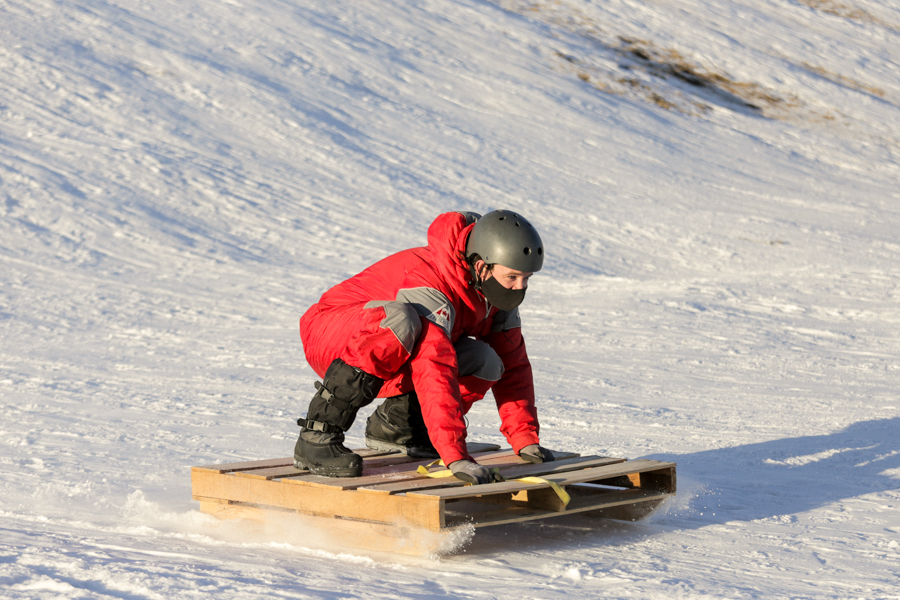 Lane & Nikki’s wheelbarrow sledWayne’s pallet sledView from the top of the hill. Photo by Allison Seto