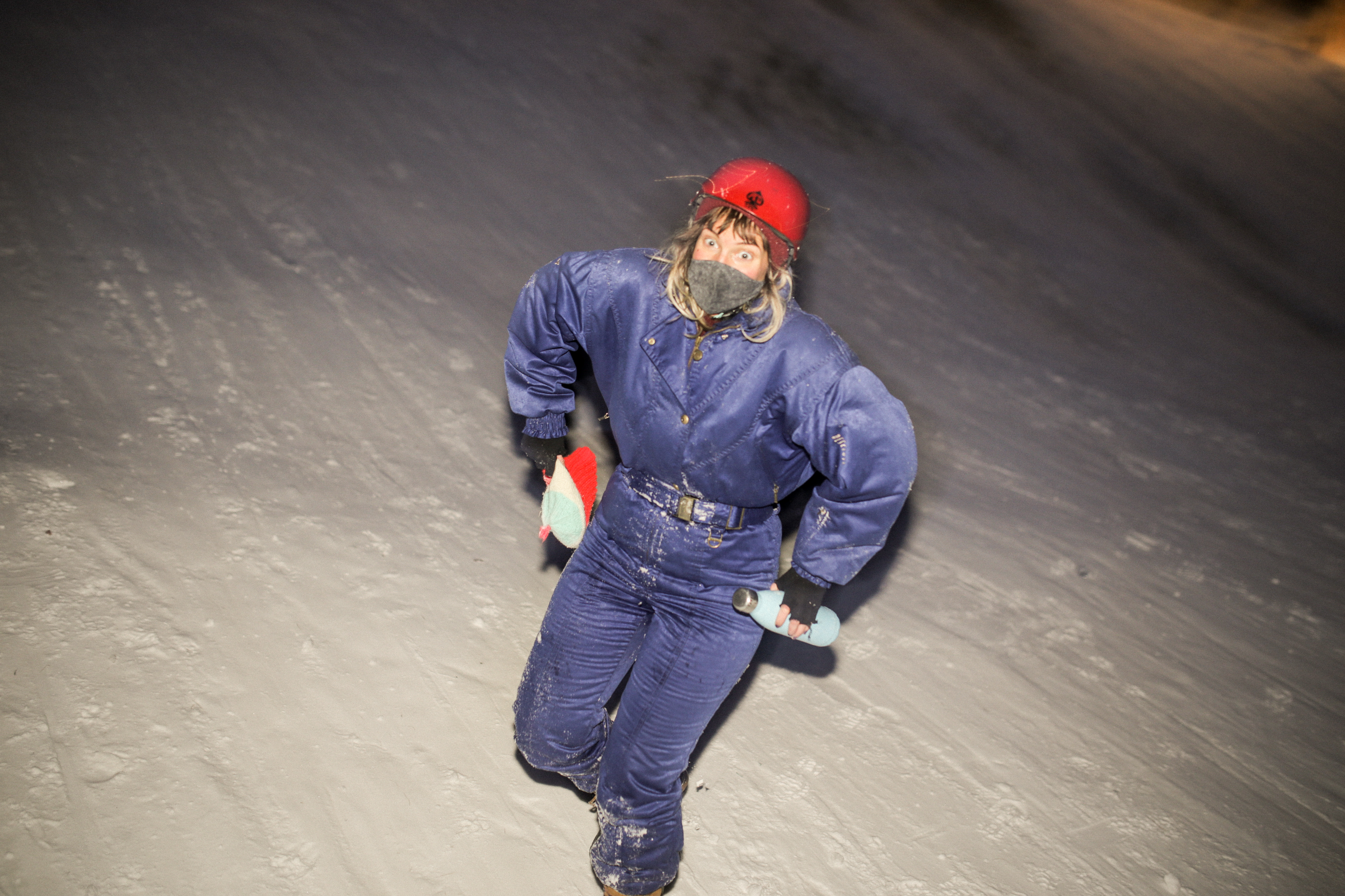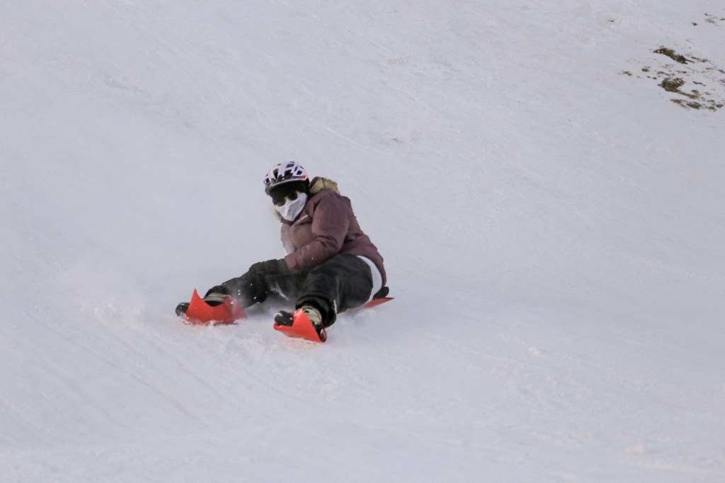 Maggie & Daniel’s toboggans – crazy carpet shoes and underpants, and a beer cooler (respectively)Maggie, slip sliding down the hill