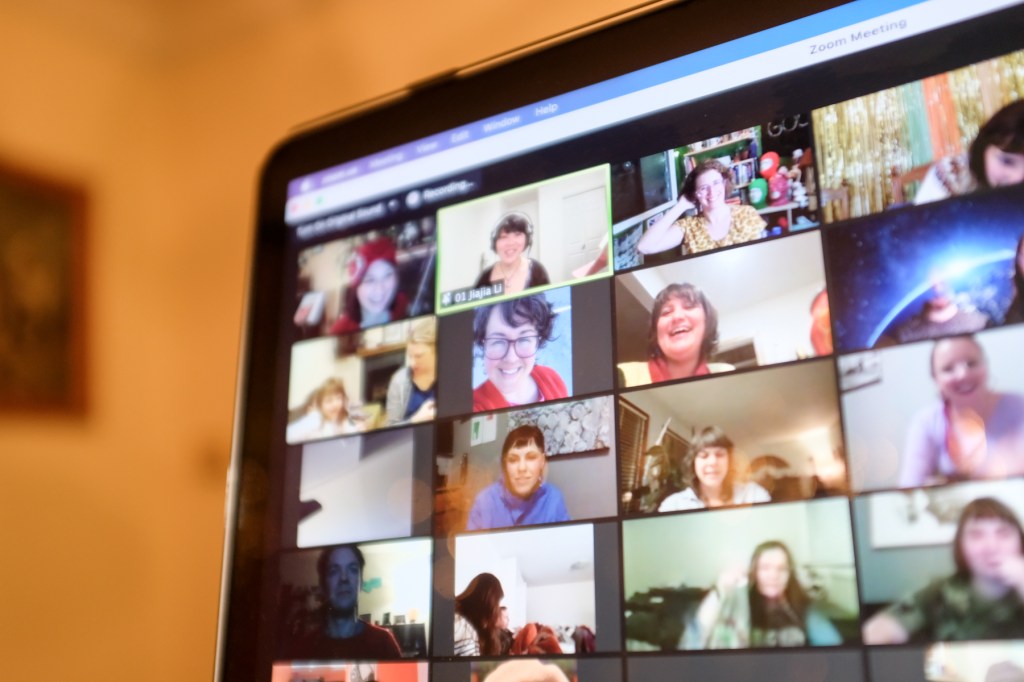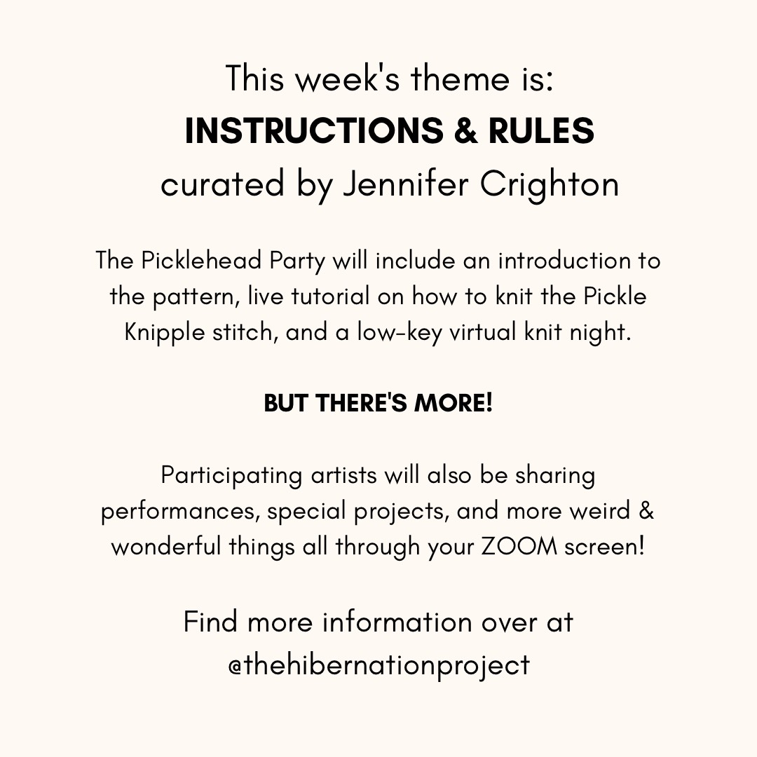 Knitters from near and far were invited to follow the pattern created by Suzen – a comical, nipple-studded, fluorescent-coloured, head warmer available on Ravelry. Suzen shared tips, tricks, and philosophies about knitting and craft as knitters cast on together. When the evening divided into Breakout rooms, a group of knitters gathered in one room to continue building their Pickleheads.