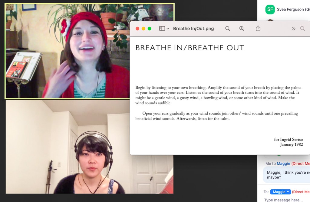 The first artists to participate were Laura Reid & Jiajia Li (collaboratively known as Who Cares?) The duo performed a series of improvised, interchanging solos. The first was a throwback to Laura Reid’s performance in a Hibernation event from early 2020, SYNAESTHESIA. The artists firmly planted a colour in their heads, and then attempted to perform the colour. Audience members were invited to guess what colour the music was emulating. (Can you guess before they reveal it?)