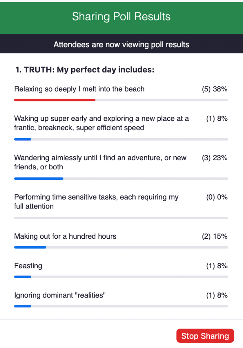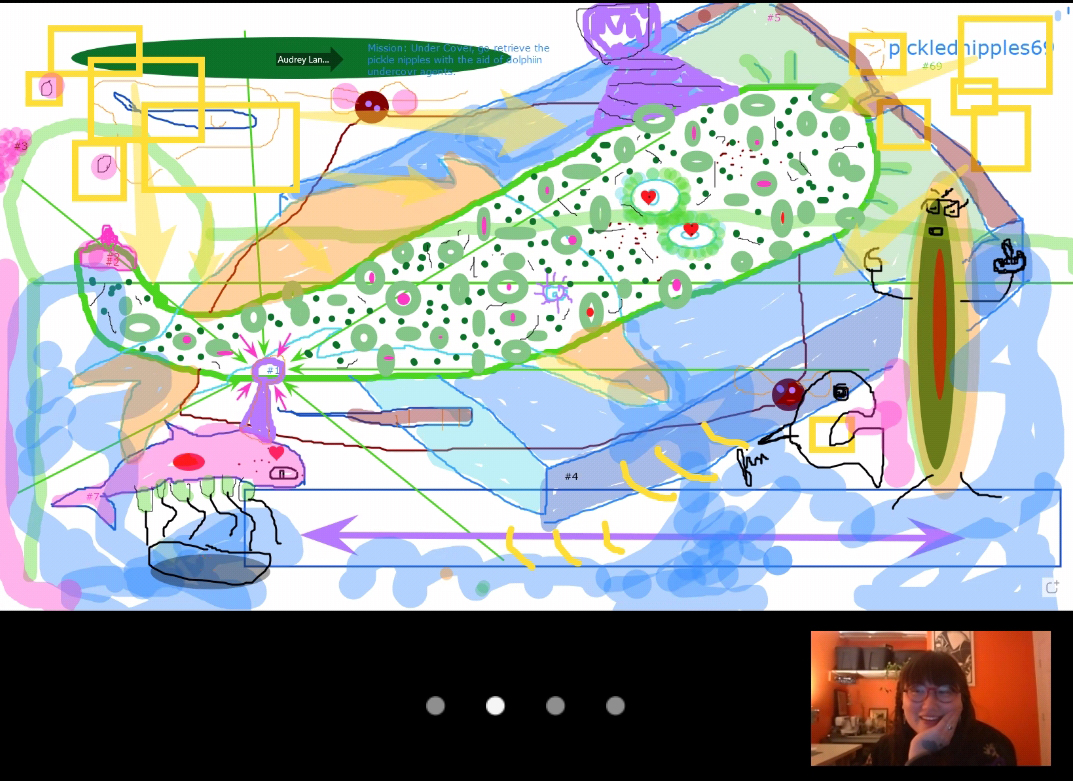 Throughout the evening, a series of pop-ups were released by Caitlind Brown, subverting the “poll” function of Zoom and inviting participants to play a virtual game of Truth or Dare. Intended to offer possibilities both to “follow the rules” and “break them,” these pop-ups simulated the adolescent non-sequetors of kids at a sleepover, testing the edges of what’s allowed.