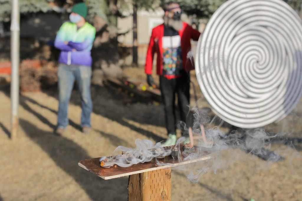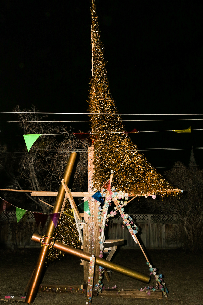 Susan Clarahan sent an aromatic installation from Toronto, filled with Rocky Mountain Pitch, Frankincense, and Myrrh, lit hour by hour to sparkle and smoke into the night.