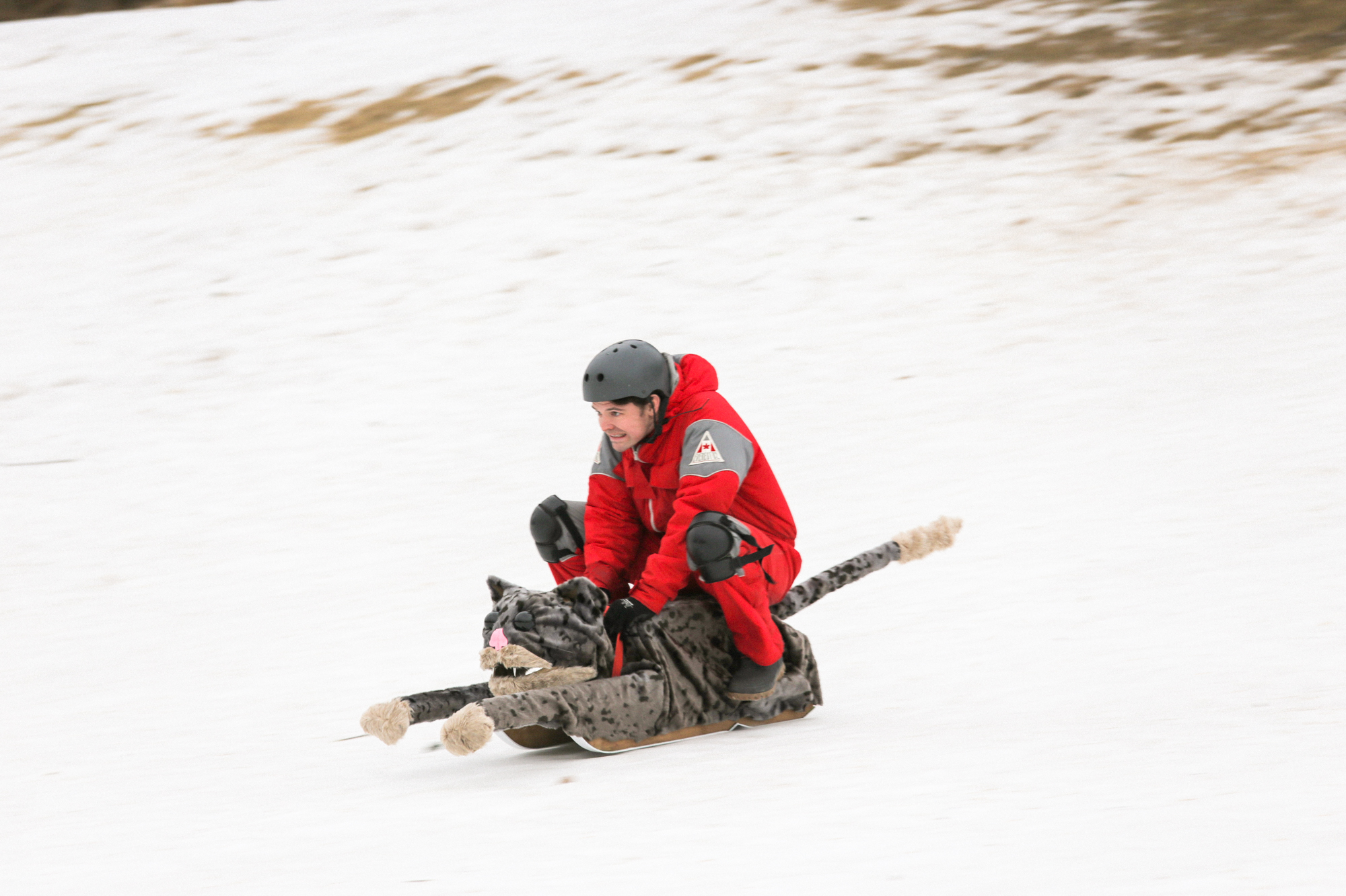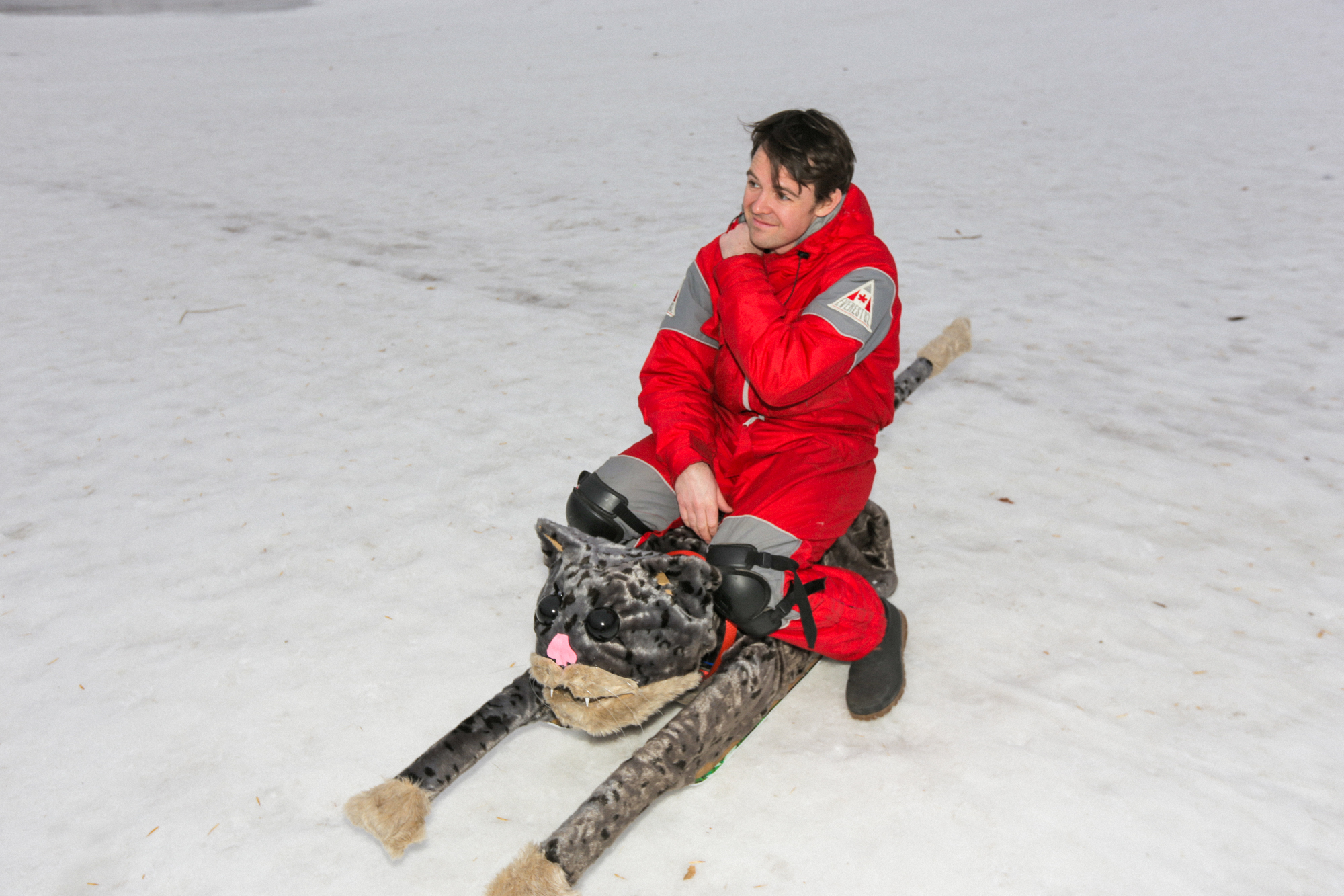 Wayne Garrett with his KatSki and the crowd forming to watch homemade tobogganers!