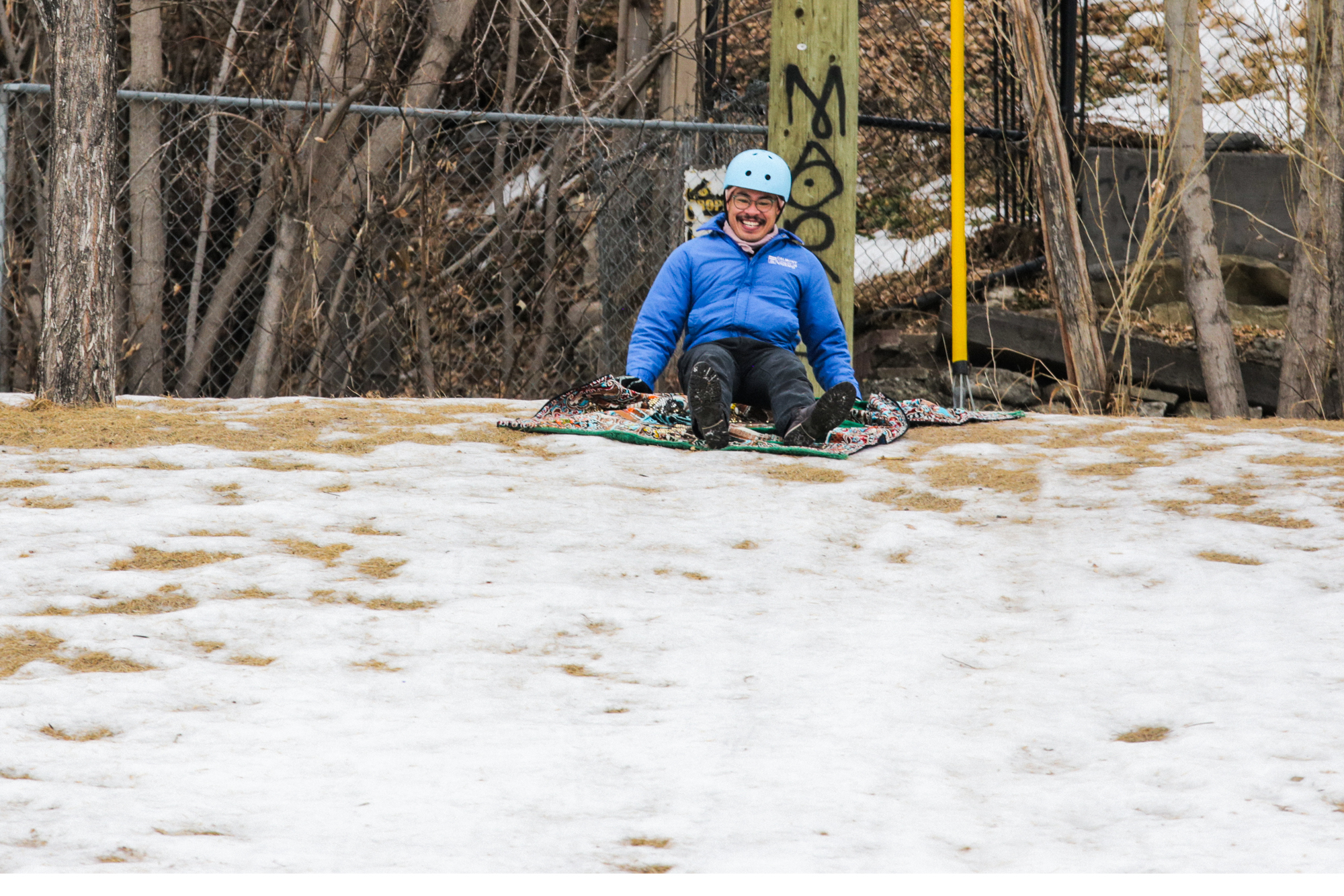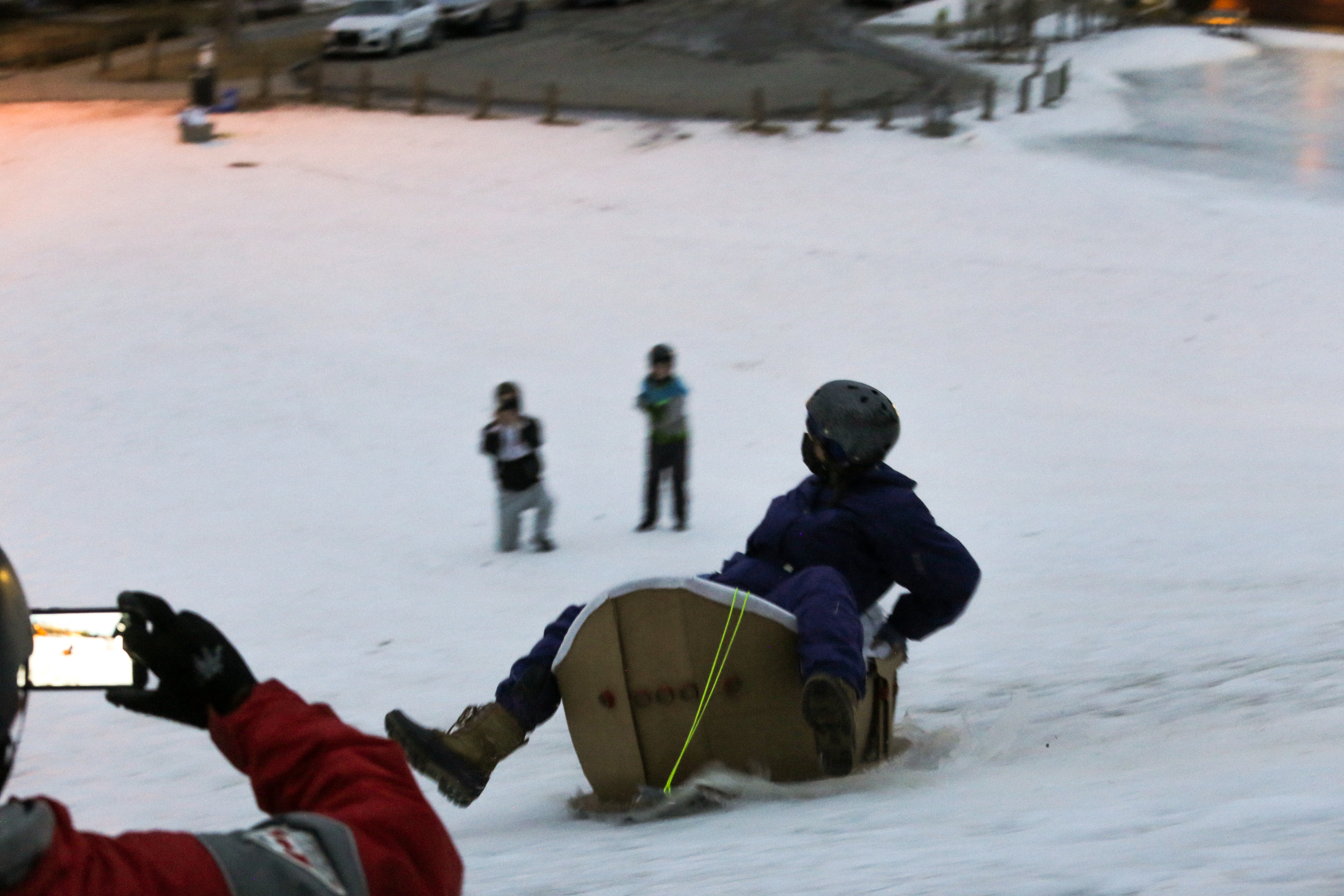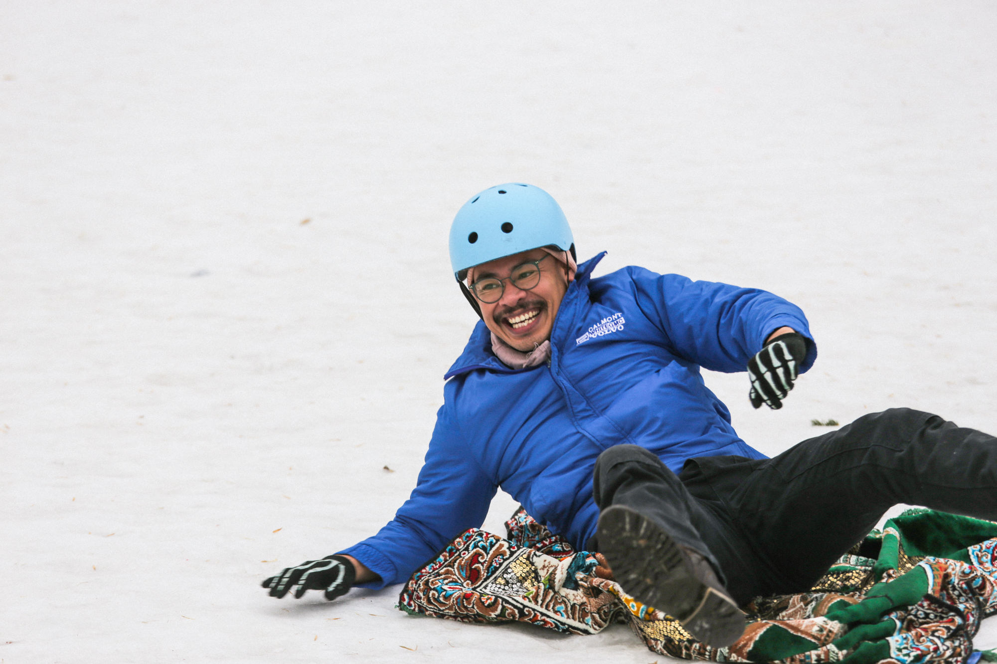 Mike Tan serving up homemade Vegan hot chocolate and showing off his sleeper moves on a Magic Carpet sled from last year