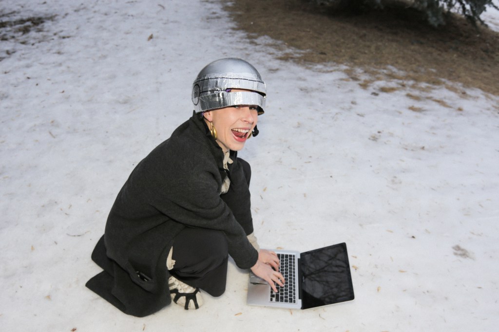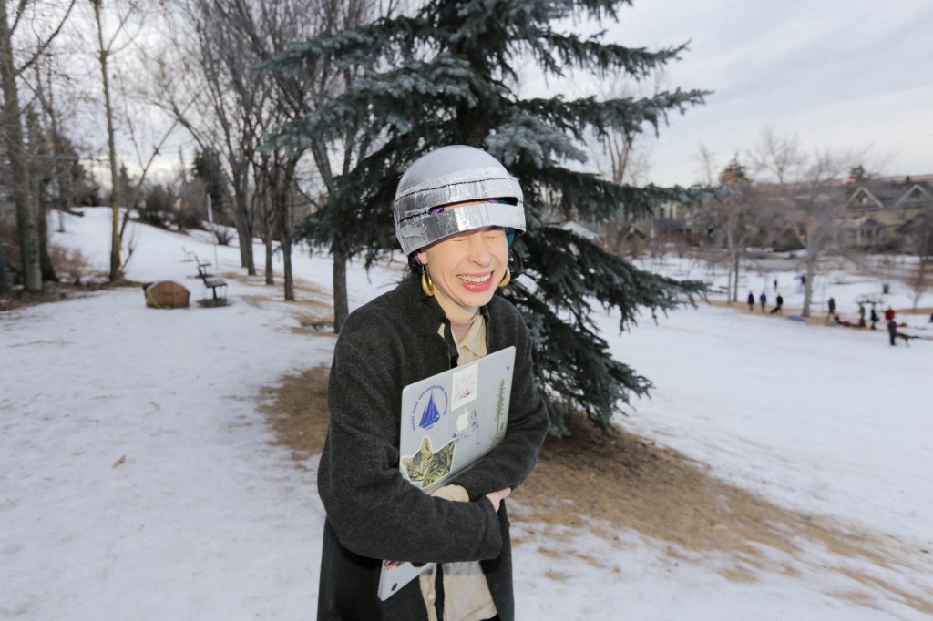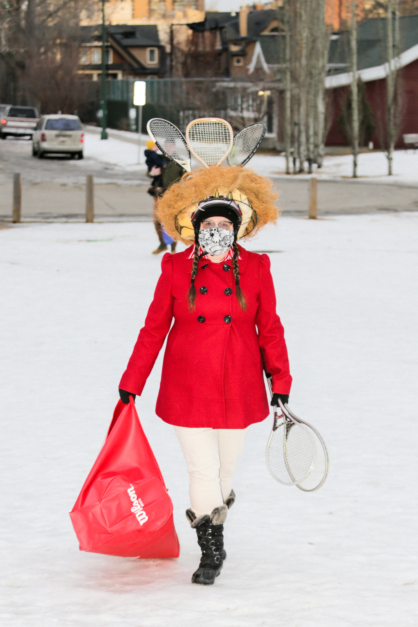 Maggie Schaefer and her stately tennis-bag sled and head-piece