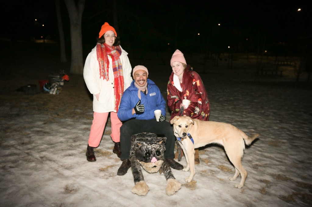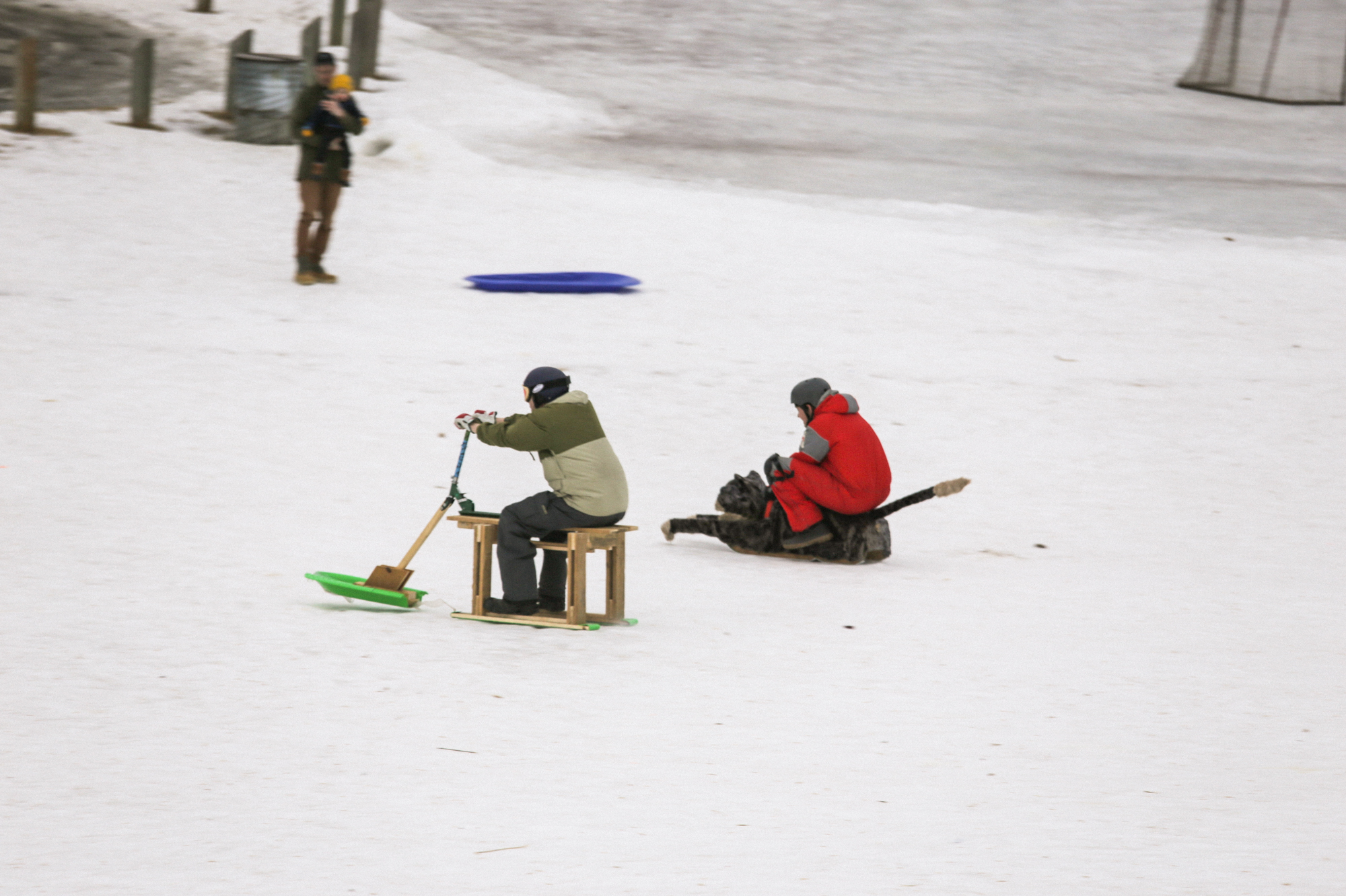 Various folks ride Desiree Nault’s tippy teacup sled!