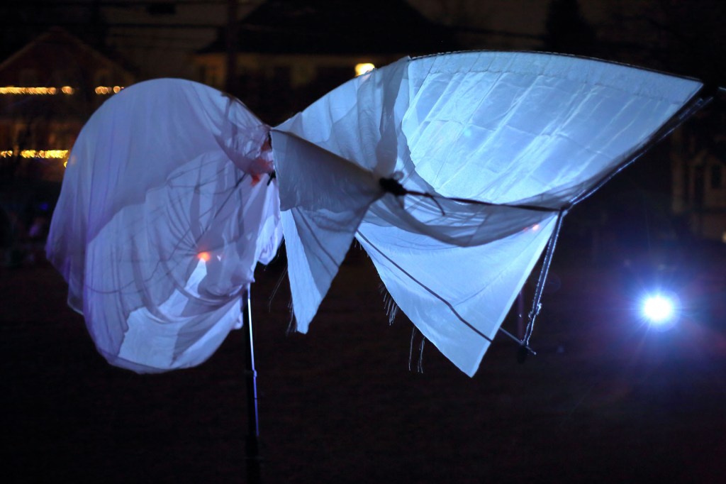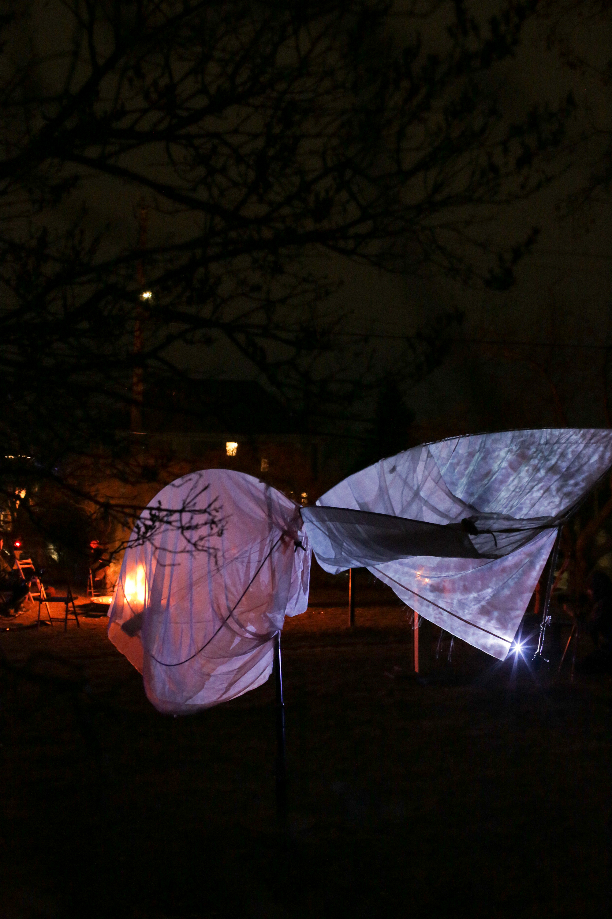 The duo’s work evolved over the weekend, growing in shape and feel as they constructed a kinetic soft sculpture from fabric and tent-poles.
