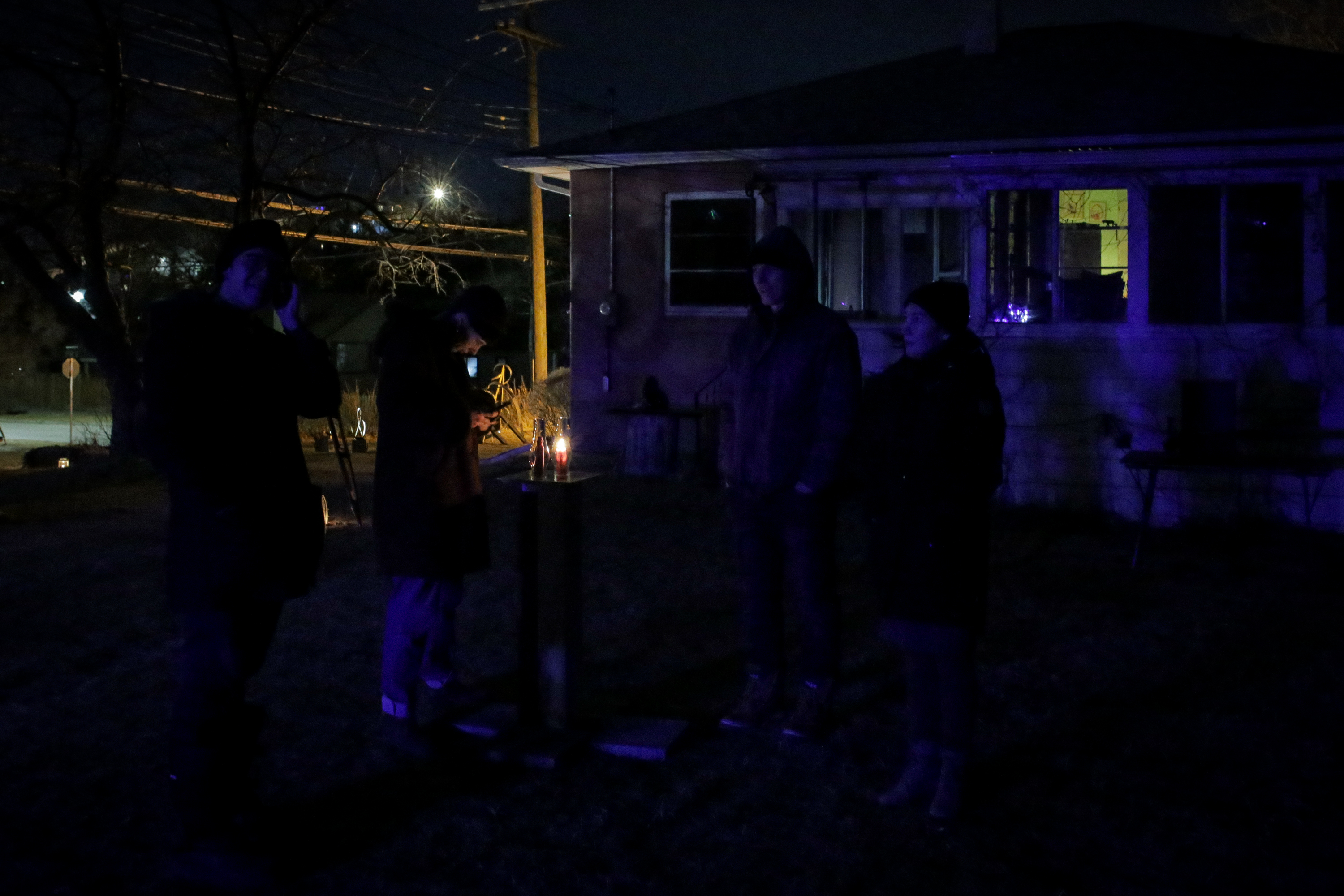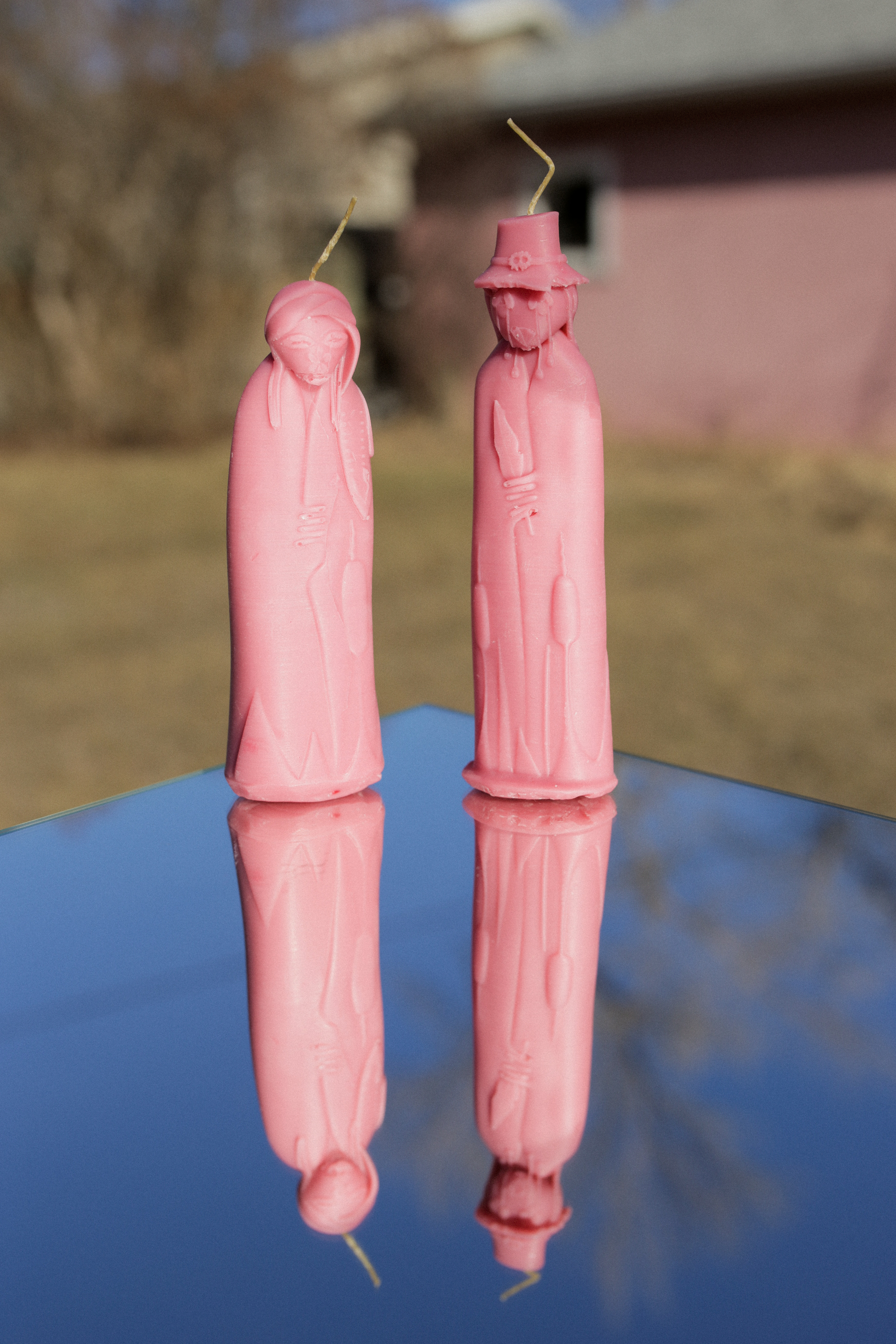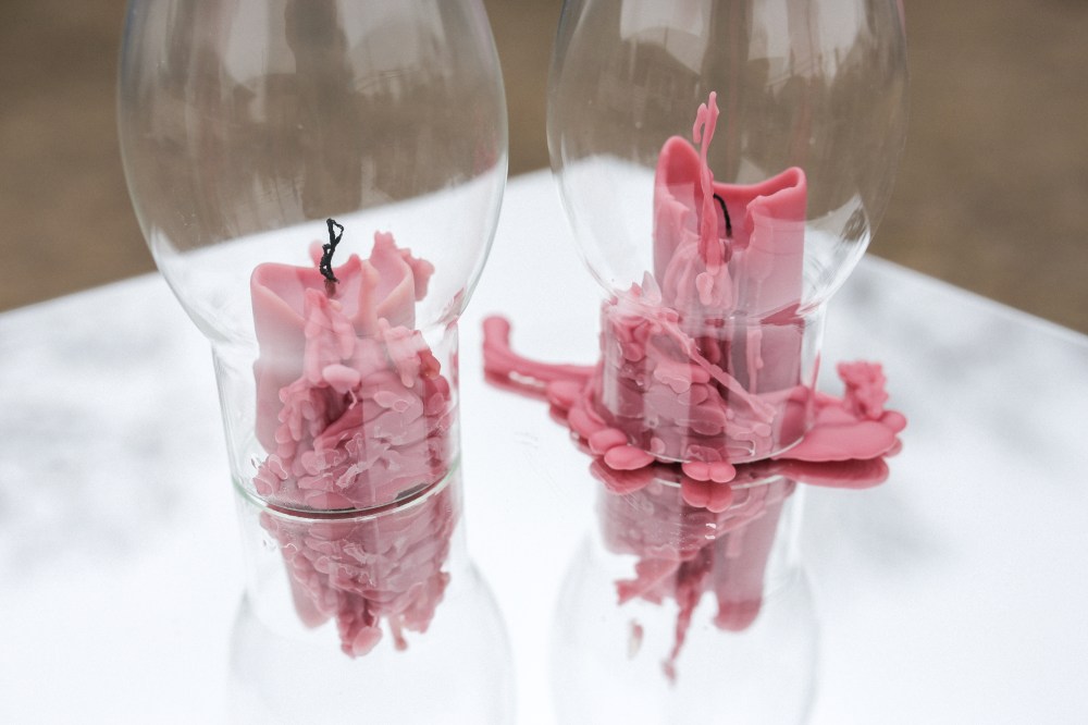 Each night, one of the figures was lit, and carefully enclosed behind a reappropriated oil lamp chimney. At the end of the weekend, only pink puddles of wax were left – utterly distorted from their original figurative forms.