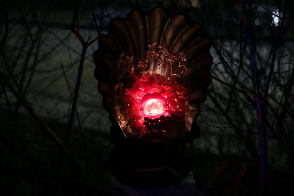 Rebecca Reid shared a hidden illuminated shrine, tucked unassumingly into a corner of the yard. The aptly timed Lupercalia Light shone from the lilac bushes in a red yawn fit for Eros.