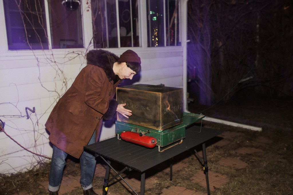 Logan Lape made a sculpture constructed around a Coleman camp stove. A metal box straddled low blue flames, with plasma cut-out letters reading “Warming.”