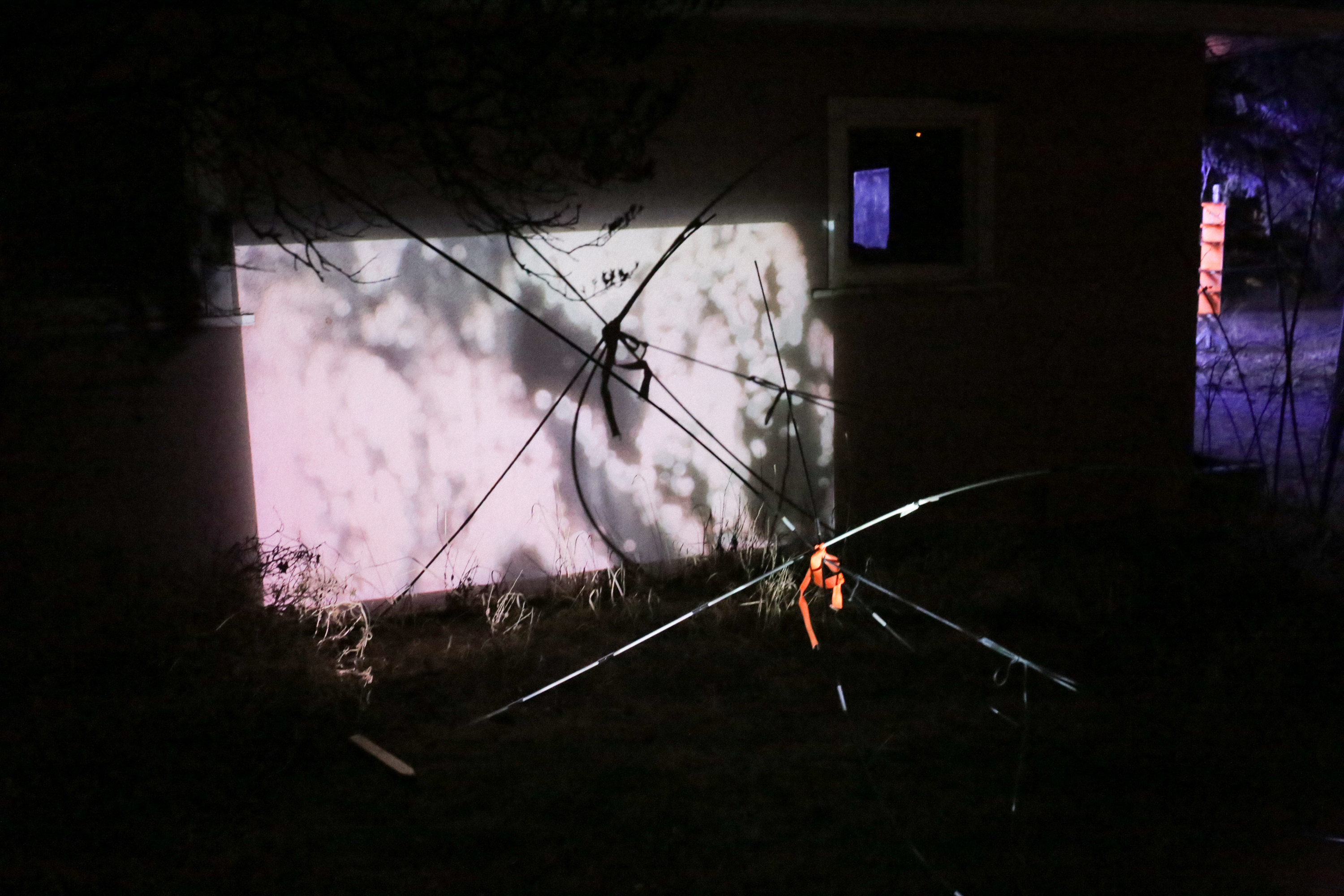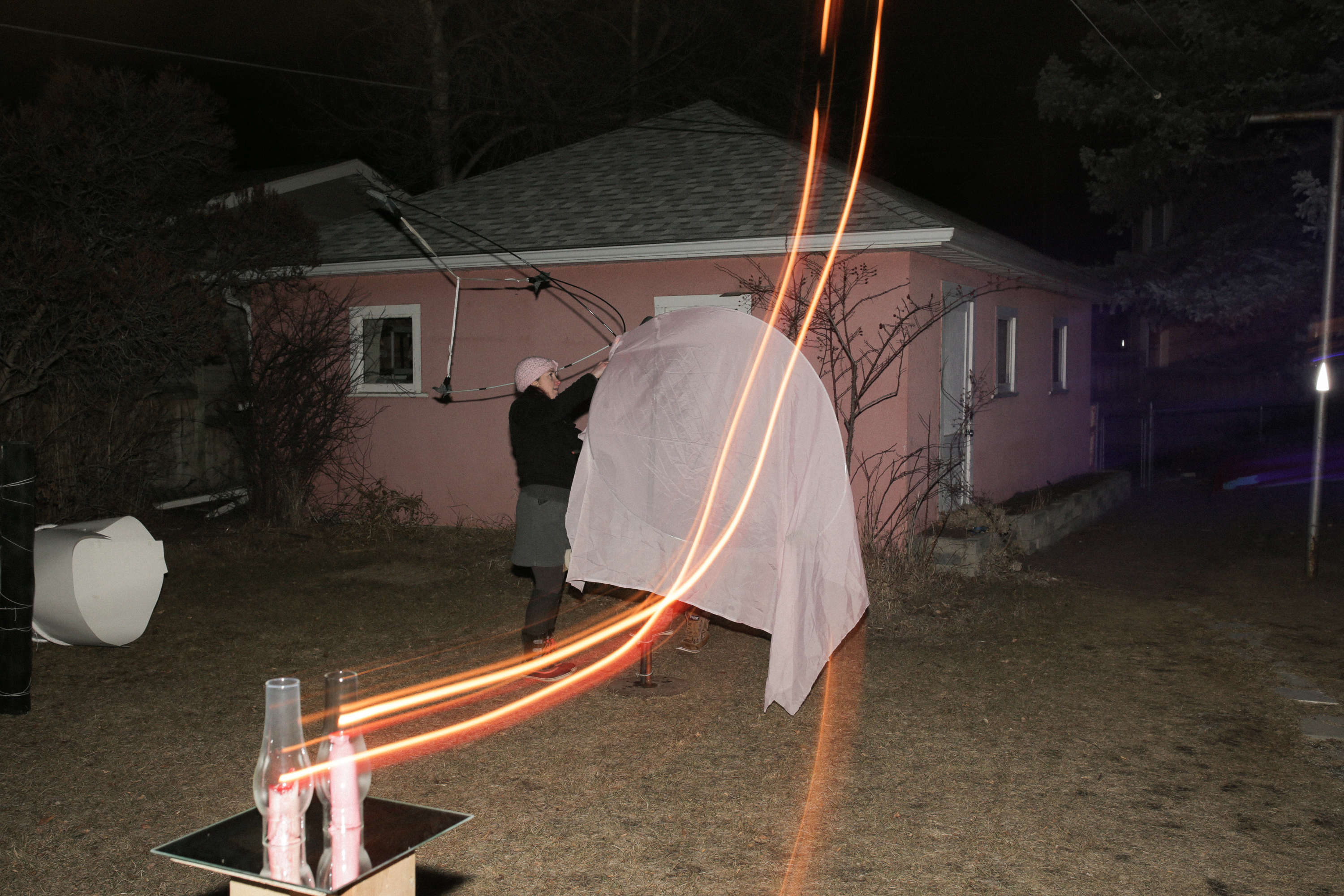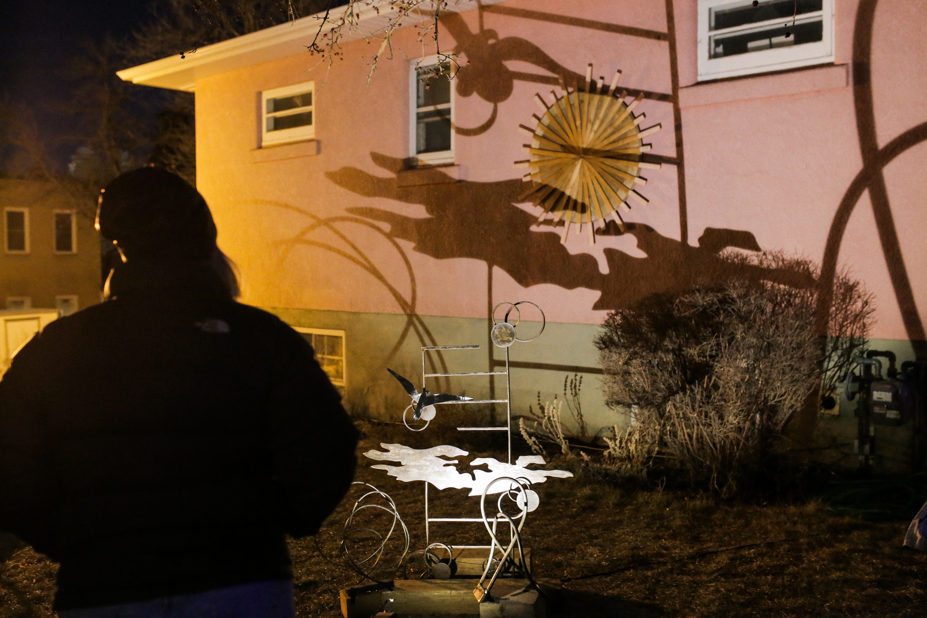 Joanne MacDonald played with shadow projections on the side of the house, using her metal sculptures as silhouettes to cast broad, abstract shapes. The light transformed three-dimensional forms into two-dimensional projections, merging into a single image washing across the pink facade.