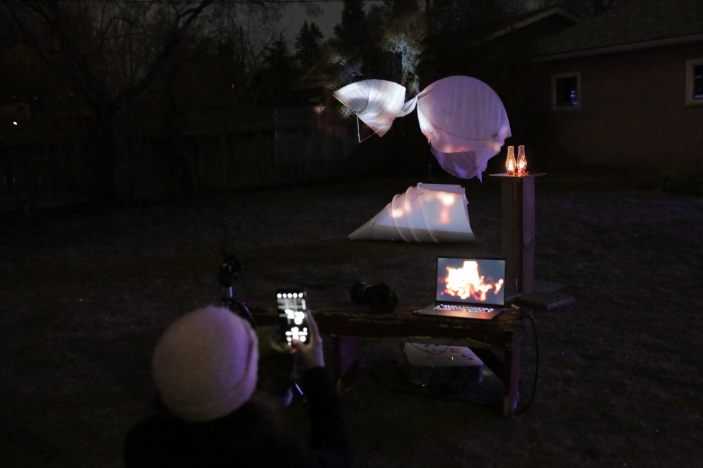 Noel and Jennifer’s final experiment was a projection of the nearby fire, captured by video and immediately projected back onto their sculptural work.