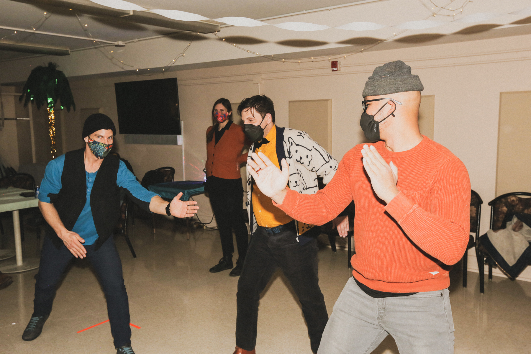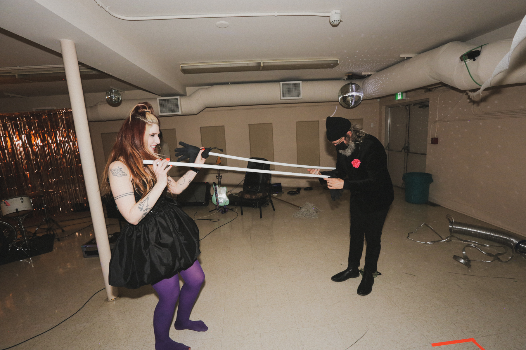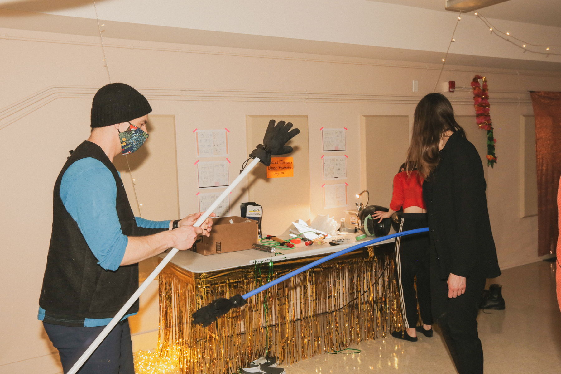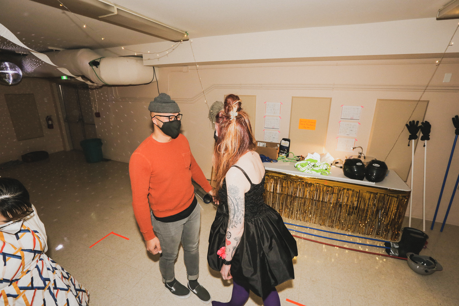 Dancers were invited to wear Social Distancing Dance Prosthetics (made by Desiree Nault & Caitlind Brown) as slow jams filled the community centre, taking participants on a ride through sentiment, nostalgia, and novel delights.
