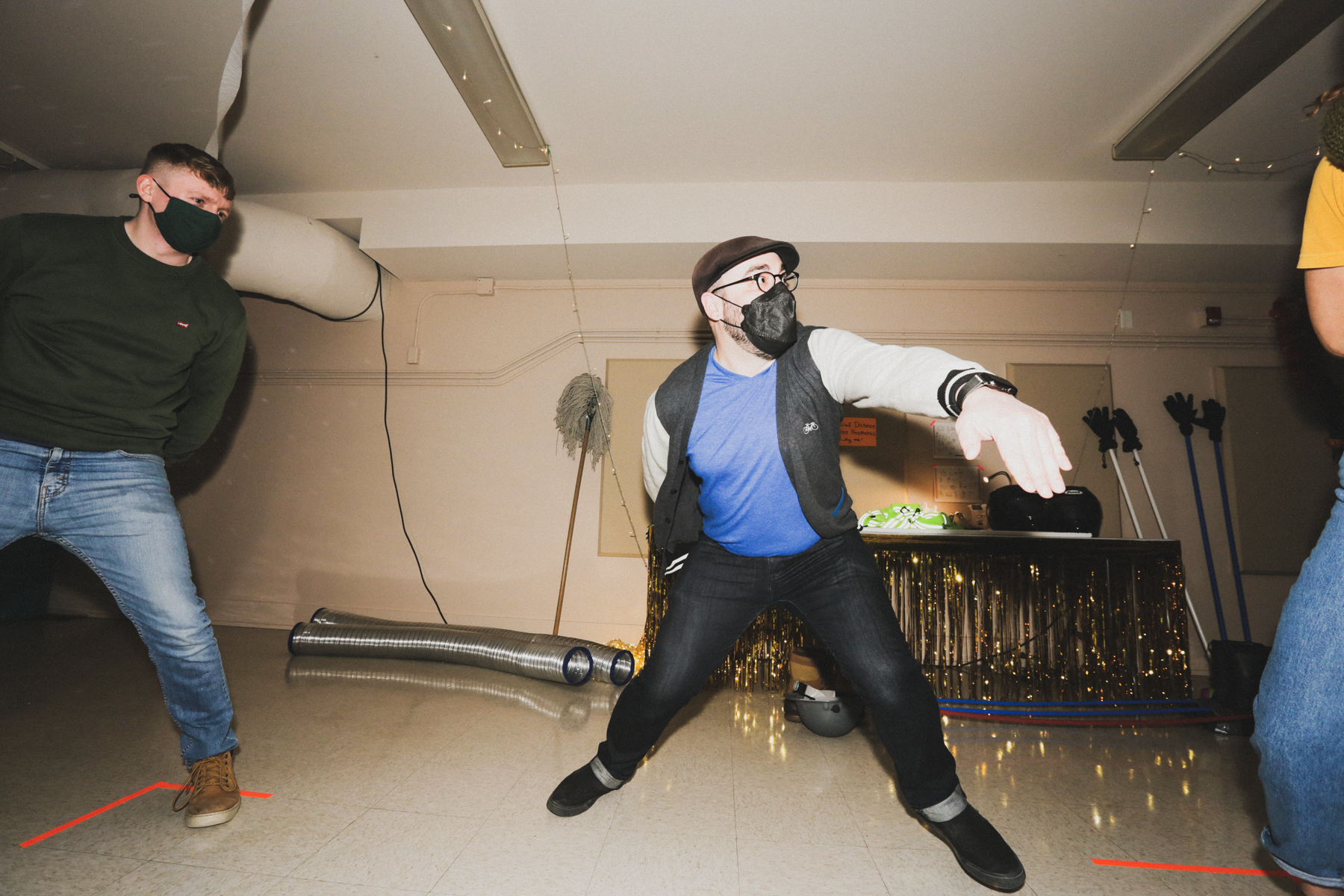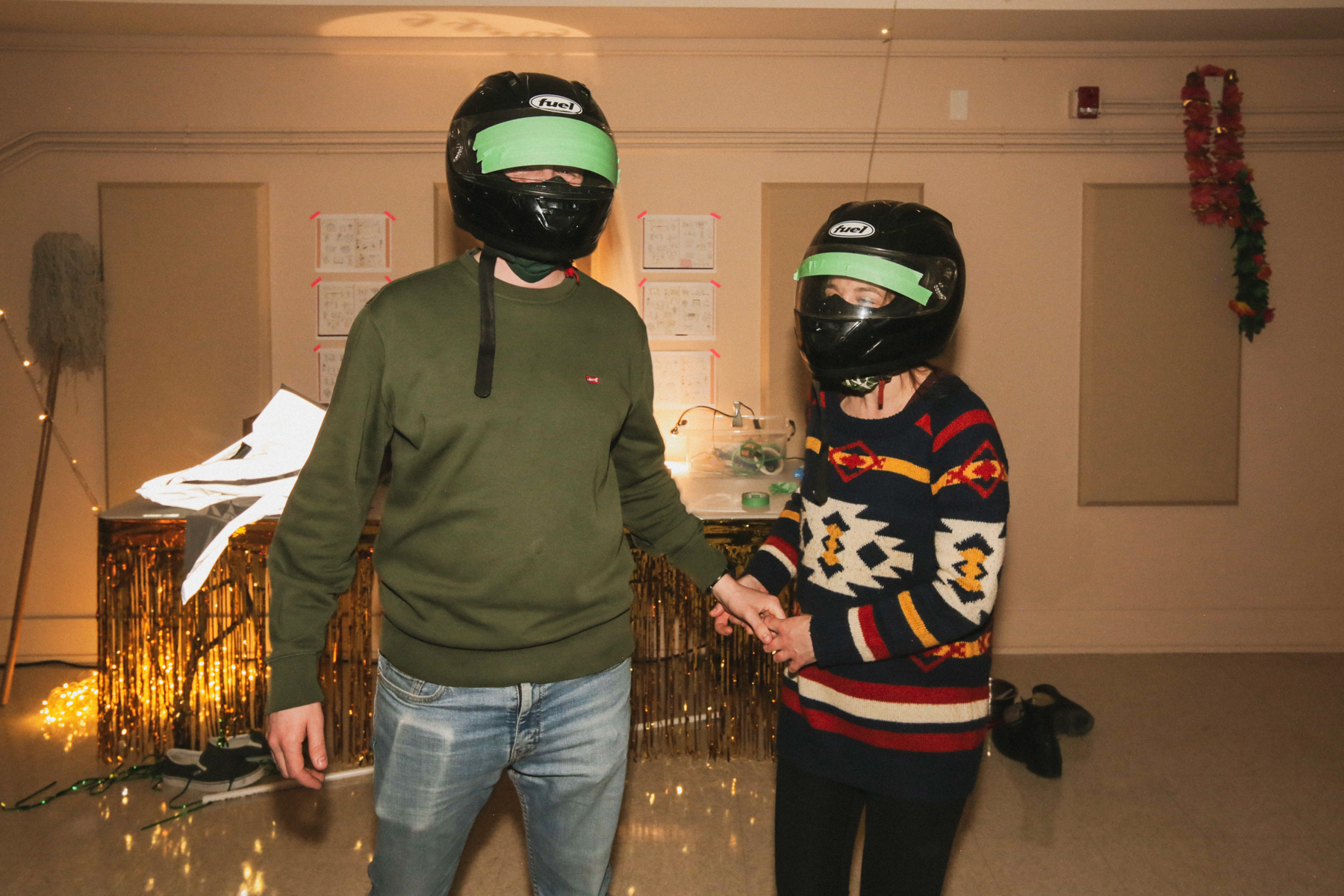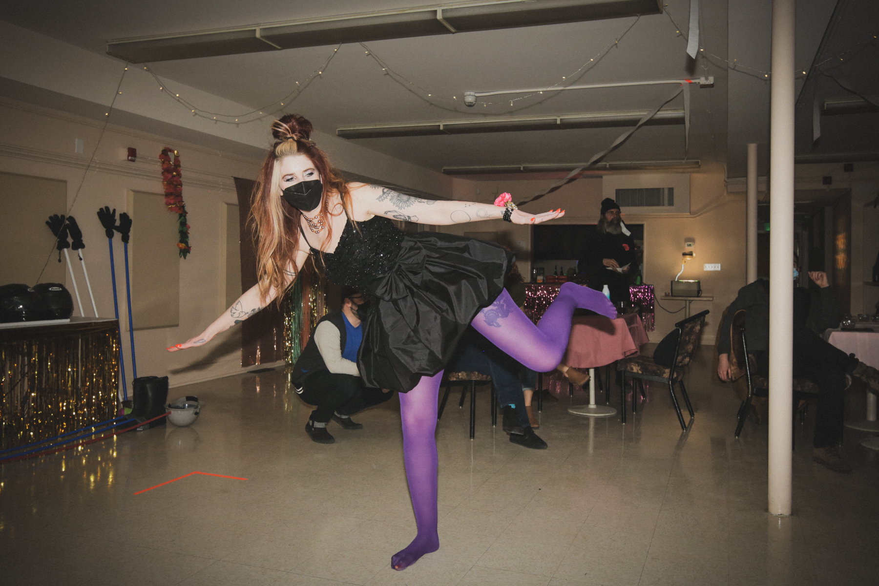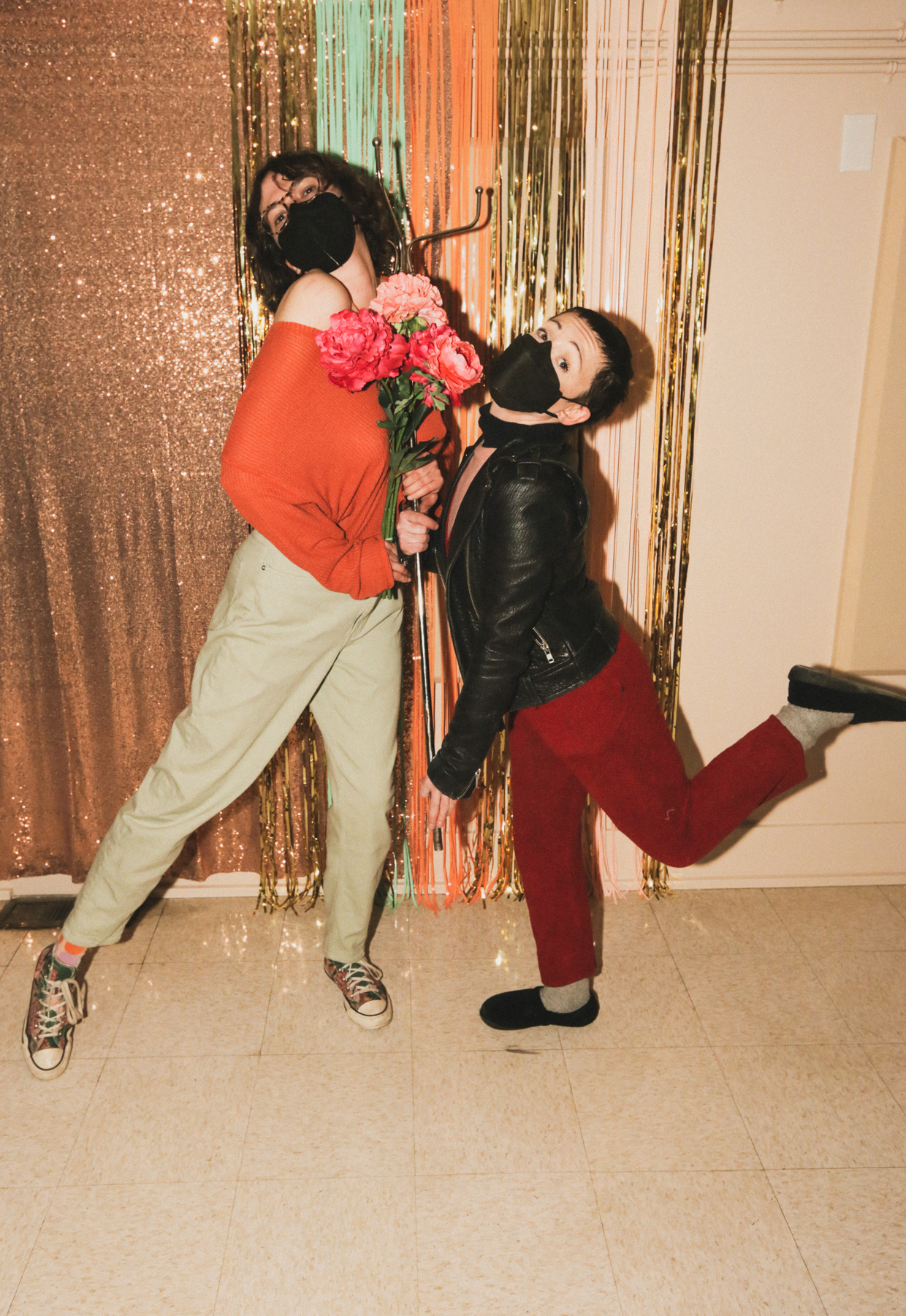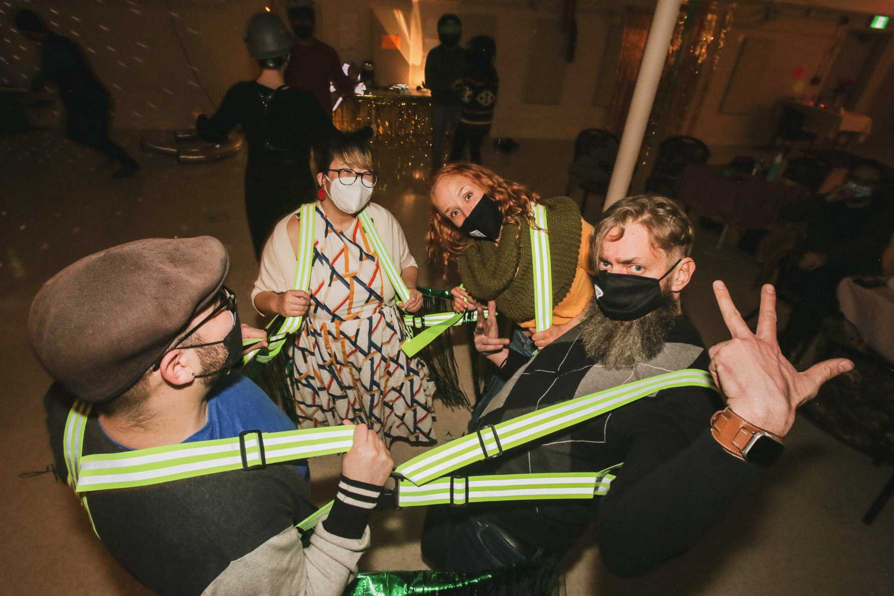 Dancers were invited to wear Social Distancing Dance Prosthetics (made by Desiree Nault & Caitlind Brown) as slow jams filled the community centre, taking participants on a ride through sentiment, nostalgia, and novel delights.