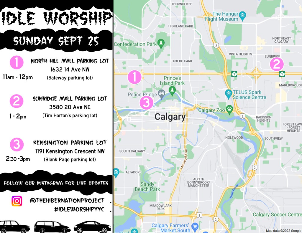 IDLE WORSHIP is a mobile exhibition of art & performance in trunks, back seats, box trucks, minivans, and automobiles, designed specifically for the mundane context of parking lots across the greater Calgary/Mohkinstsis area. Subverting the car-centric culture of Alberta, IDLE WORSHIP utilizes the “non-site site” offered by the interior of 9 artist-driven cars; each vehicle becomes a micro-gallery to propel contemporary art into oft neglected corners of Calgary, including stops in all four quadrants of the city. Travelling in a law-abiding motorcade, the exhibition becomes a slow rally from familiar place to place, traversing the Calgary landscape as so many commuters do daily – but with an utterly different intention. Pithy and playful, IDLE WORSHIP is equal parts community project, commentary, and intervention in plain sight.