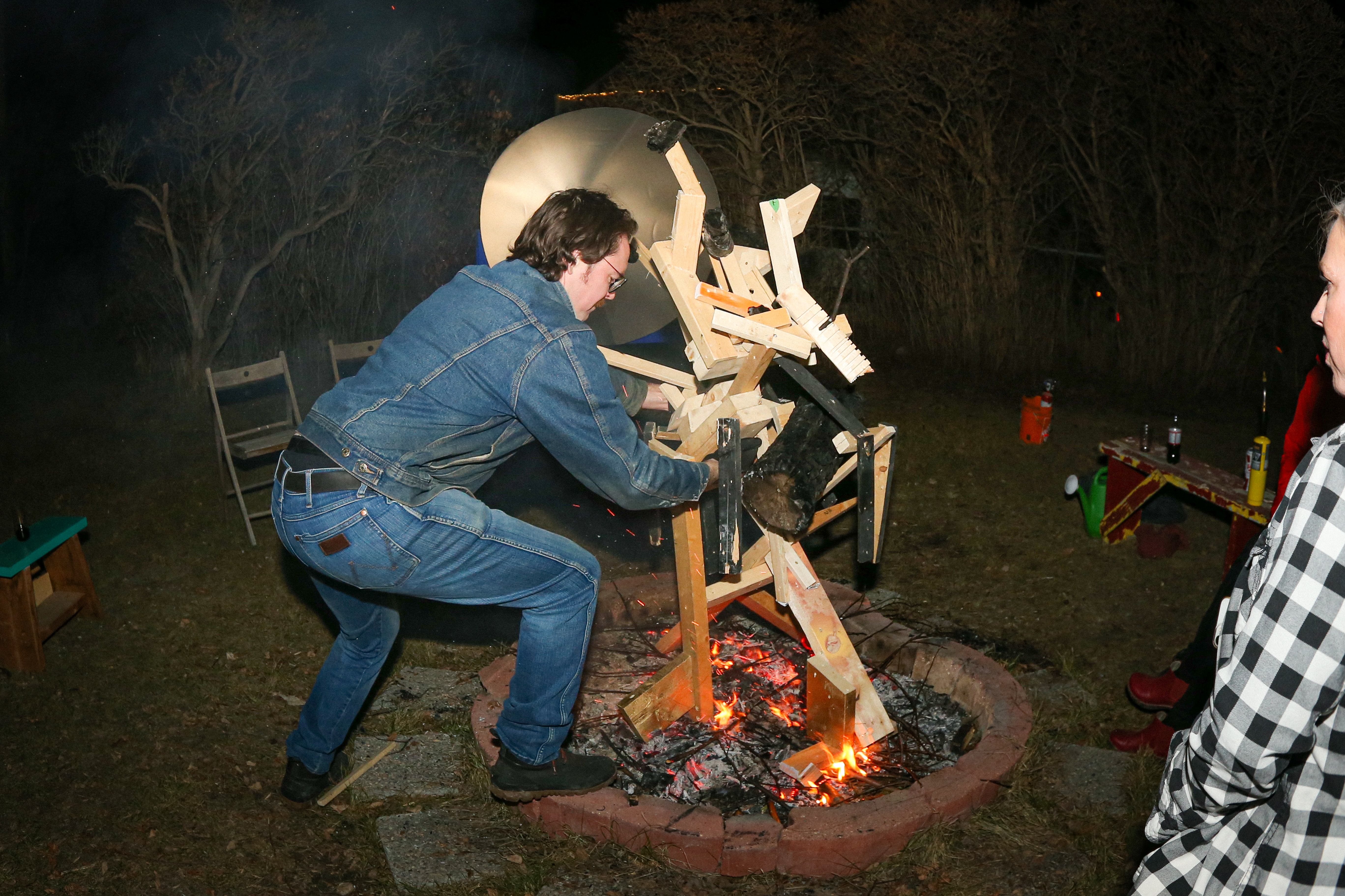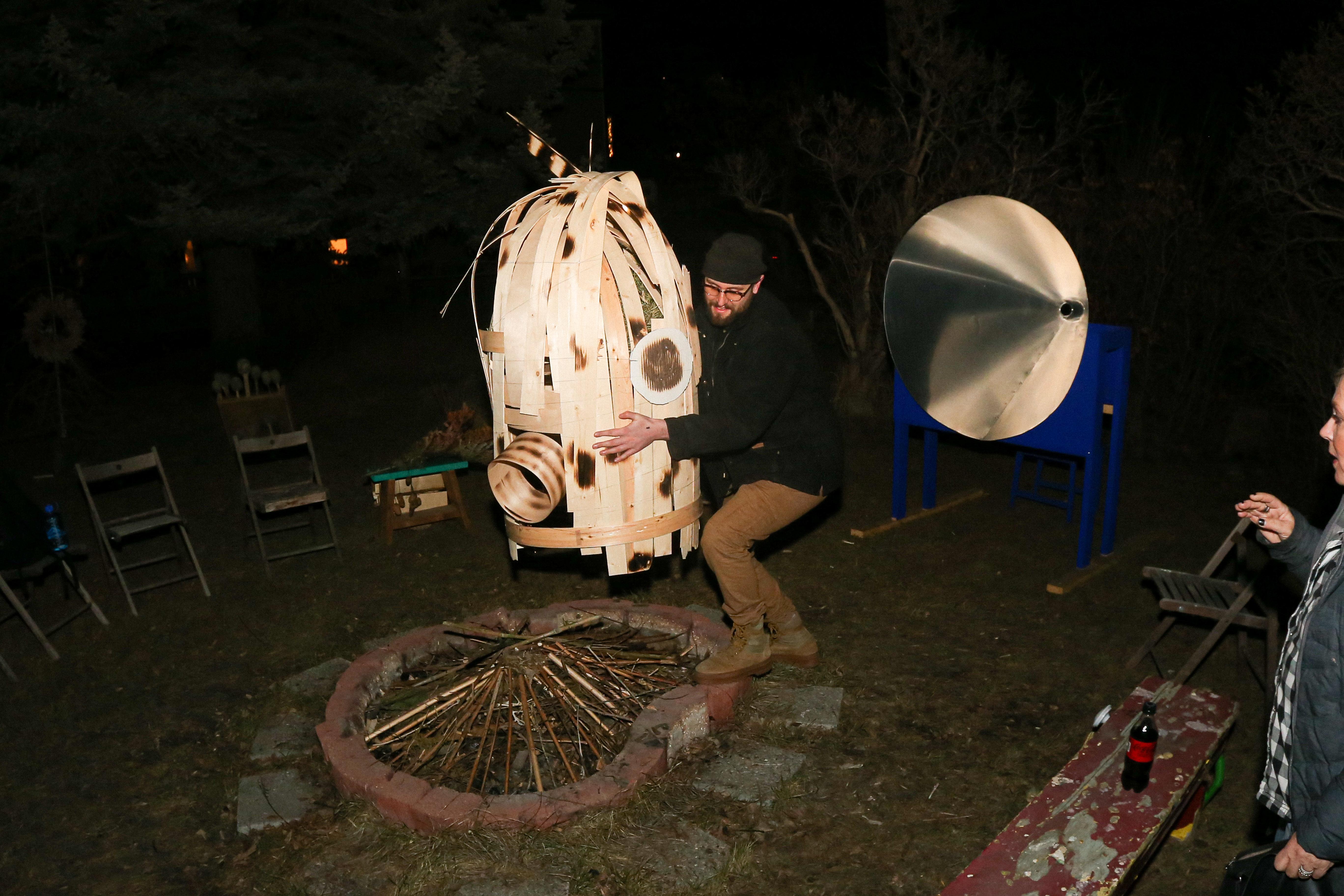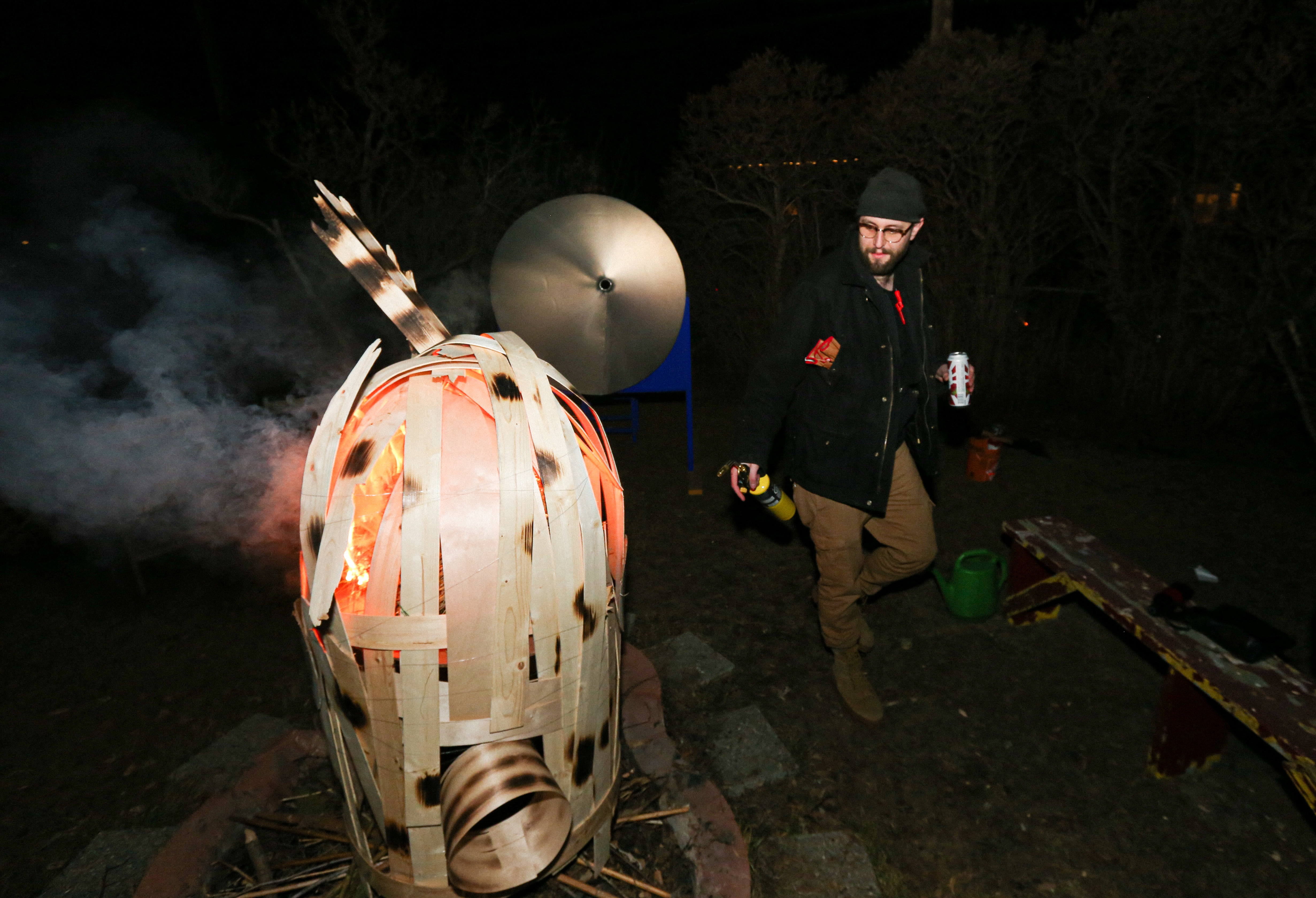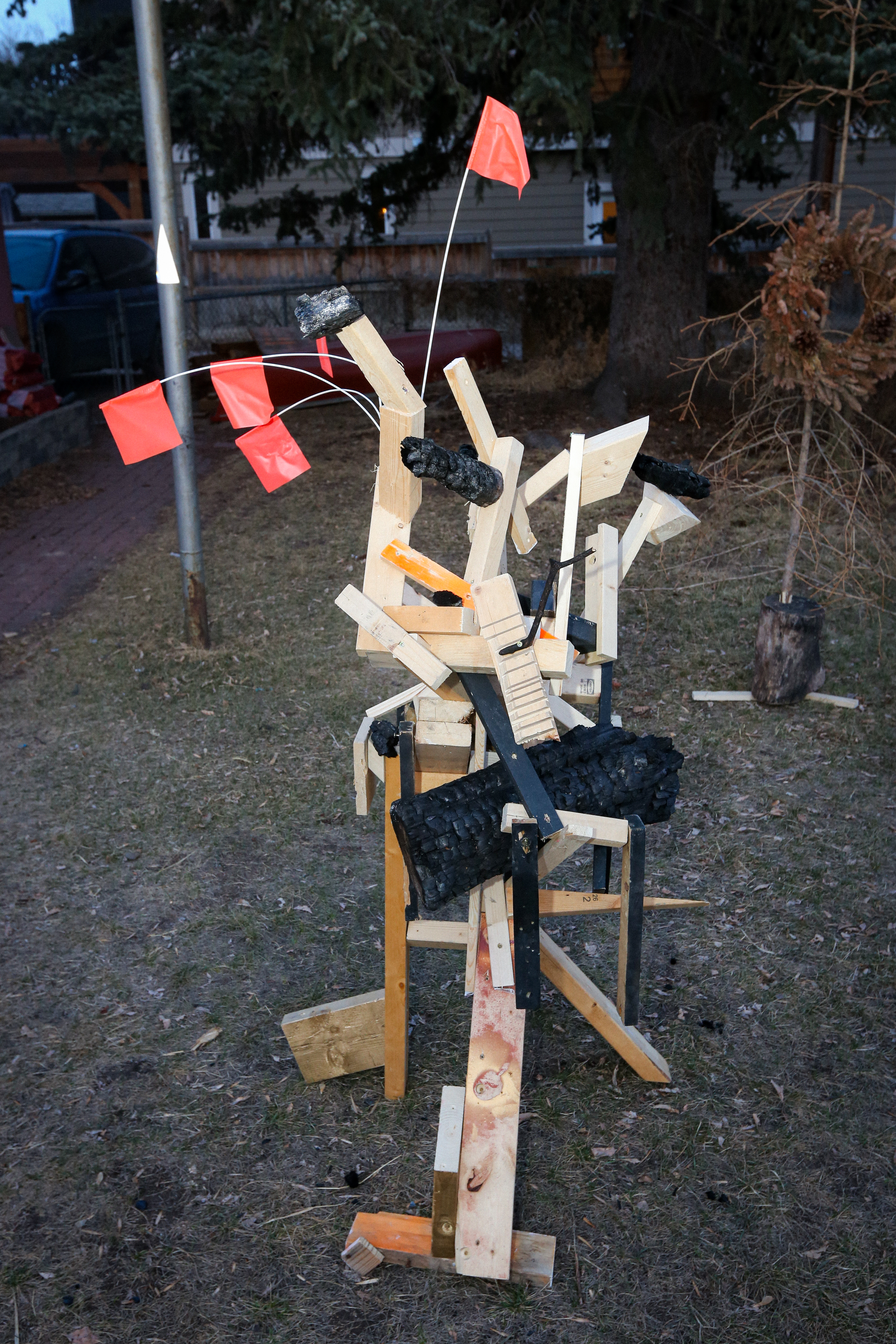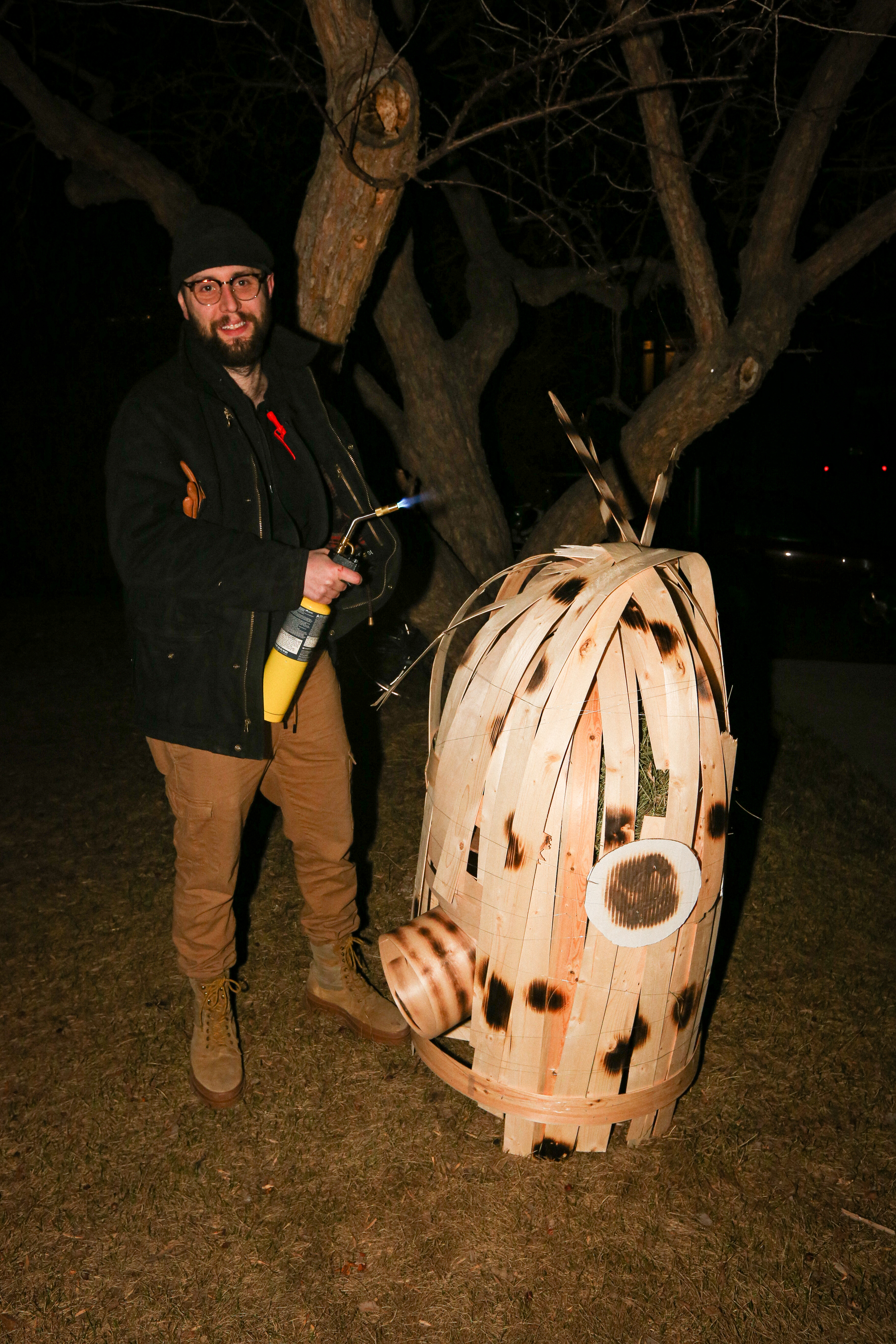 Tiff Polancec kicked off the sculpture burn with a fast-burning self portrait made from bent and scorched wood.