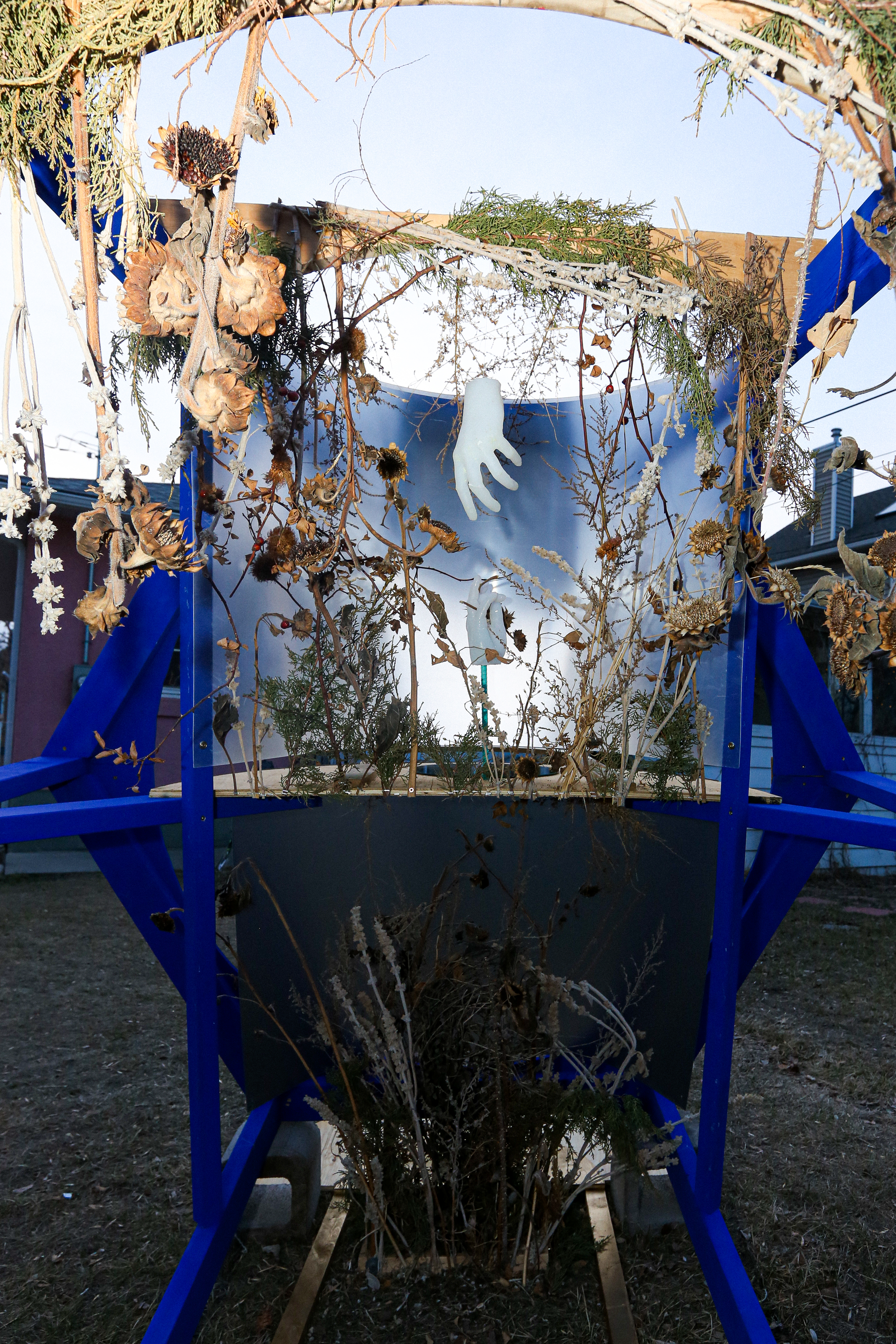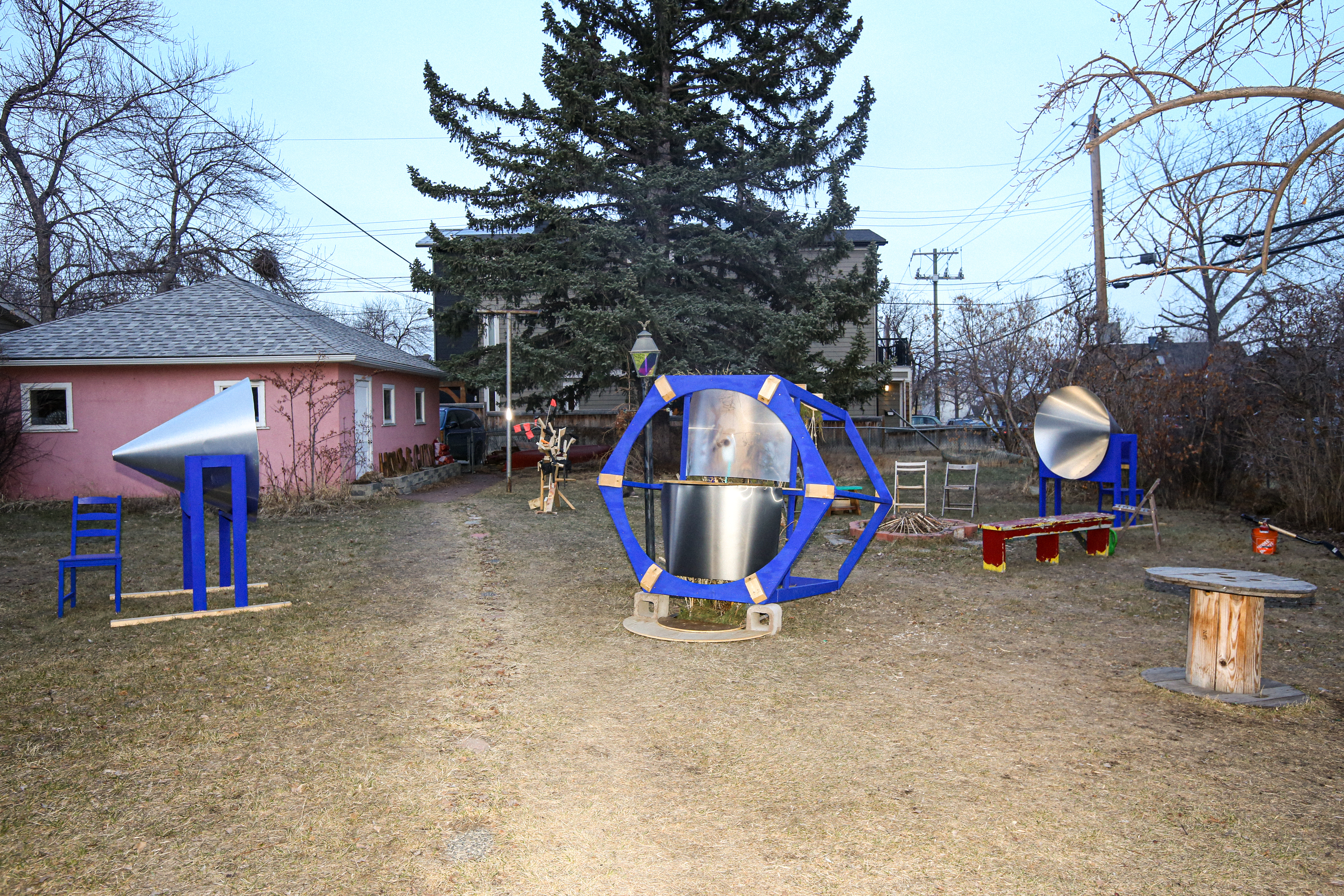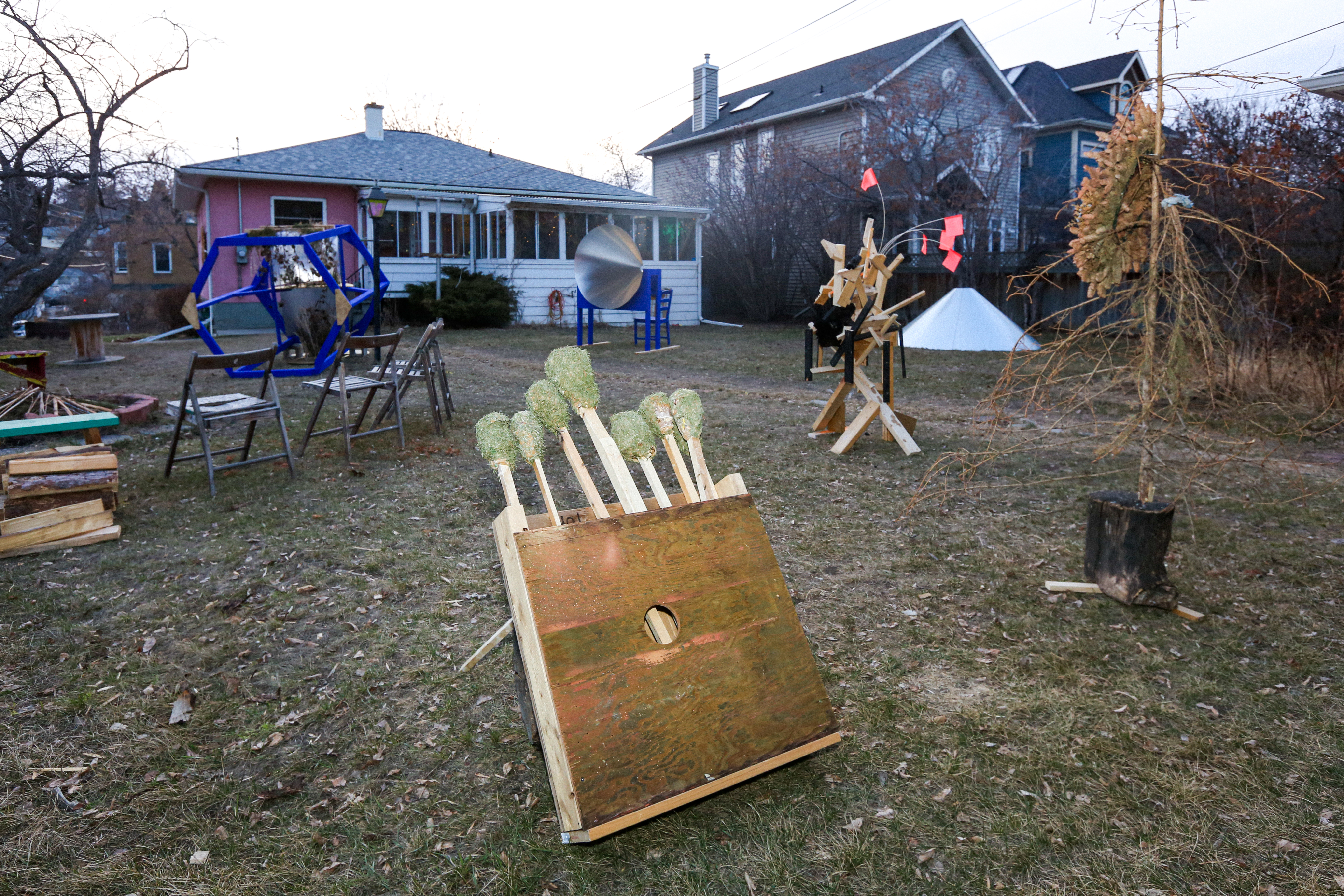 An accumulation of burnable sculptures and listening devices in the yard before GATHER BY FIRE.