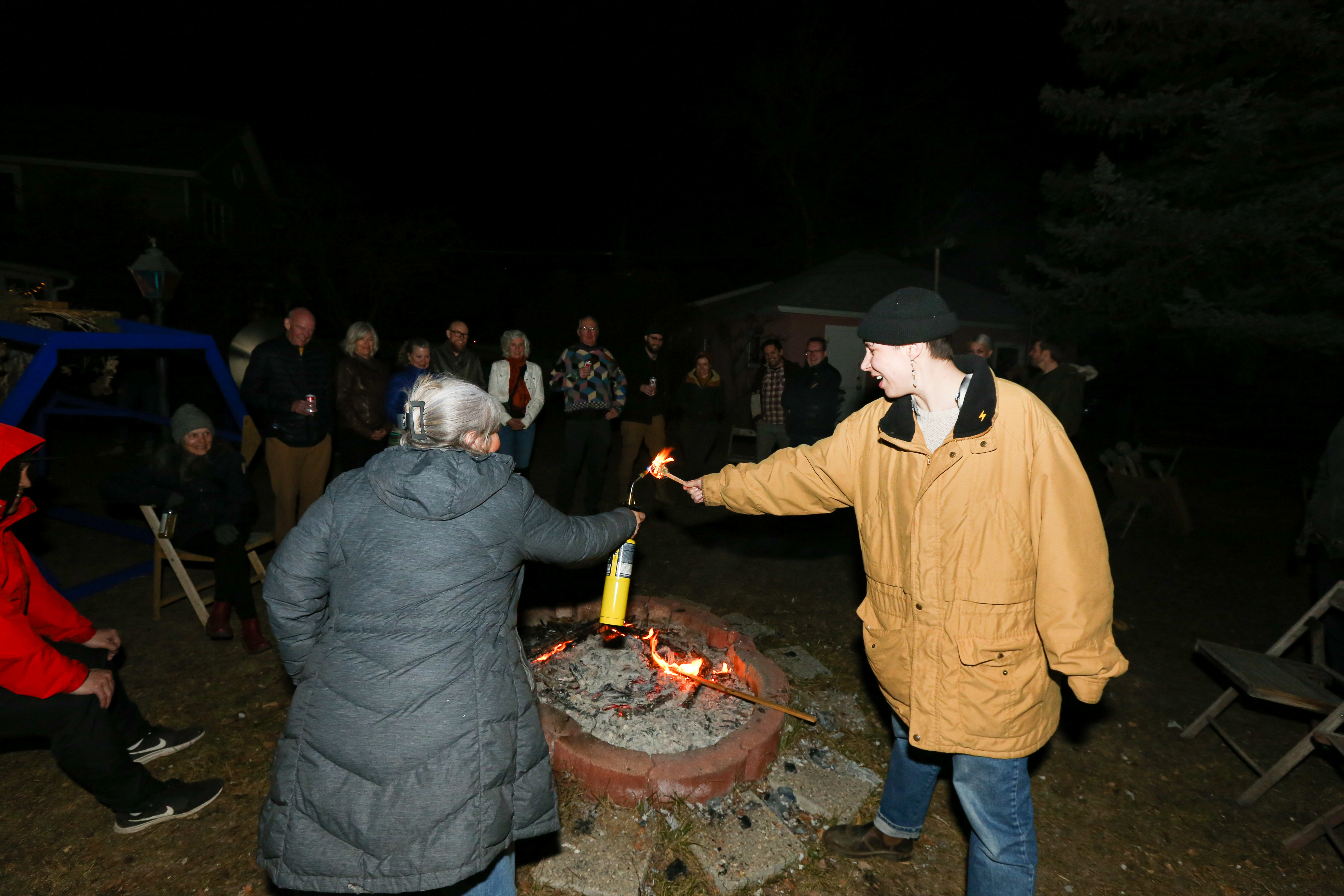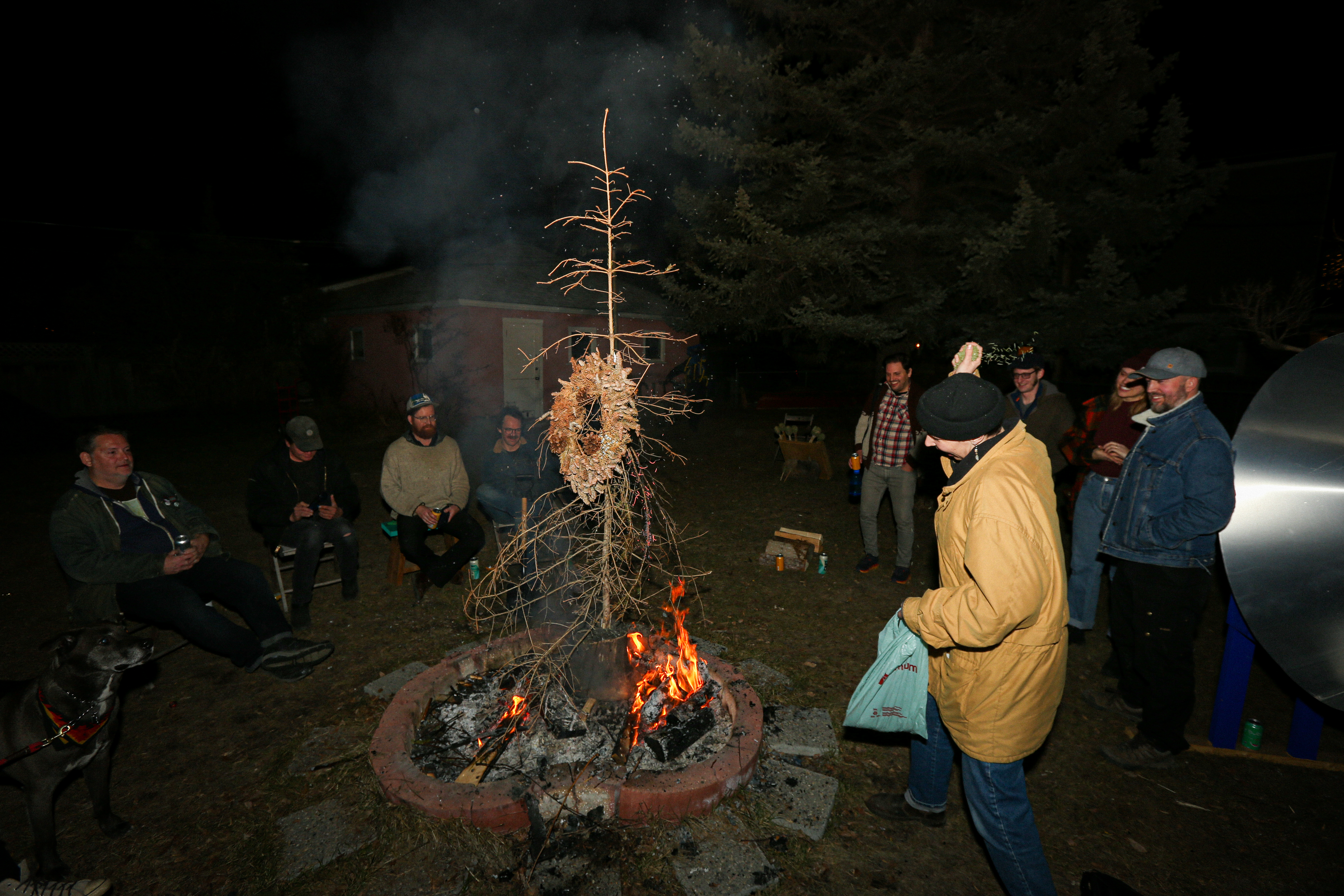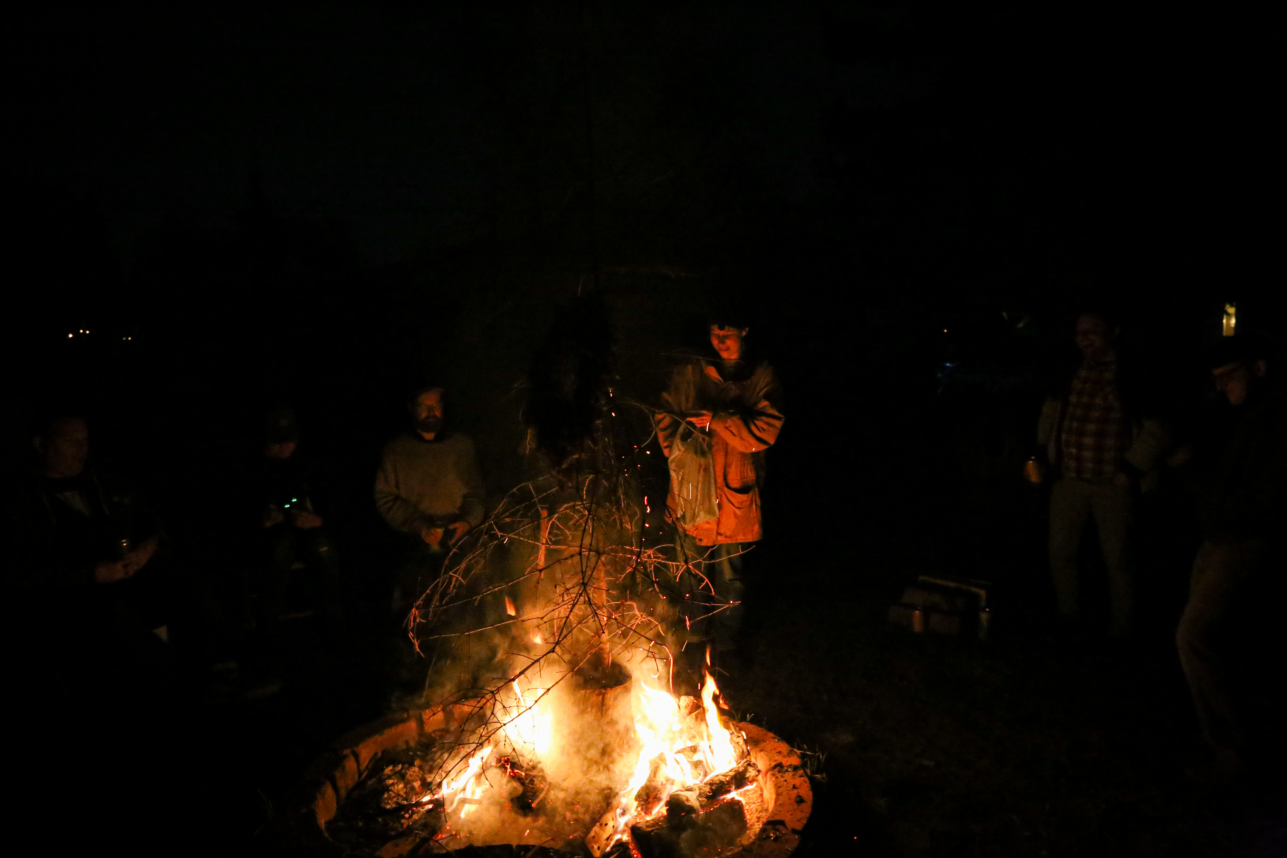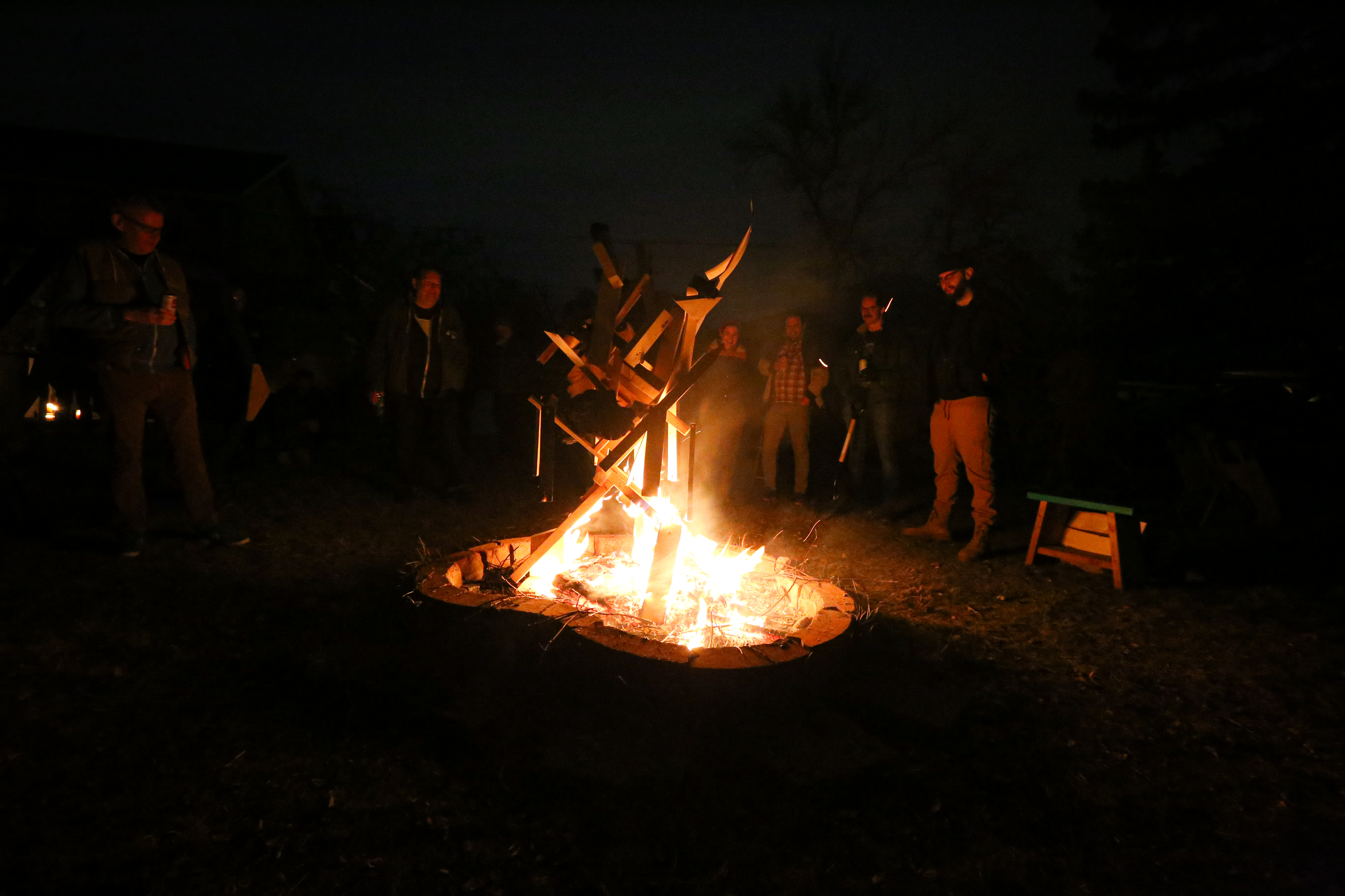 Joanne & Jonathan MacDonald built a sculpture from pruned branches. They invited fireside friends to write short notes to dead loved ones and “post” the notes inside the piece as it burned.