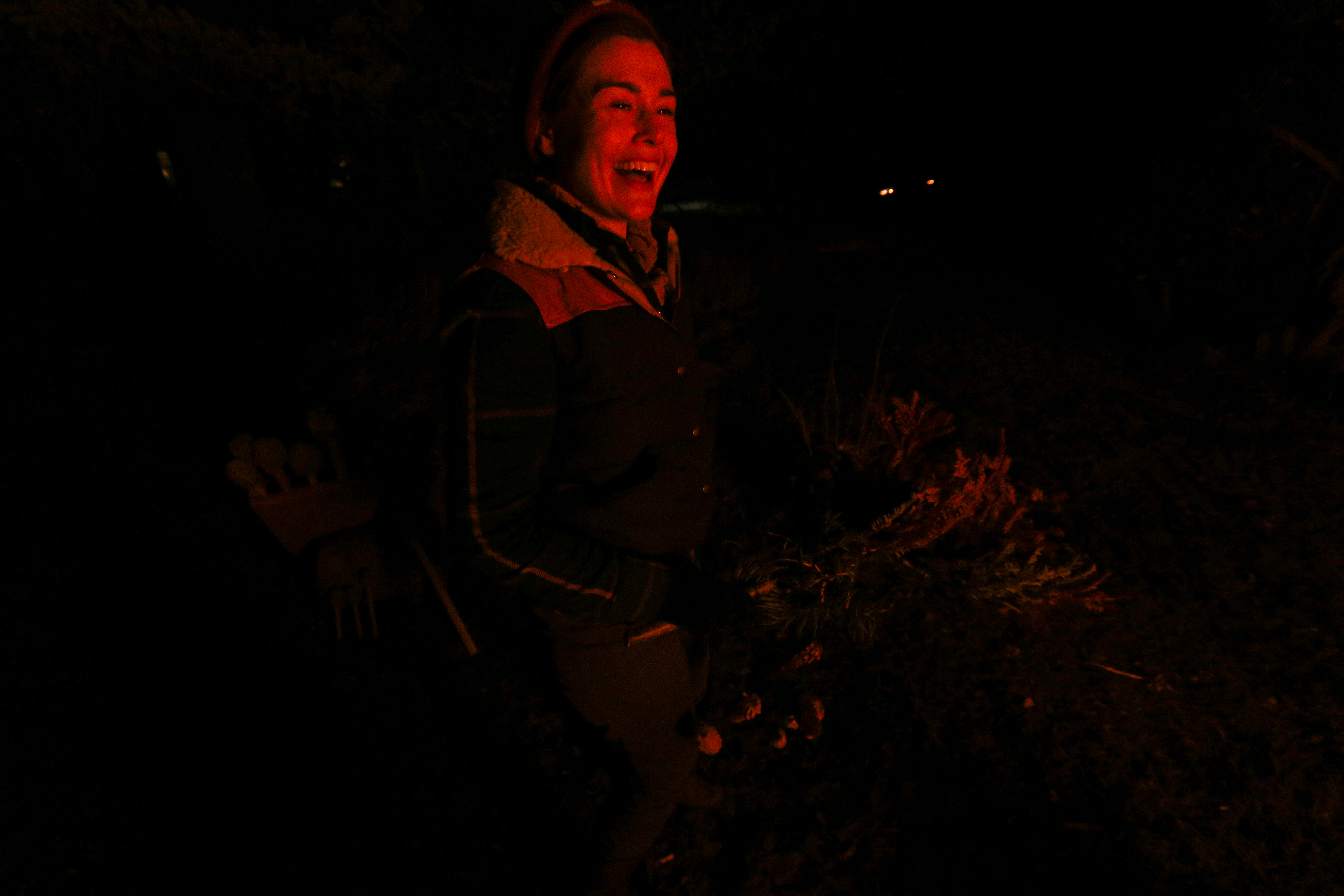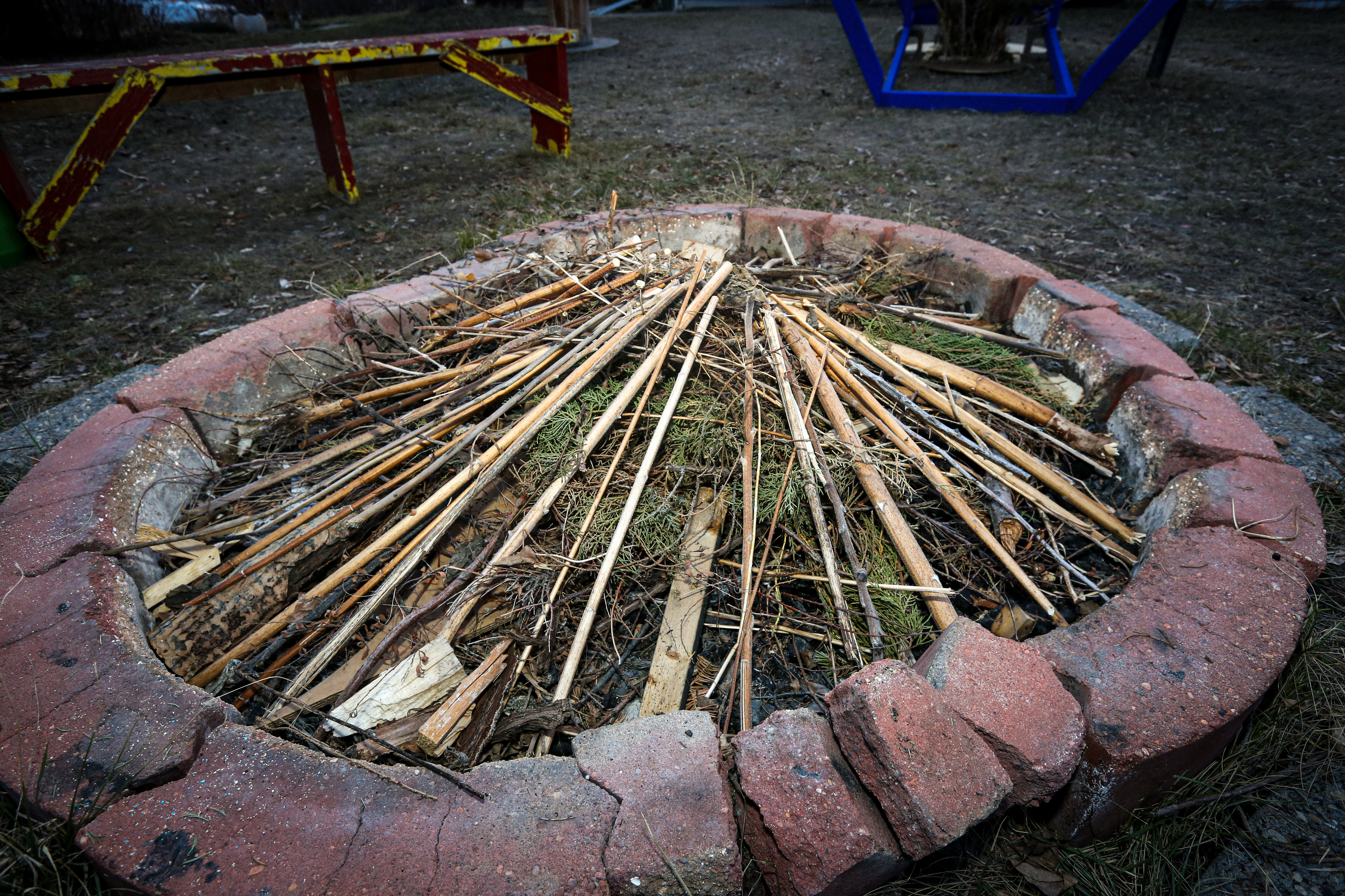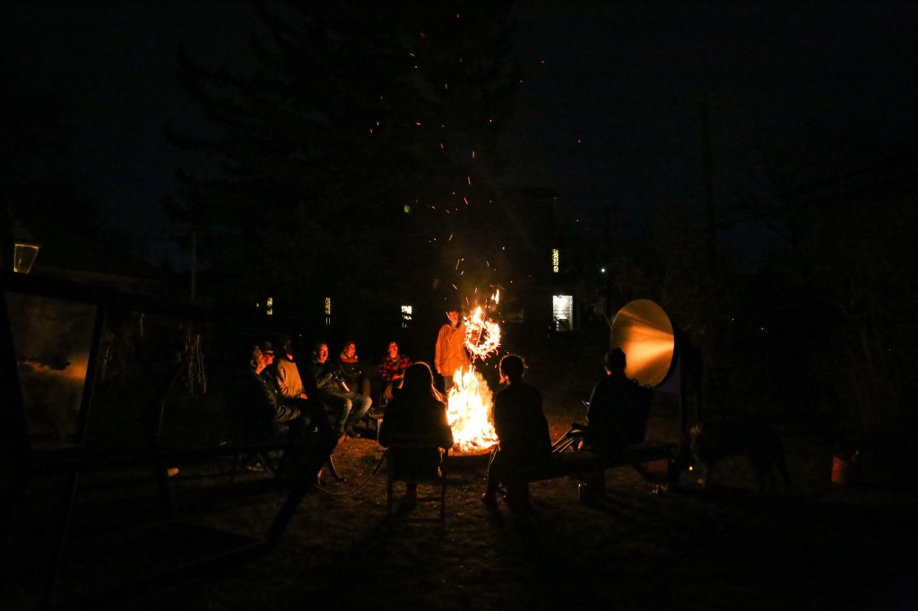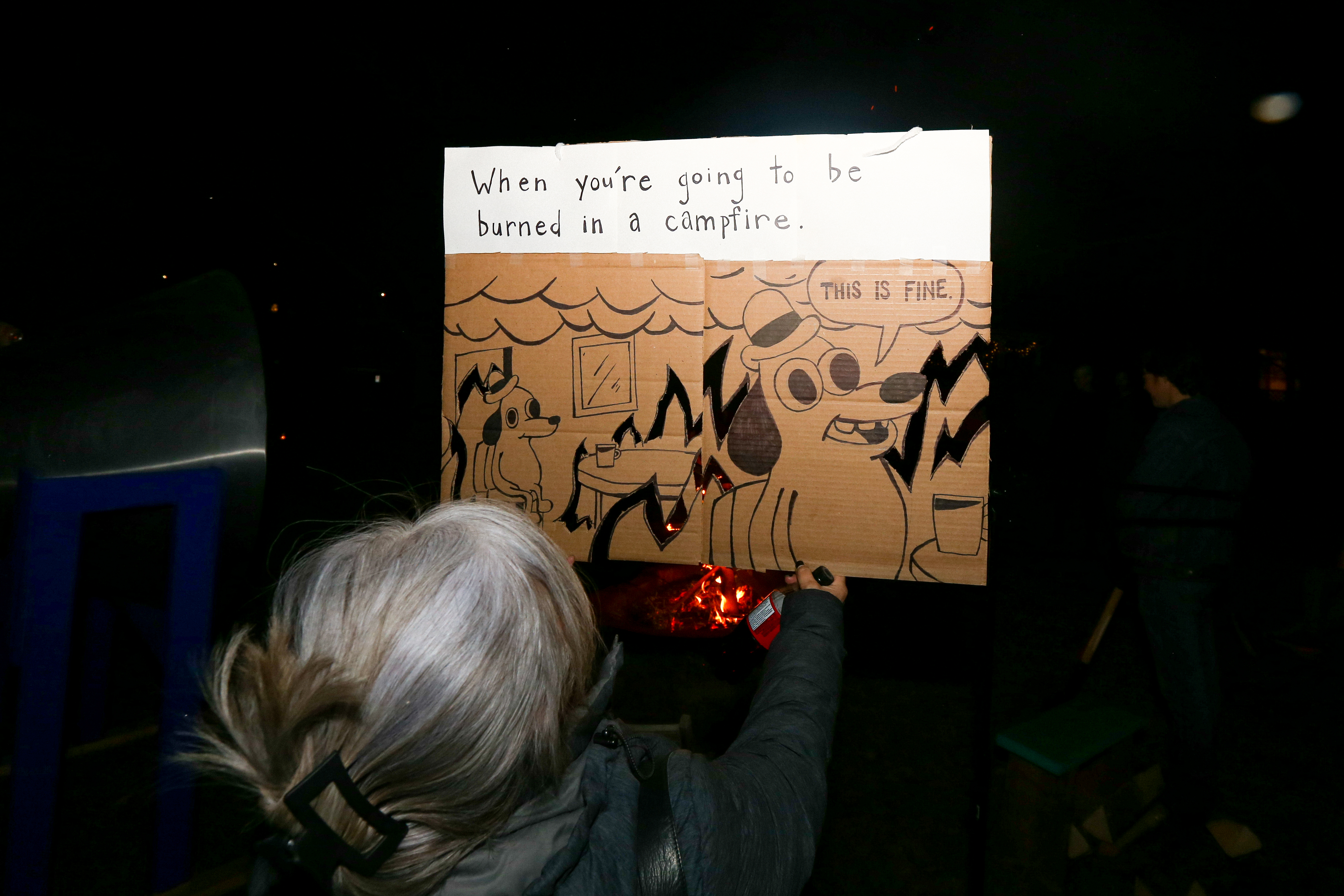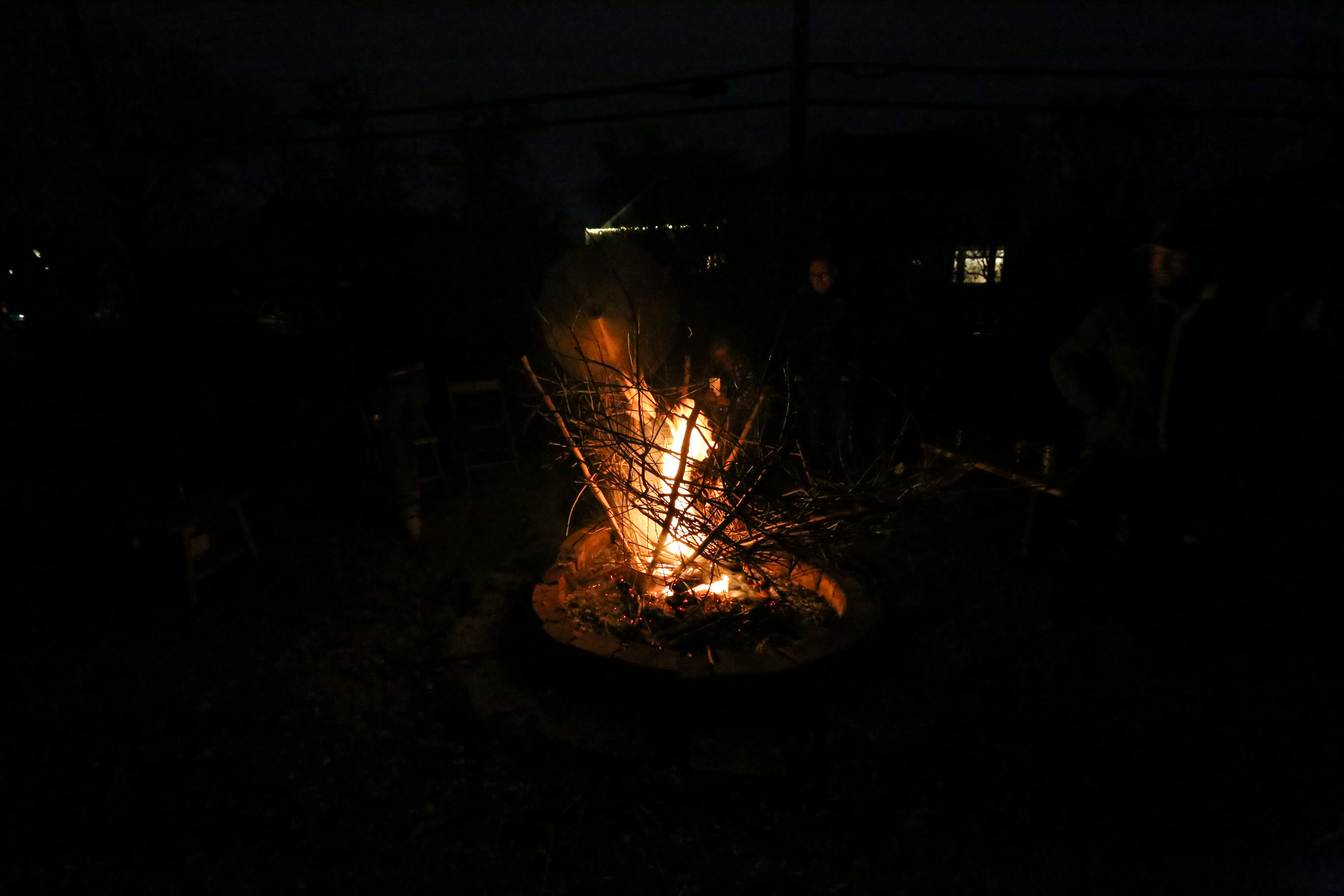Joanne & Jonathan MacDonald built a sculpture from pruned branches. They invited fireside friends to write short notes to dead loved ones and “post” the notes inside the piece as it burned.