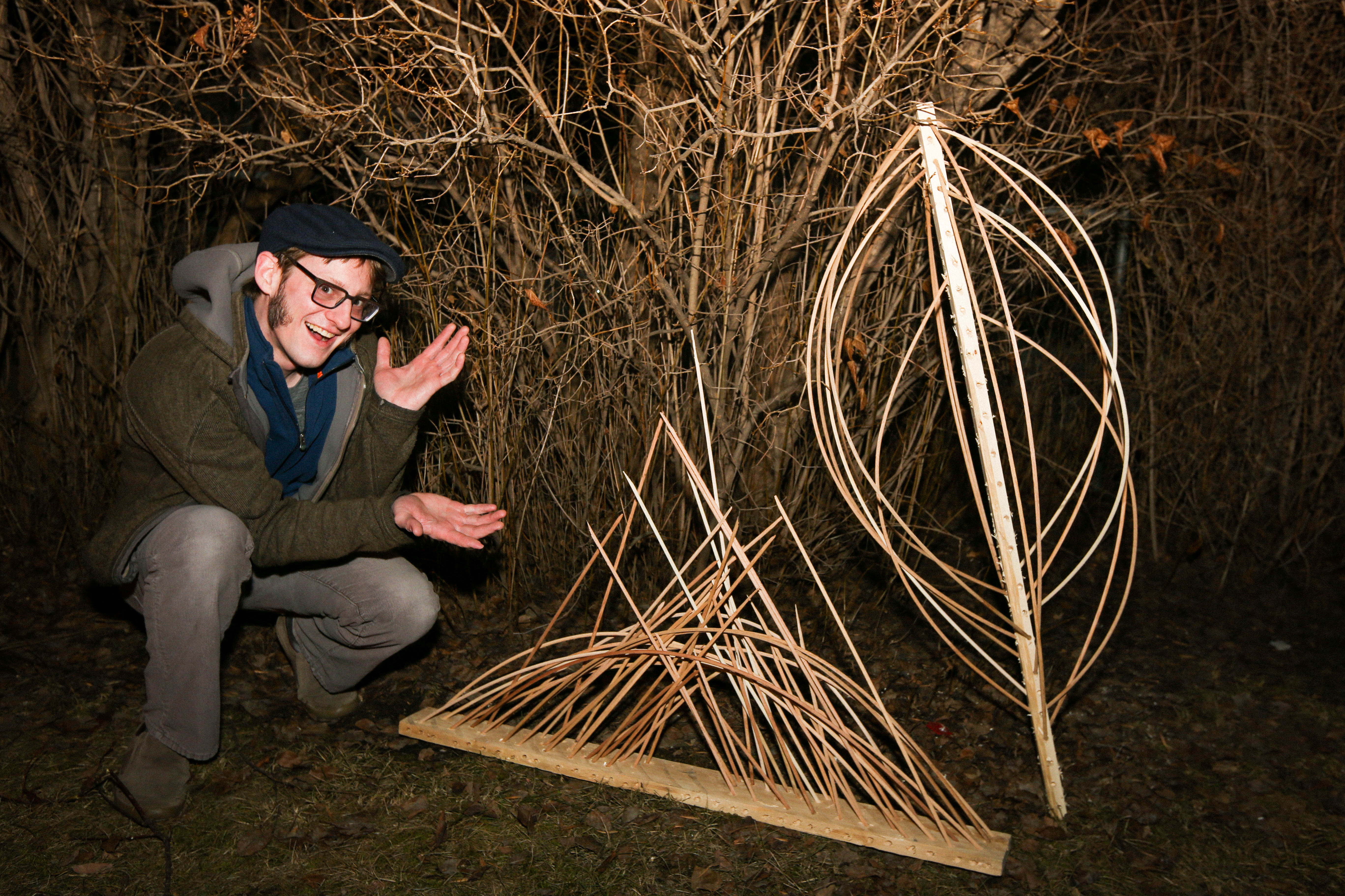 Daniel Barossa shared two wooden artworks, flex-fit and held together under pressure. The thin wood snapped as it burned, releasing the tension held inside it.
