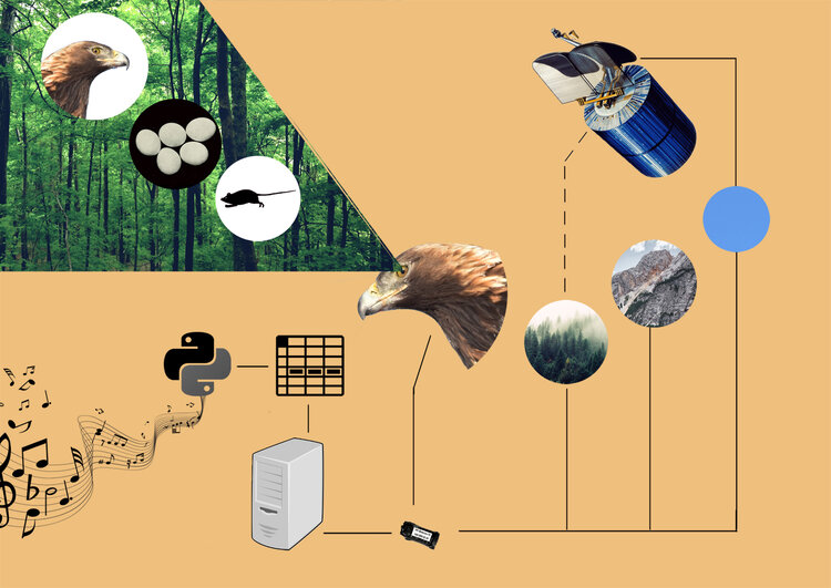Music for an Eagle and Three Satellites is a composition generated by converting Satellite Drift data from the records of tracking a golden eagle. When the three tracking satellites used for GPS couldn’t locate the tracked eagle’s sensor (“too bright to see”), they estimate a radius where the eagle could be. The artist converted that radius into musical notation.
