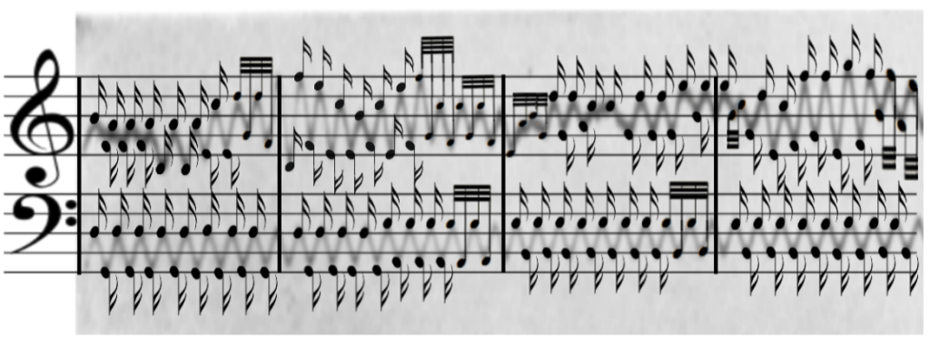 A method of overlaying of EEG’s with musical staves and transcribing the peaks and troughs into melodic material. This was a singular experiment as a proof of concept, but, does provide an easy and accessible composition method for all types of musicians interested in the transcribing of waveform print-outs such as an EEG. The sampler-instruments created with the EEG segmentation and the Granular Synthesis methods and materials were also implemented in the sound design for ‘The Esoteric Voyage of Hans, Nikolai and Zedel (1924)’ composition.