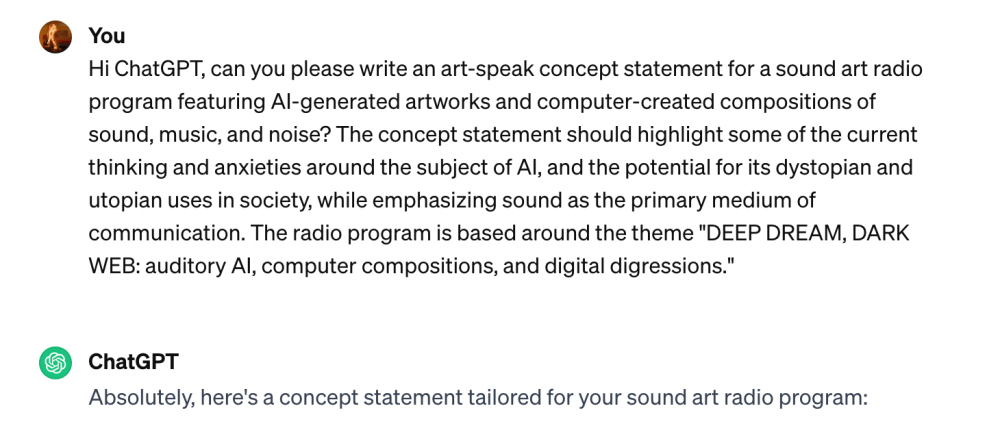 DEEP DREAM, DARK WEB converges at the intersection of artistry and artificial intelligence, exploring the multifaceted landscape where machine-generated sounds echo the complex contours of our technological zeitgeist. In this auditory odyssey, we journey through a sonic realm where the binary boundaries between human creativity and machine ingenuity dissolve into a symphony of digital musings. By featuring AI-generated artworks and computer-composed soundscapes, this program encapsulates the evolving dialogue between humanity and its technological progeny. Join us as we navigate the labyrinthine echoes of this brave new world, where the symphony of machines and the melody of humanity converge, creating a tapestry of sound that resonates with both the harmony and dissonance of our shared future.