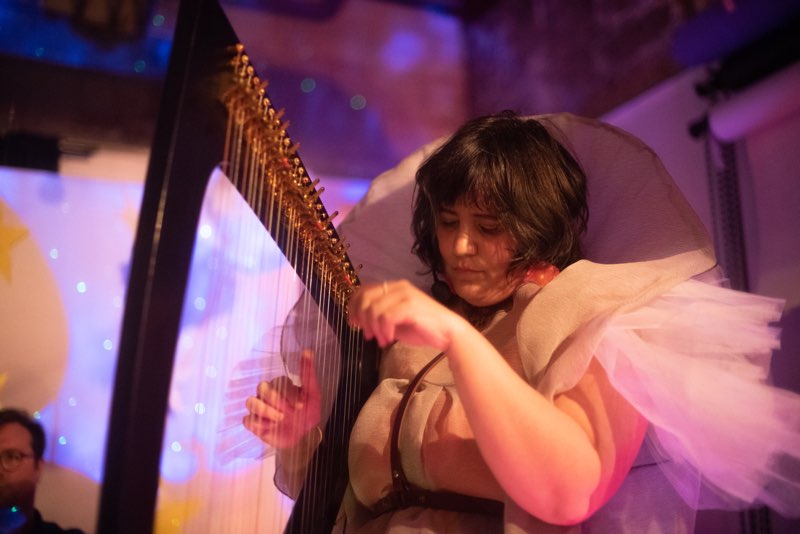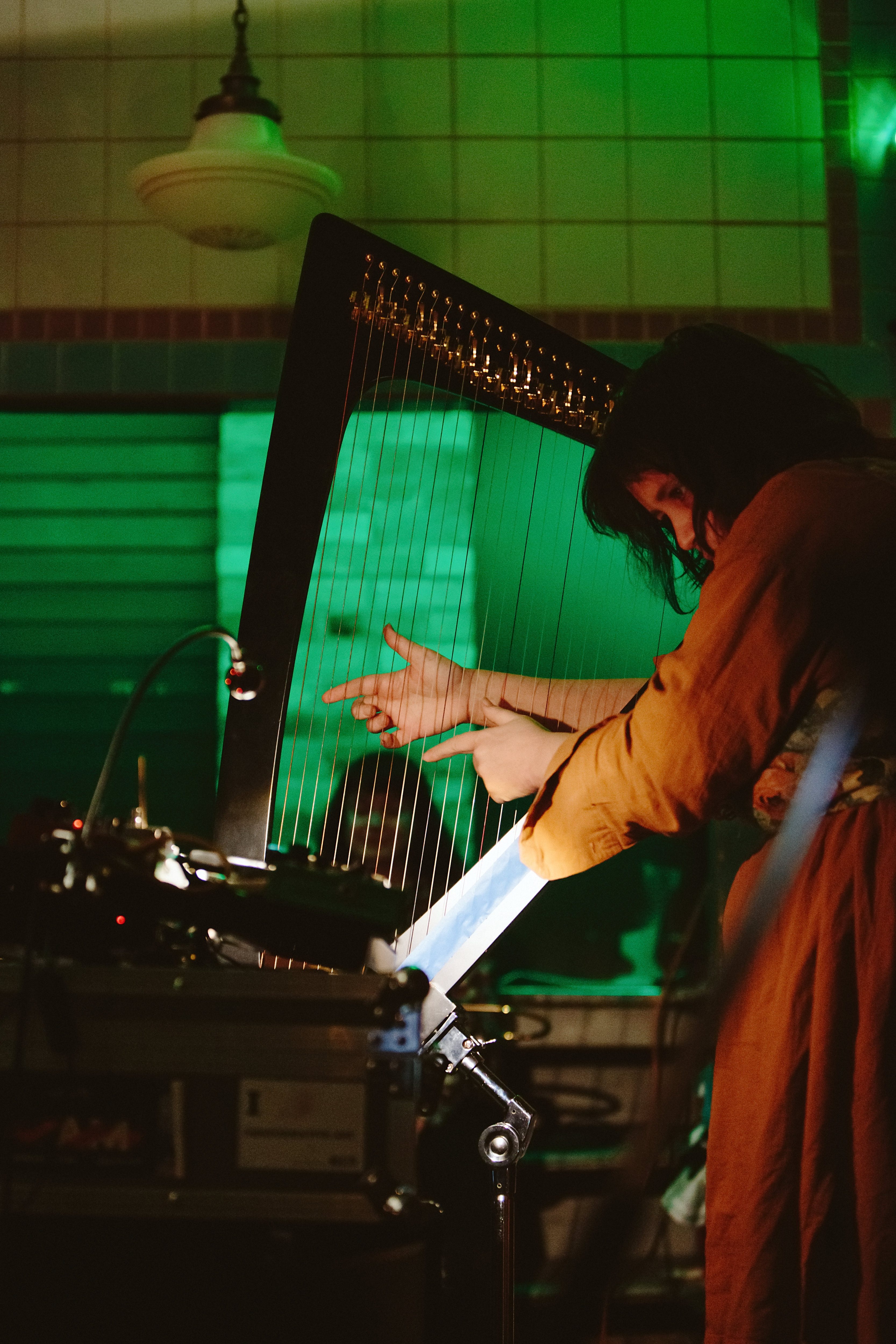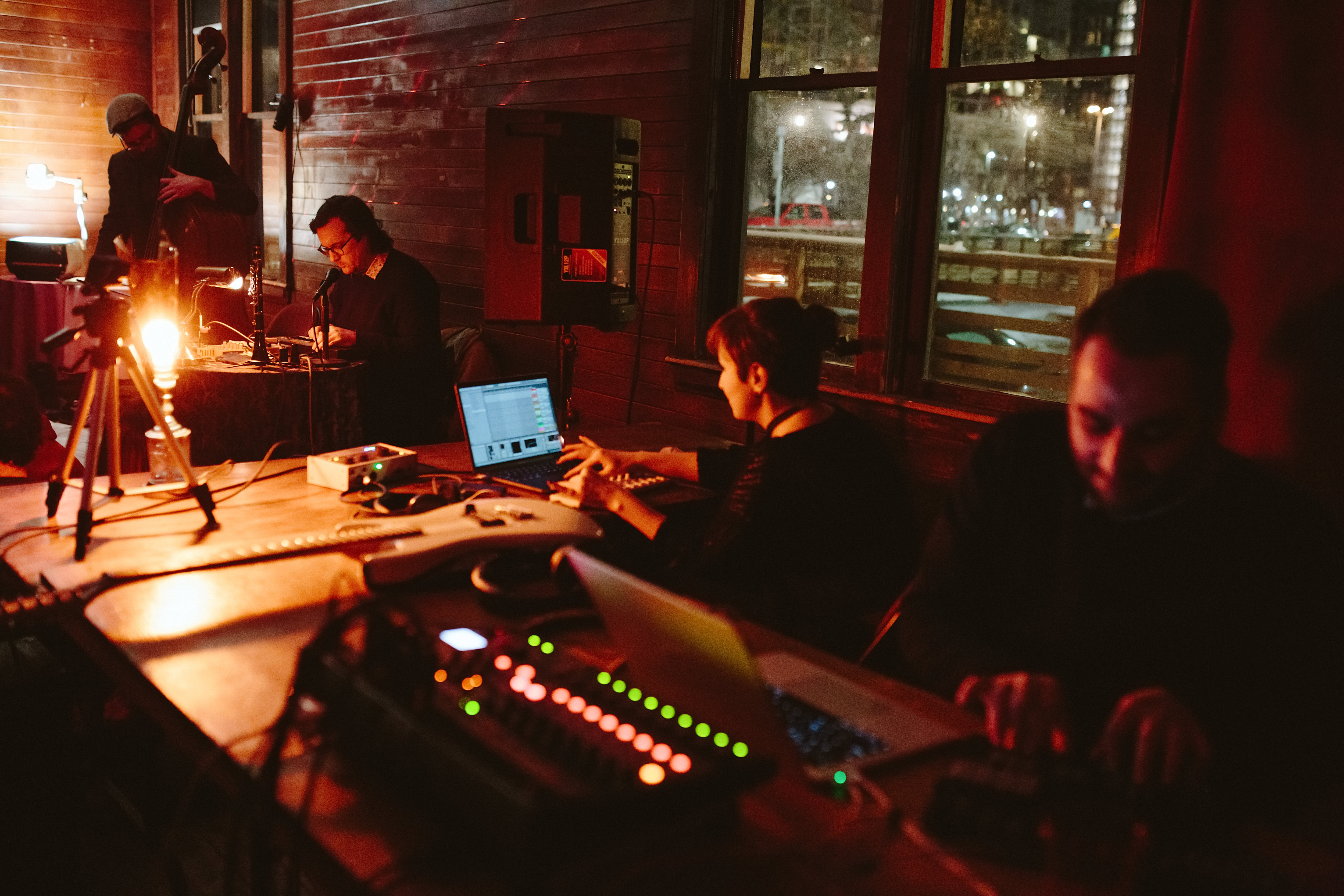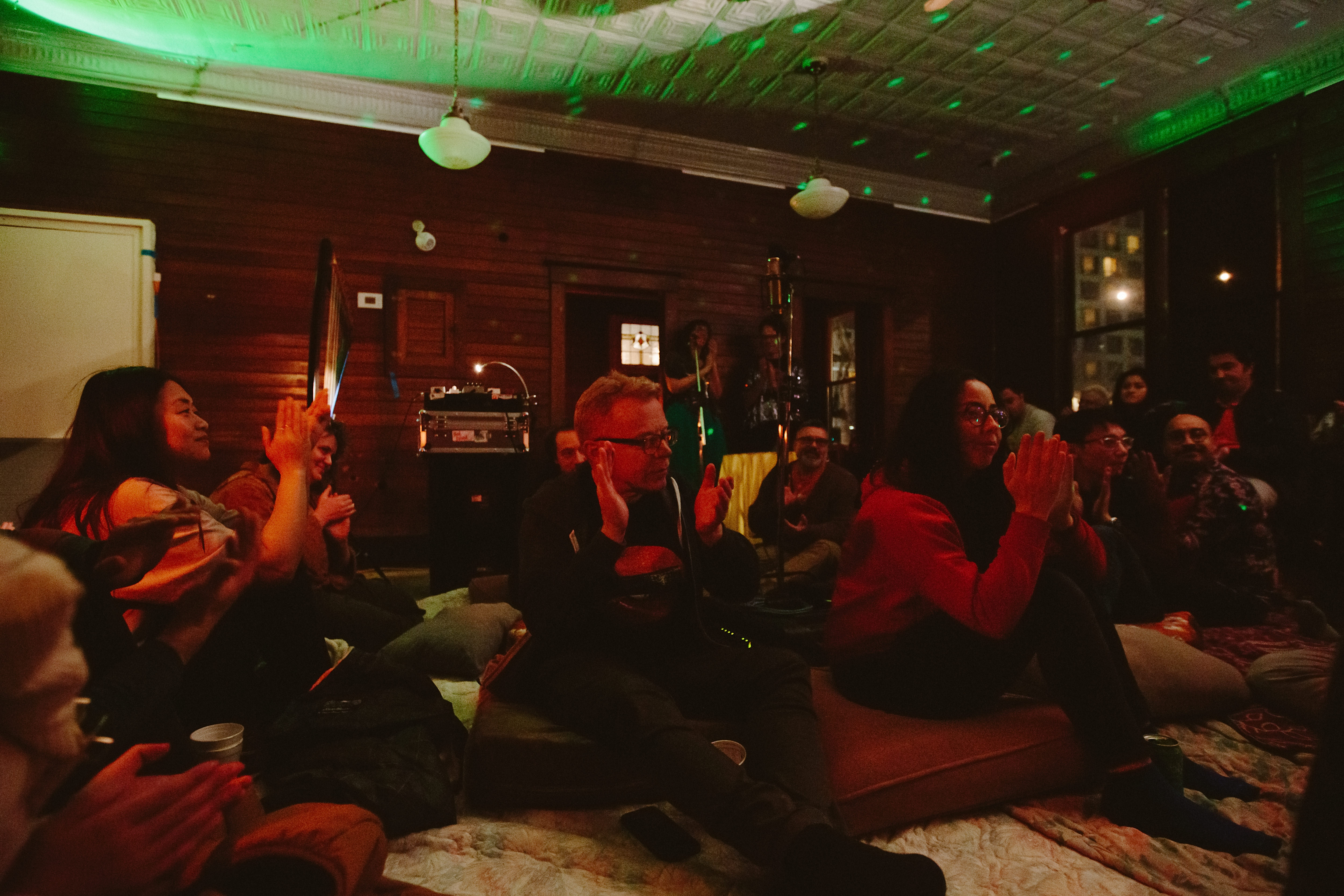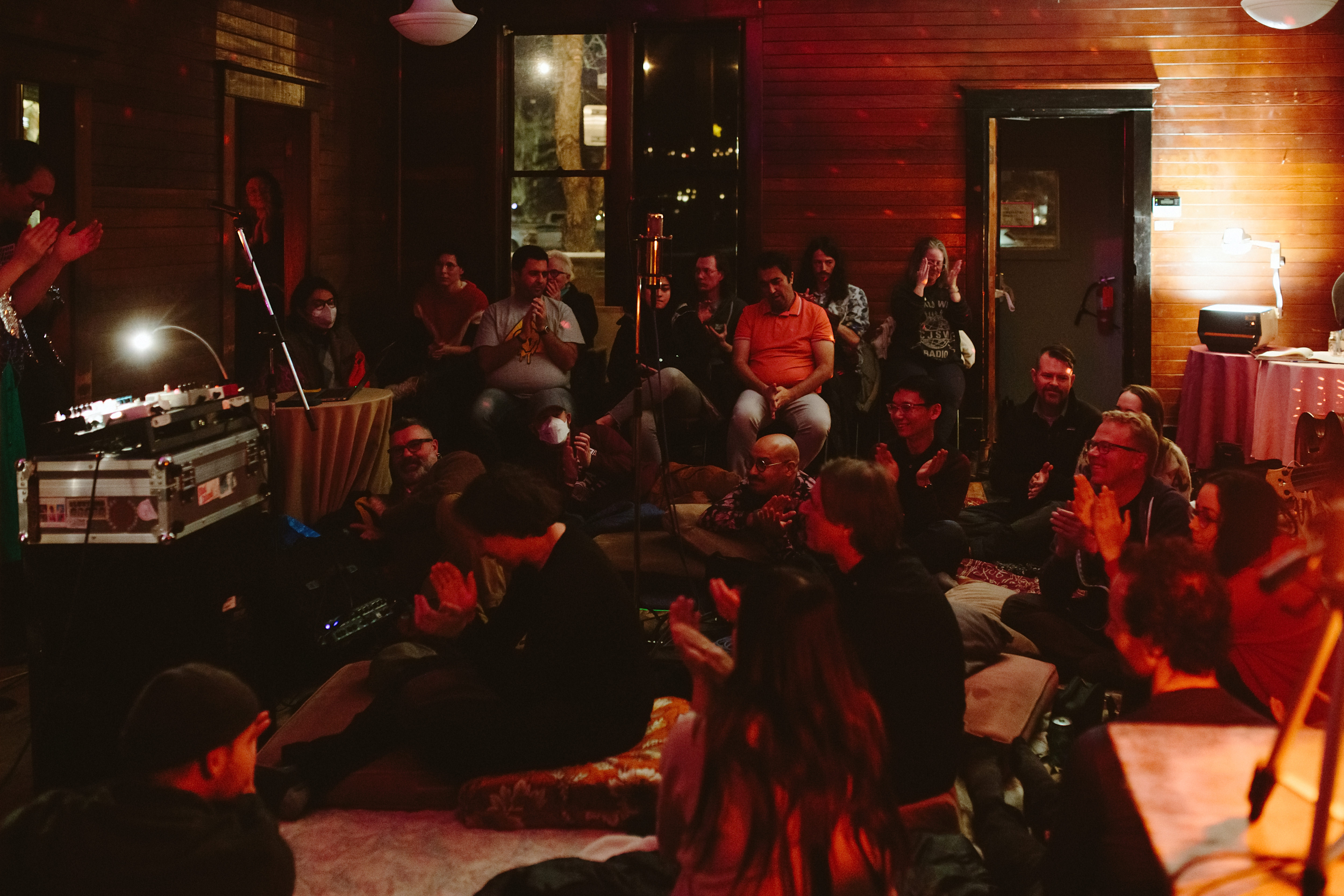 Artists performed “in the round” surrounding the audience, who were sitting on the floor in the centre of the room. This approach was intended to break the binary between artist and audience, integrating the listener into an immersive, spatial environment.