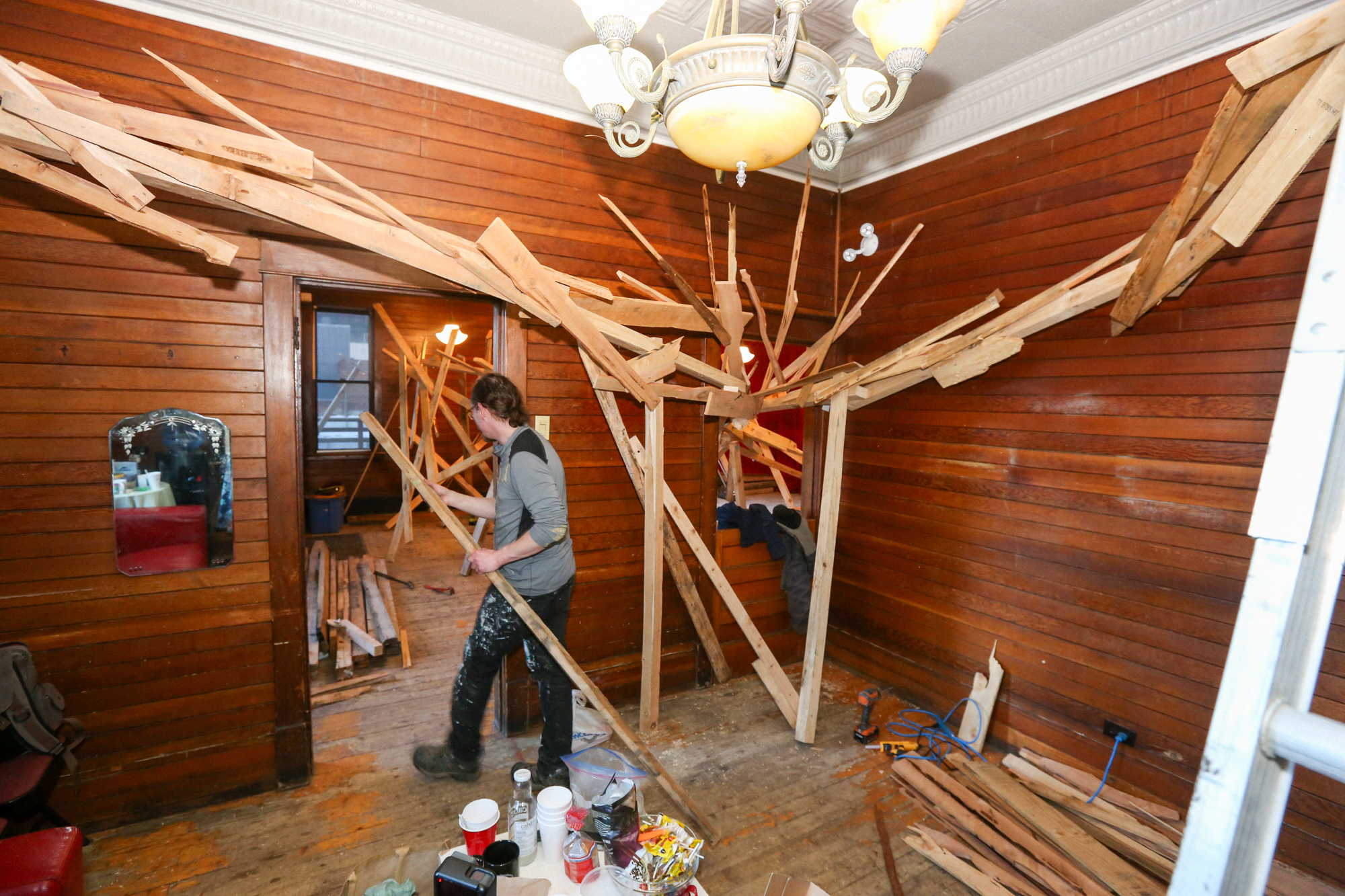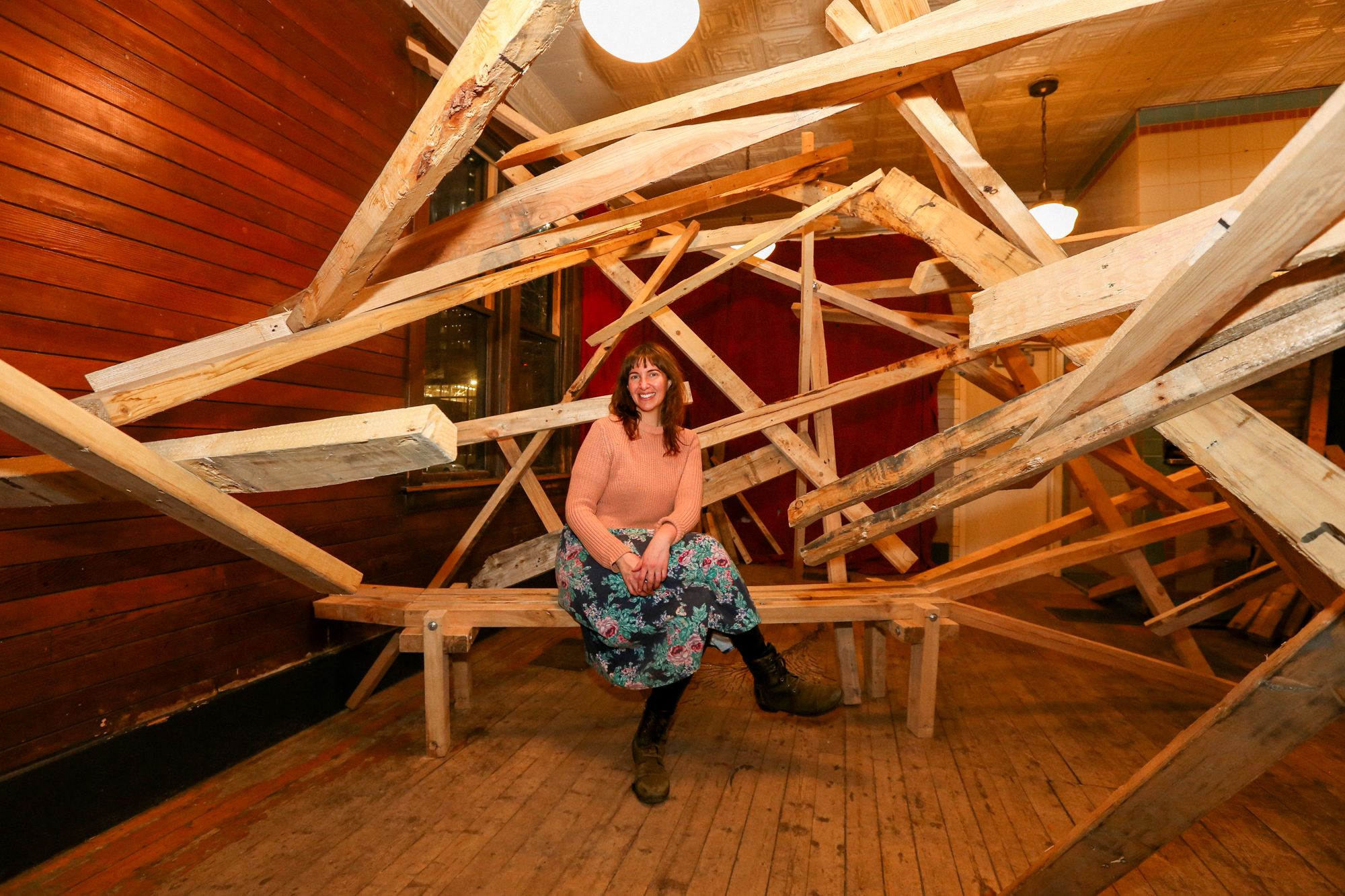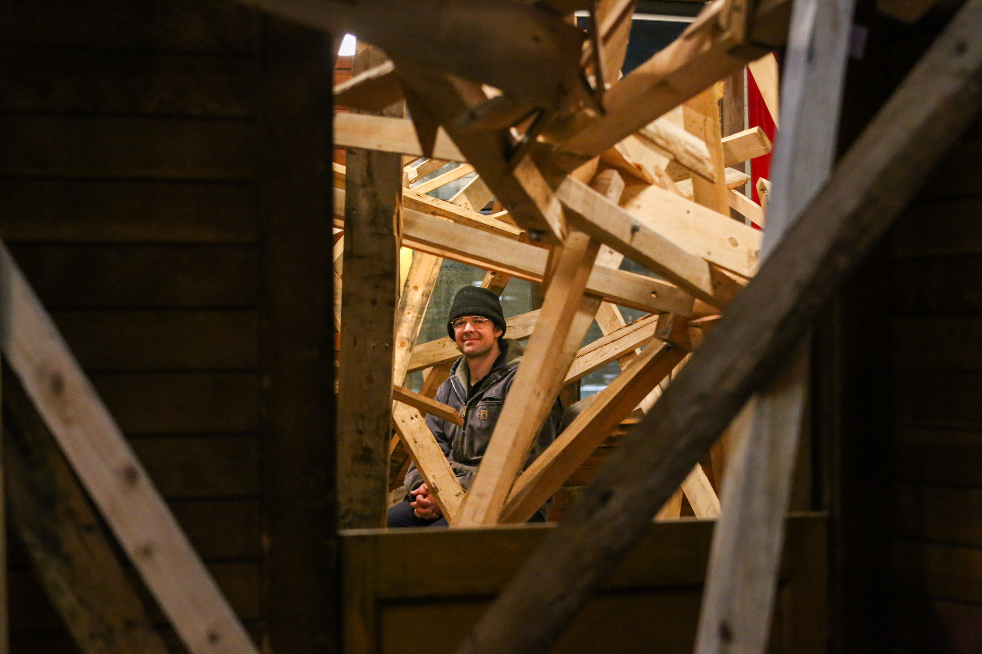 In response to the history of cSPACE Eau Claire as the former offices and vault for the Eau Claire & Bow River Lumber Company, artists & sculptors joined us in crafting a collaborative interlocking lumber sculpture. We worked with Ivan Ostapenko to provide salvaged lumber, and participants created sculptures following (and breaking) the conventions they desired, with the caveat that their work must, at some point, intersect with the sculptures around them – creating one, giant, growing, organic structure.