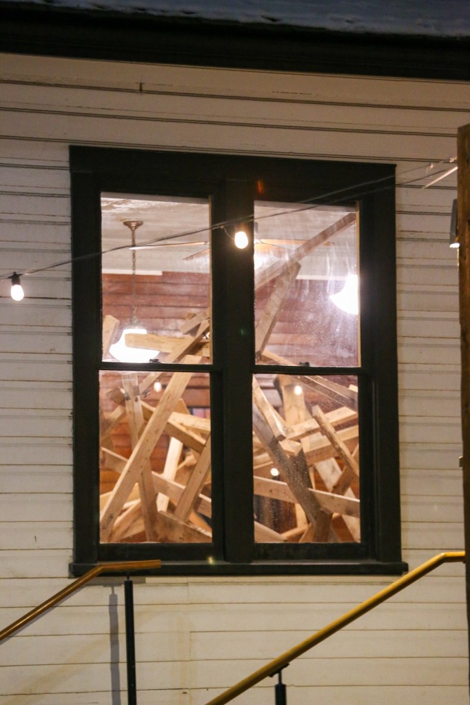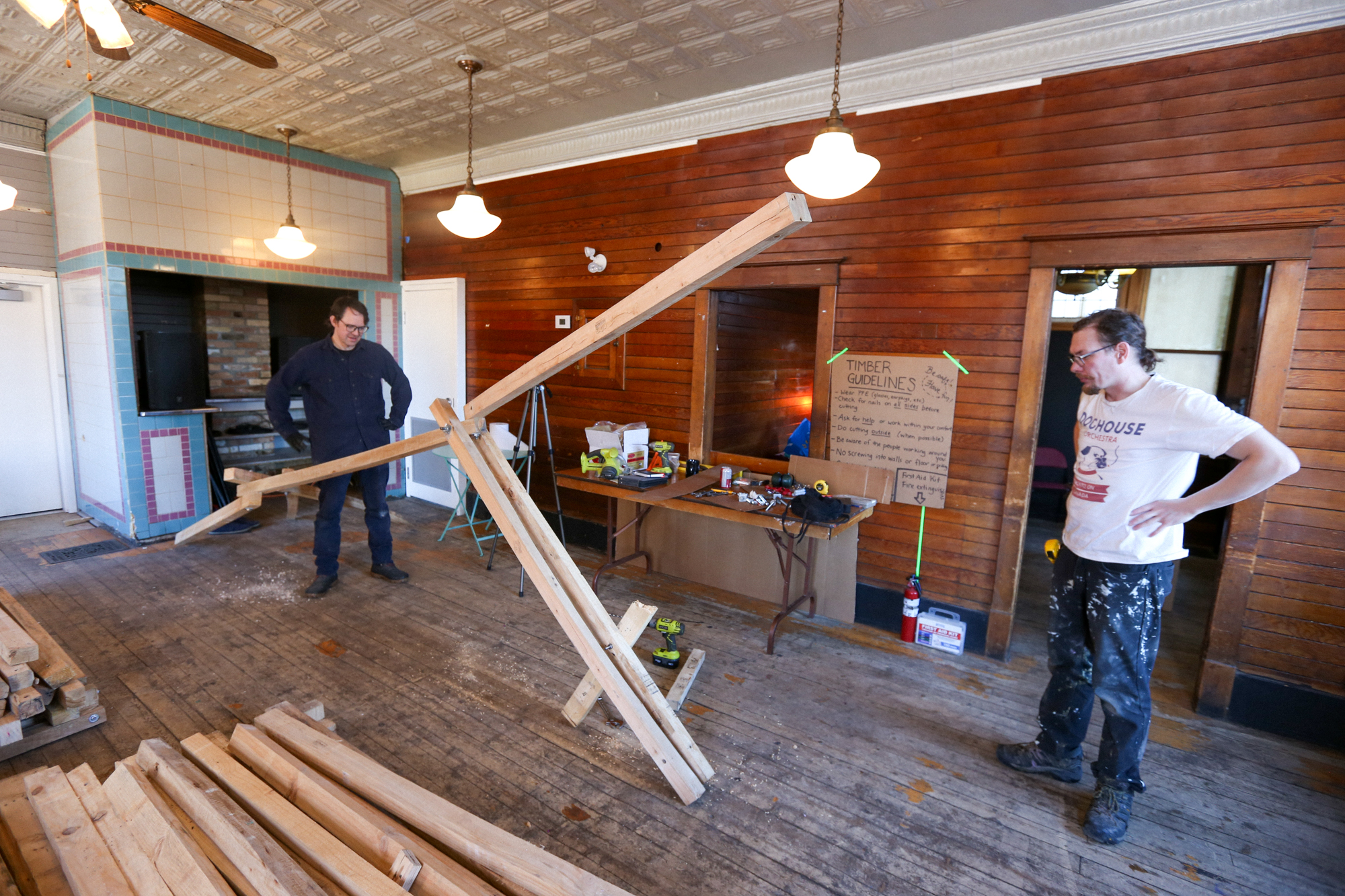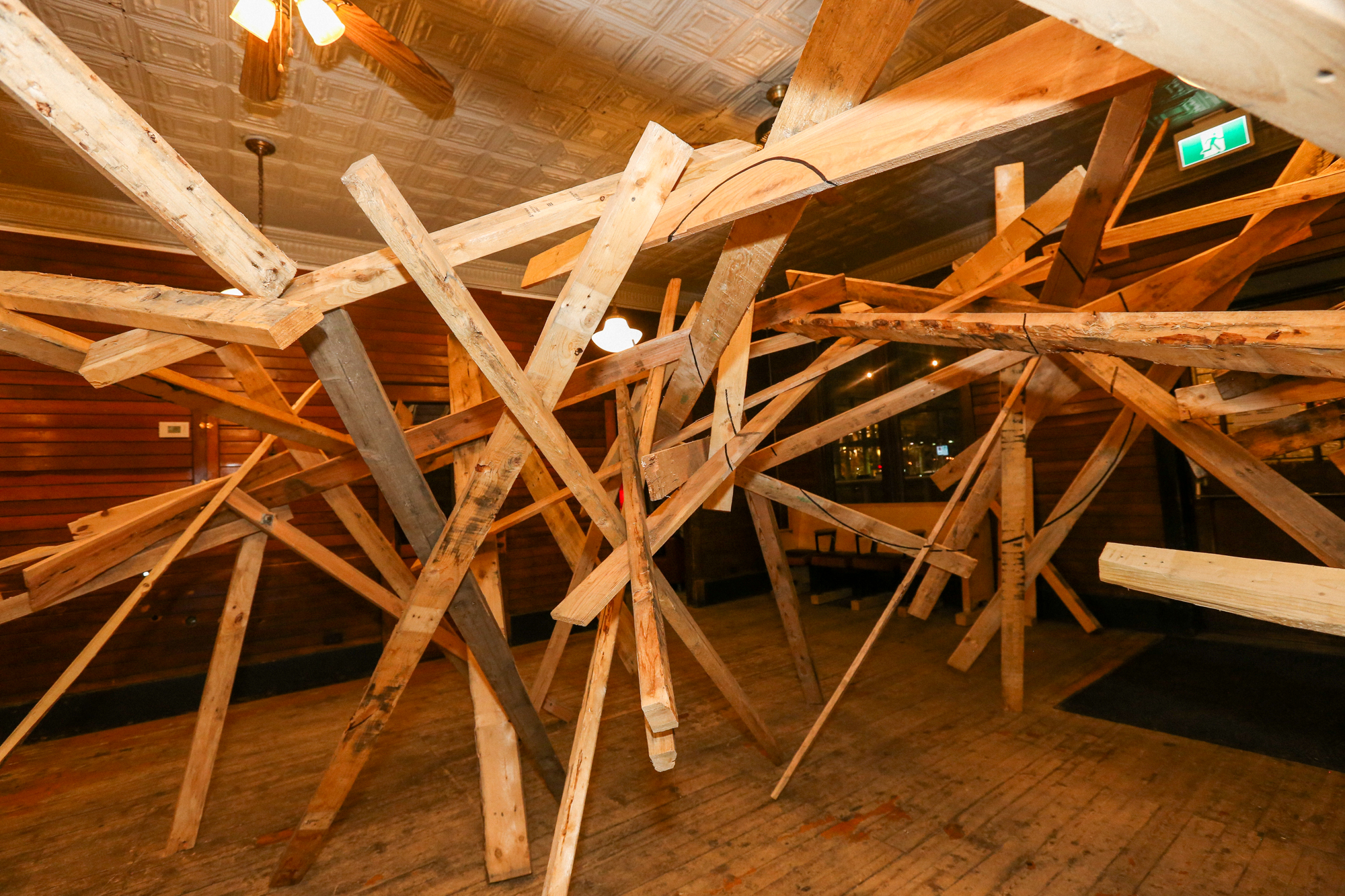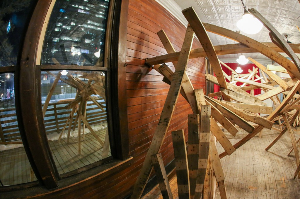 In response to the history of cSPACE Eau Claire as the former offices and vault for the Eau Claire & Bow River Lumber Company, artists & sculptors joined us in crafting a collaborative interlocking lumber sculpture. We worked with Ivan Ostapenko to provide salvaged lumber, and participants created sculptures following (and breaking) the conventions they desired, with the caveat that their work must, at some point, intersect with the sculptures around them – creating one, giant, growing, organic structure.