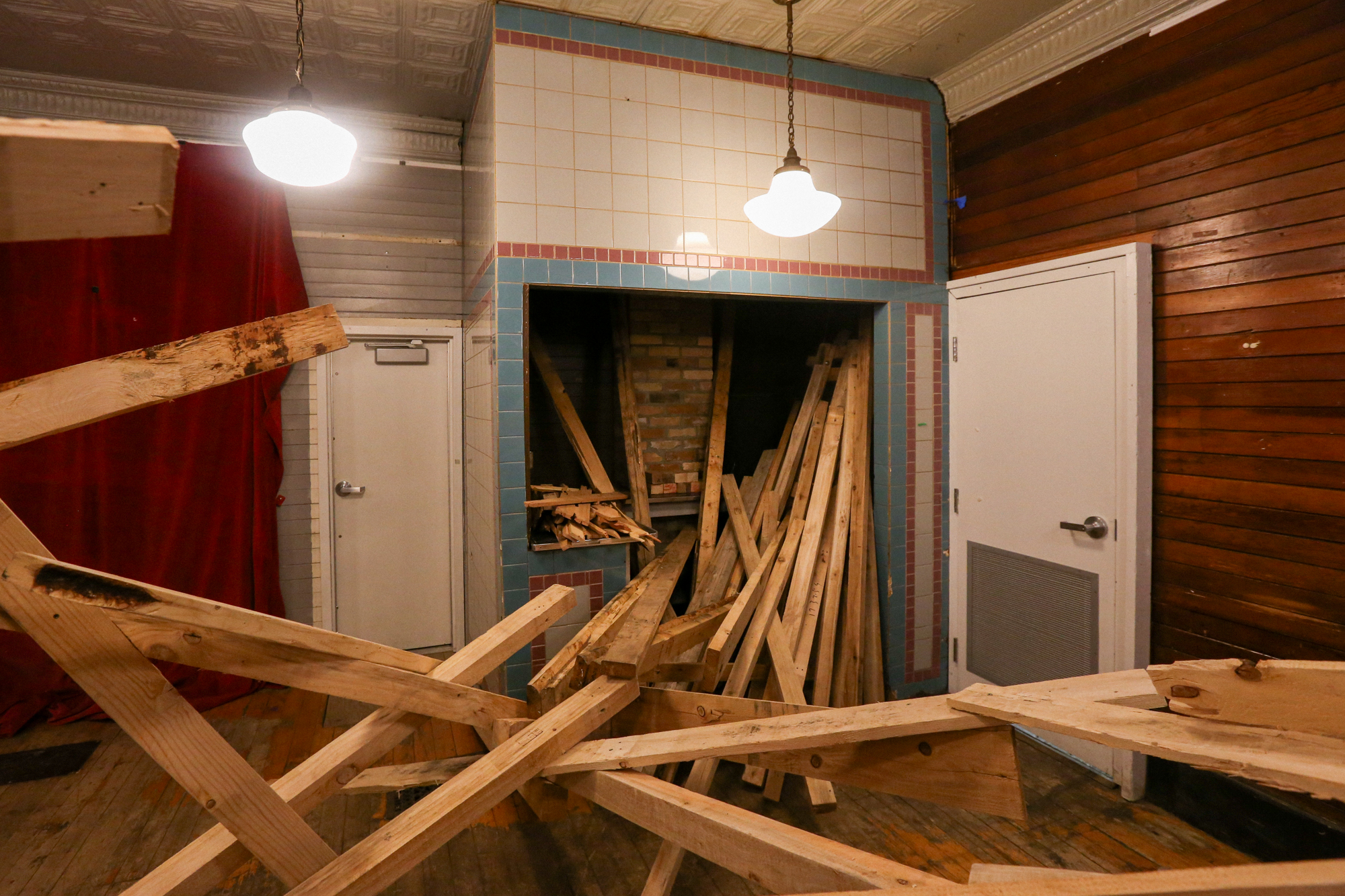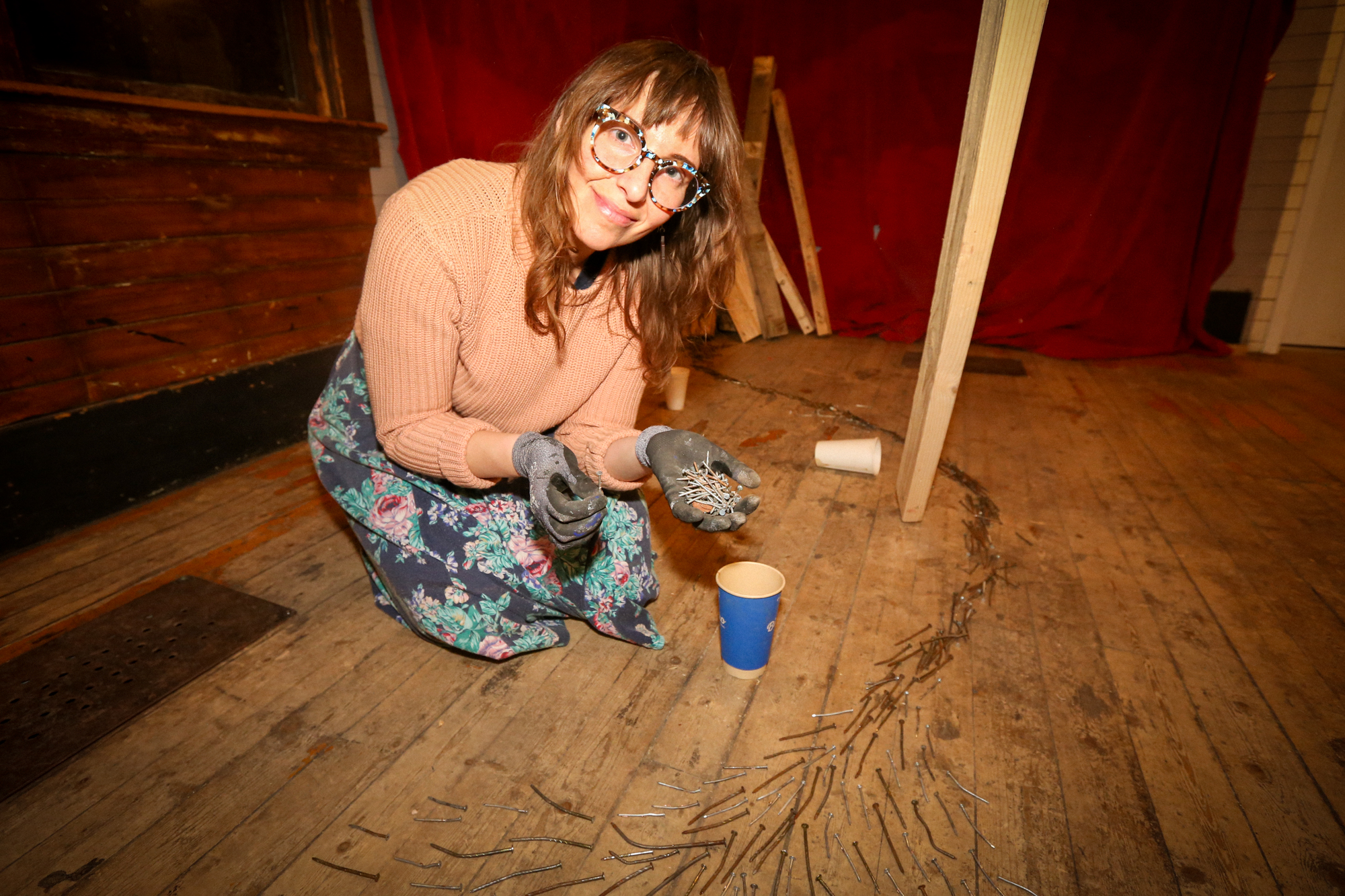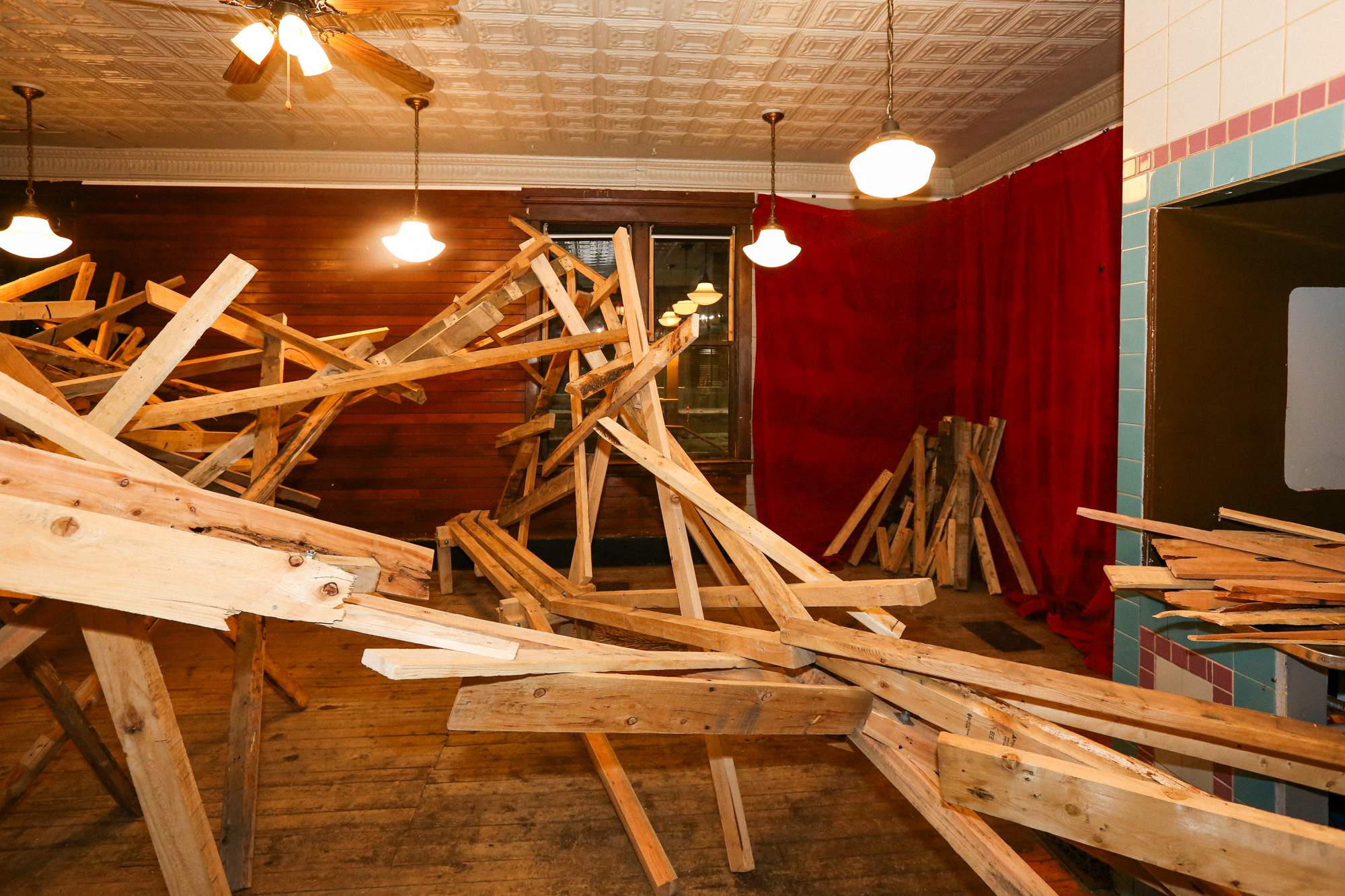 A river of nails (previously pulled from the wood beams) trickled towards the more deadly of the nail-riddled lumber, propped against a red curtain in the corner.