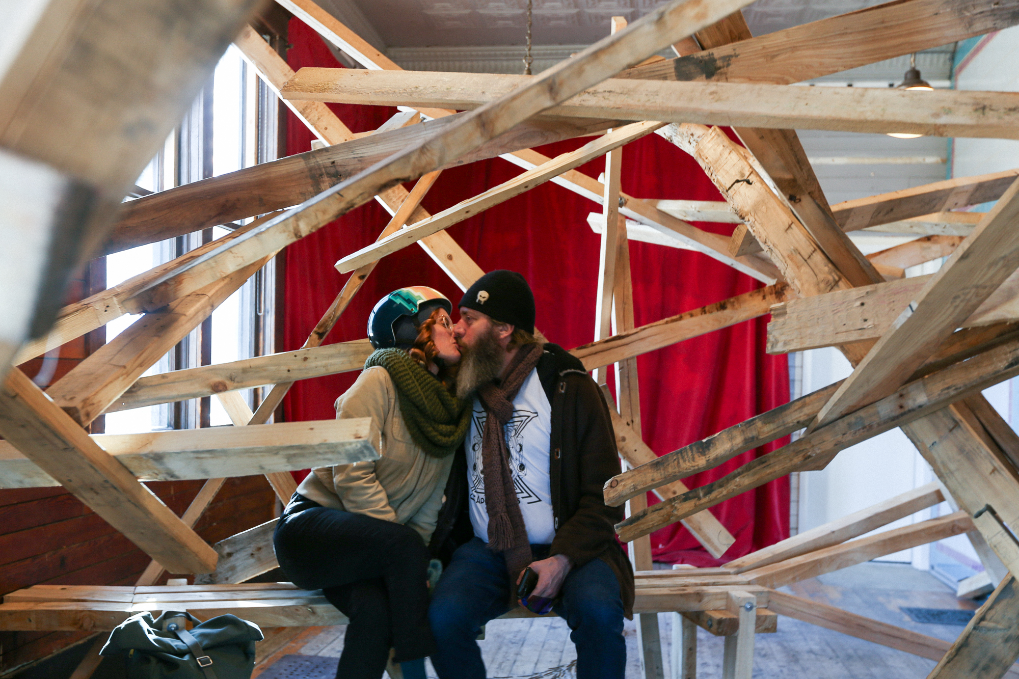 TIMBER was one of our few open themes at this year’s Hibernation Project (the wonderful problem of support). Immediately, Ivan Ostapenko took the lead, helping us smash apart pallets and scavenge wood (thanks Ivan!) Eric Heitmann joined us to create a fanned emphasis to the entrance of the sculpture.
