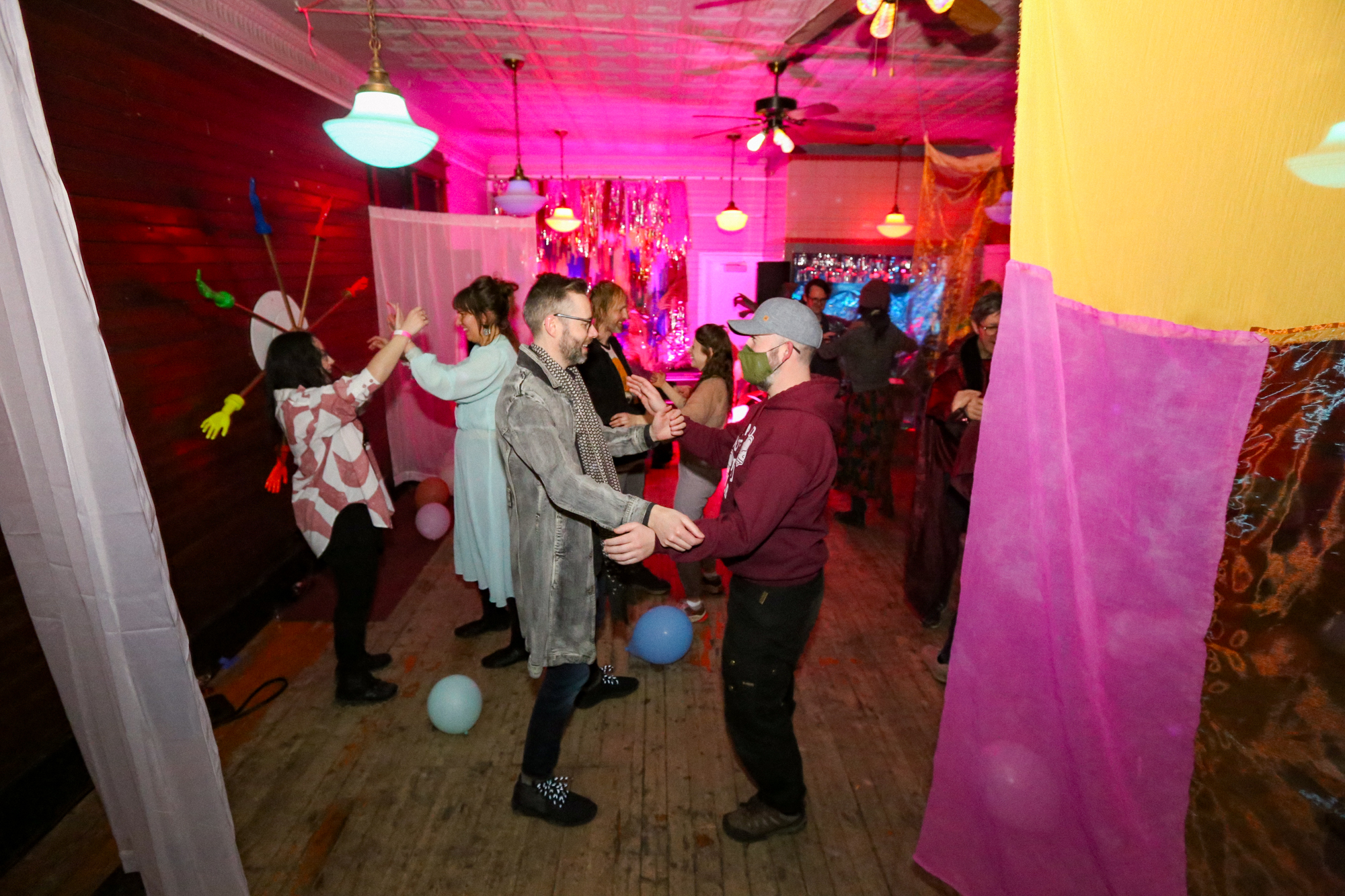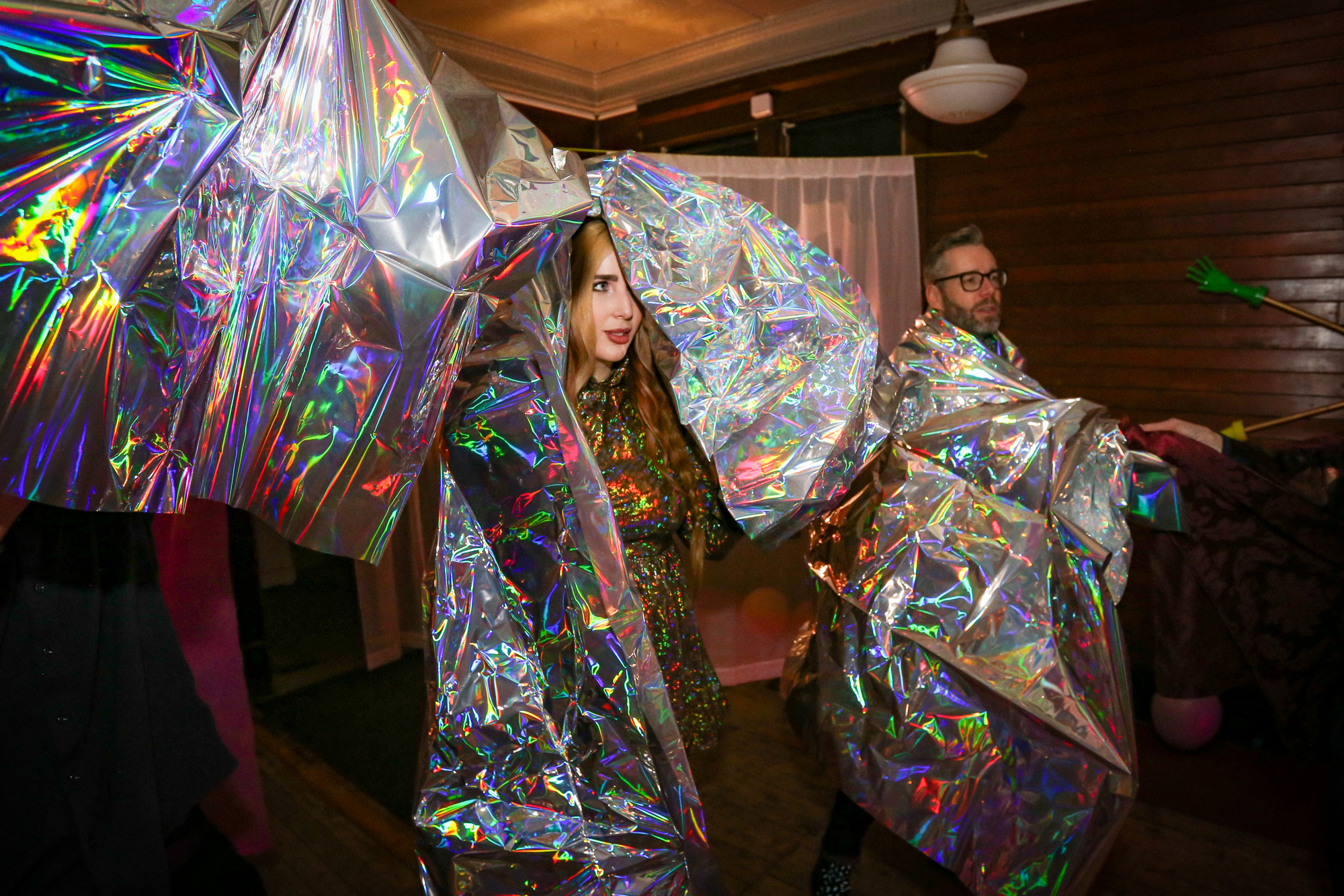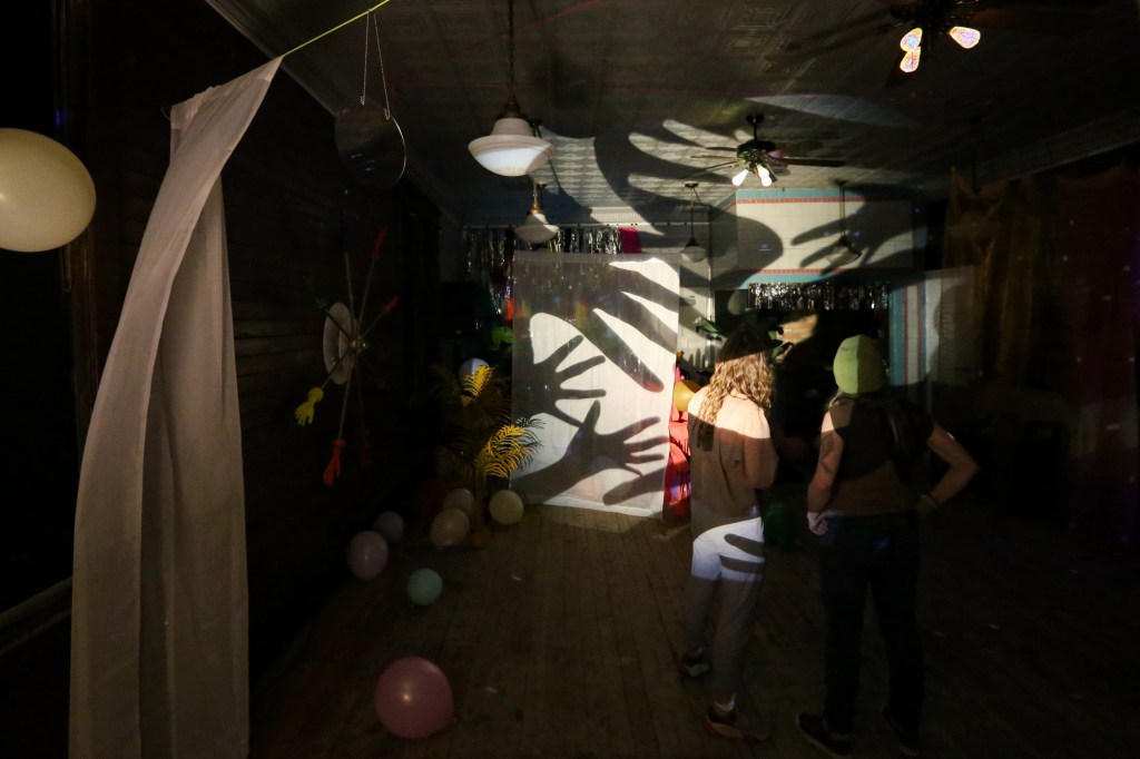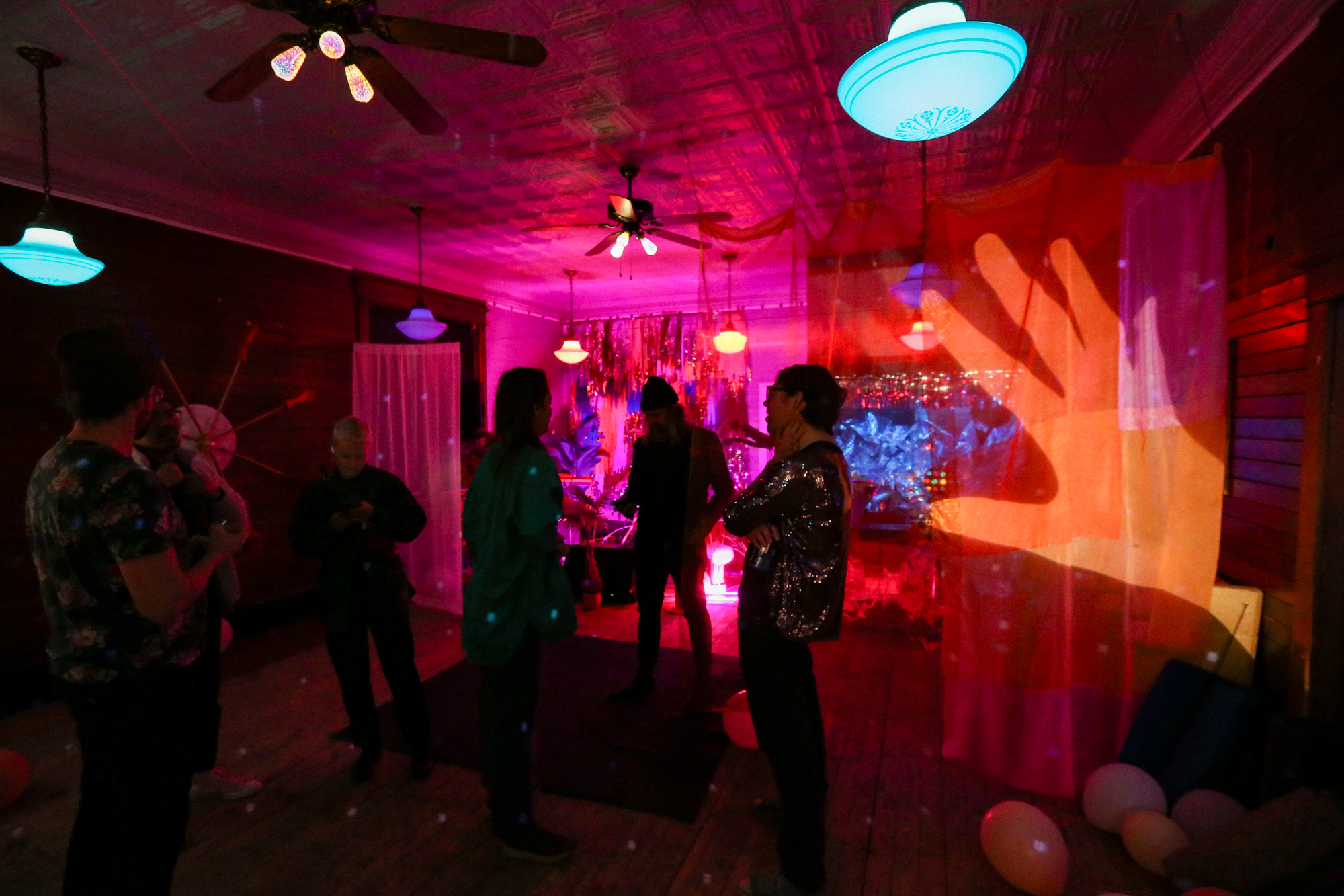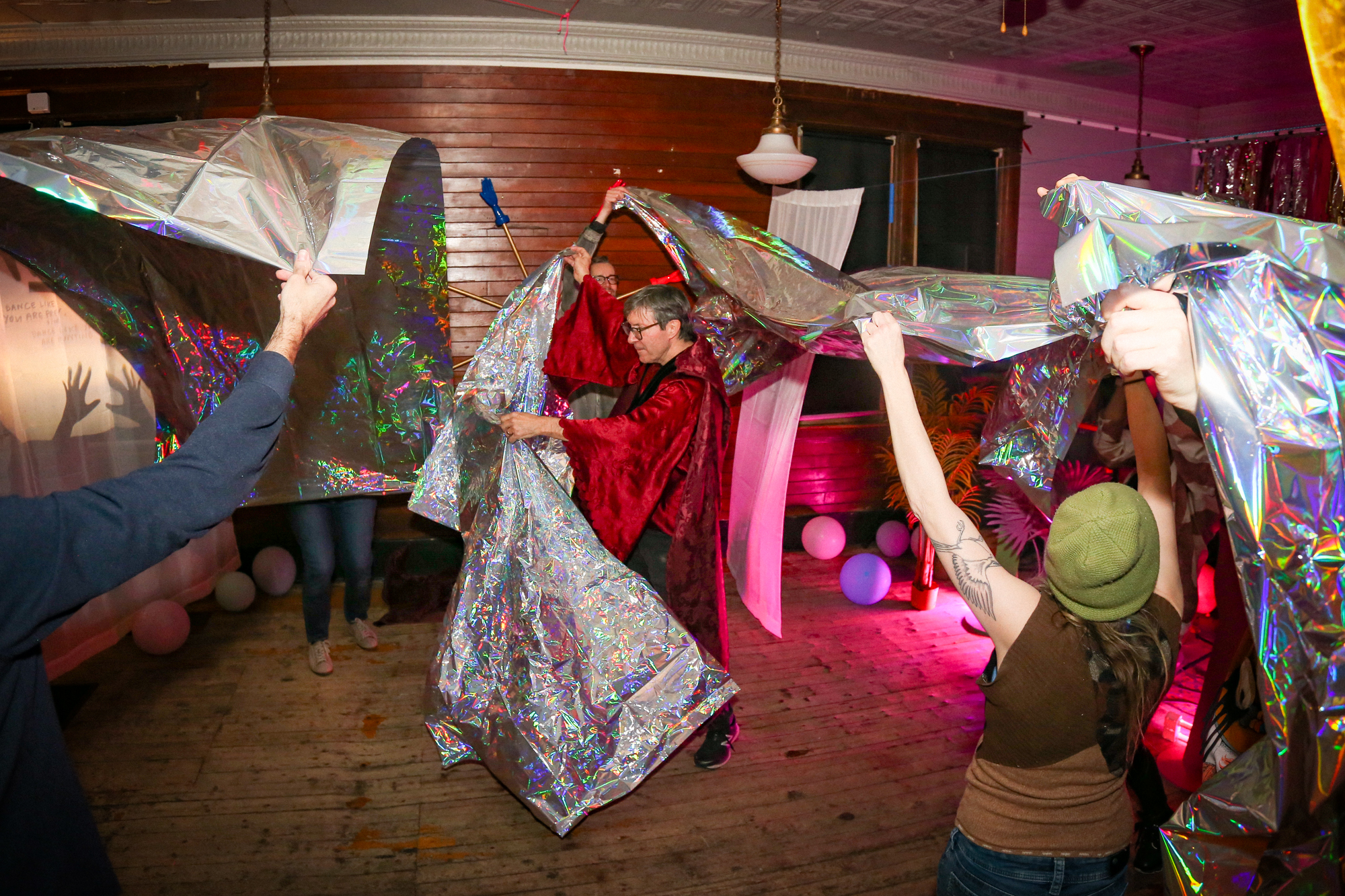 Rebecca Reid, Desiree Nault, and Caitlind Brown led the project of sculpting cSPACE Eau Claire into the ideal venue for a slow dance: complete with streamers, a glowing triple-level punch fountain, luminous curtains, and warm light. Wayne Garrett and Ryan Bourne contributed to aesthetics, but – in particular – guided the sounds unfolding over our evening of Heat Seeking.