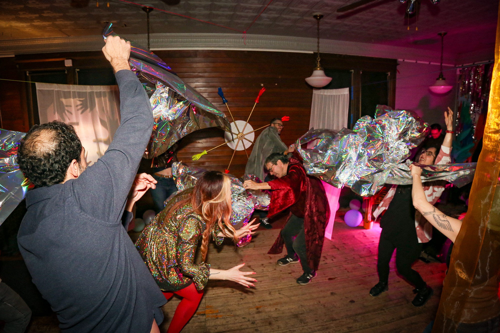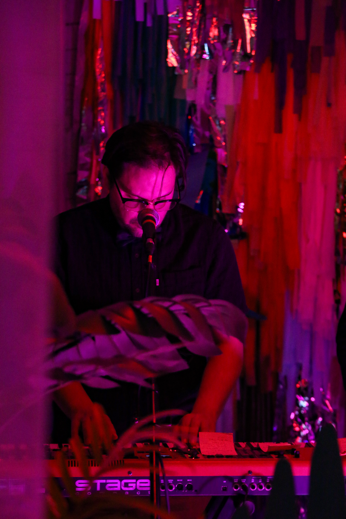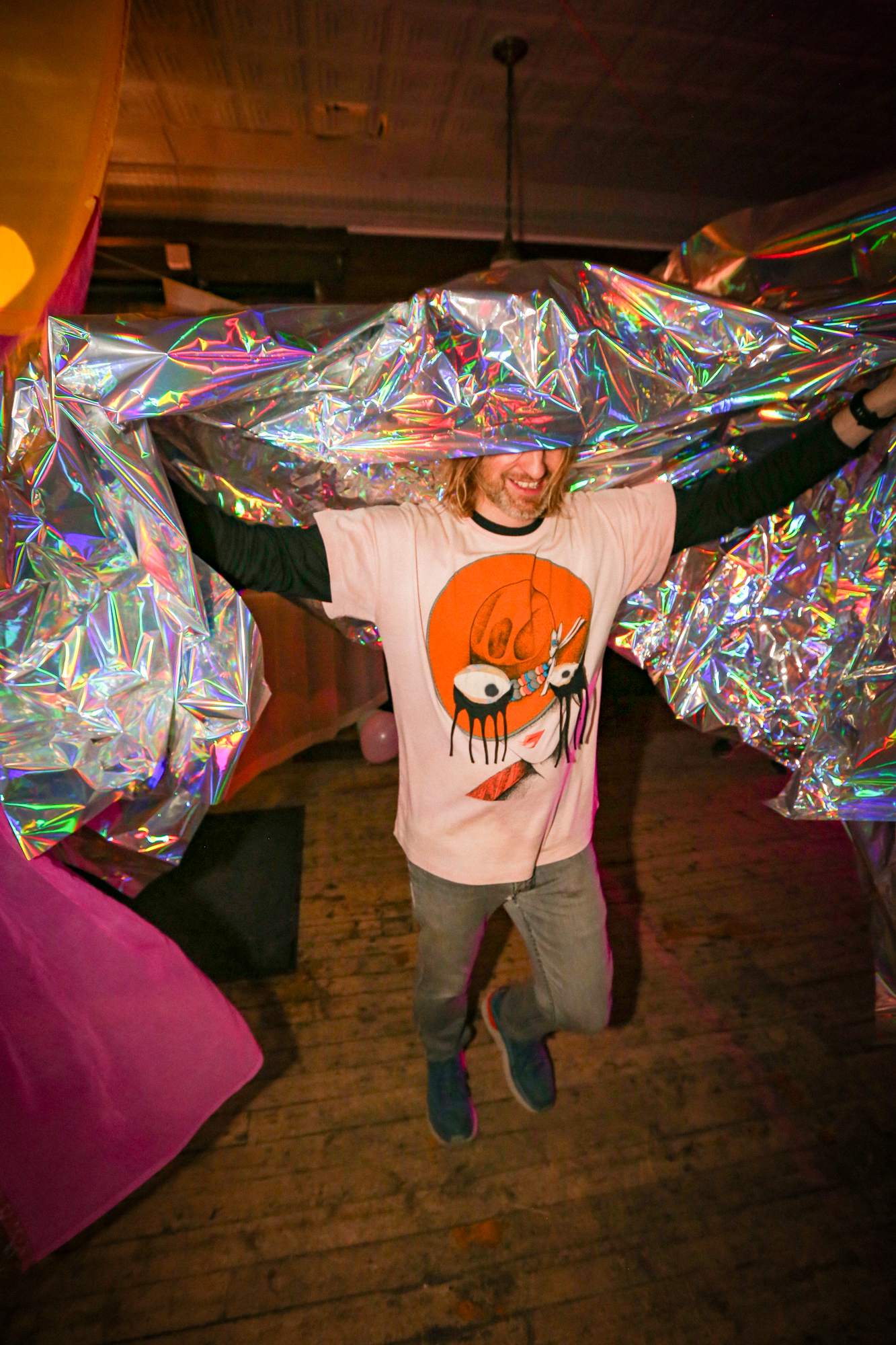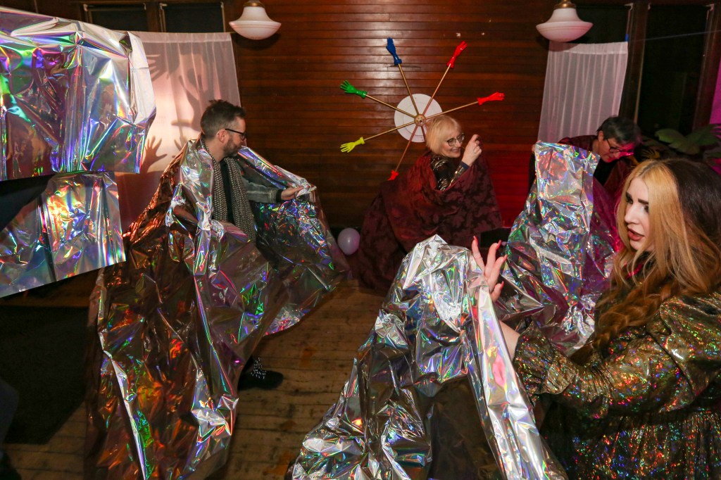 Rebecca Reid, Desiree Nault, and Caitlind Brown led the project of sculpting cSPACE Eau Claire into the ideal venue for a slow dance: complete with streamers, a glowing triple-level punch fountain, luminous curtains, and warm light. Wayne Garrett and Ryan Bourne contributed to aesthetics, but – in particular – guided the sounds unfolding over our evening of Heat Seeking.