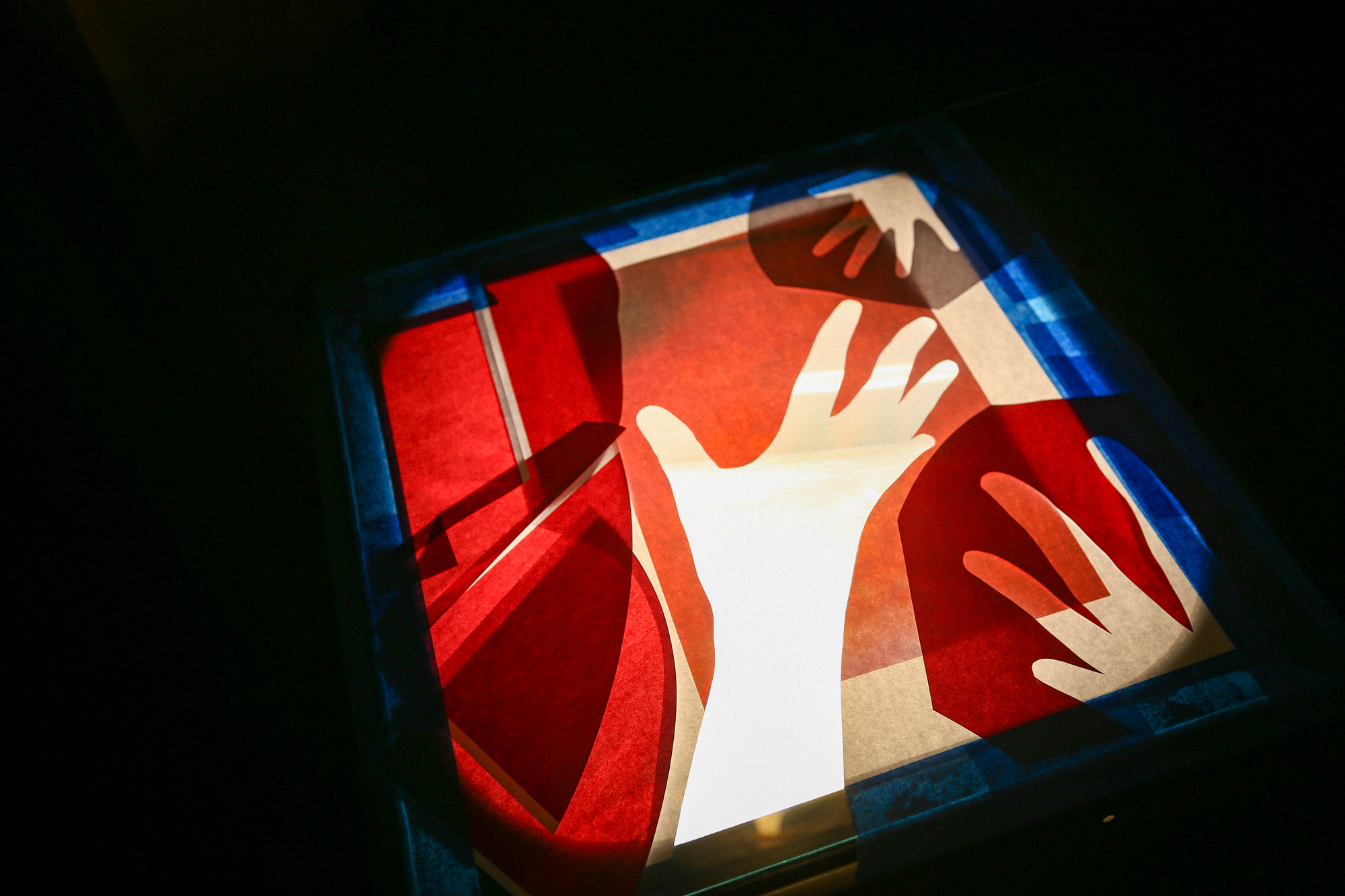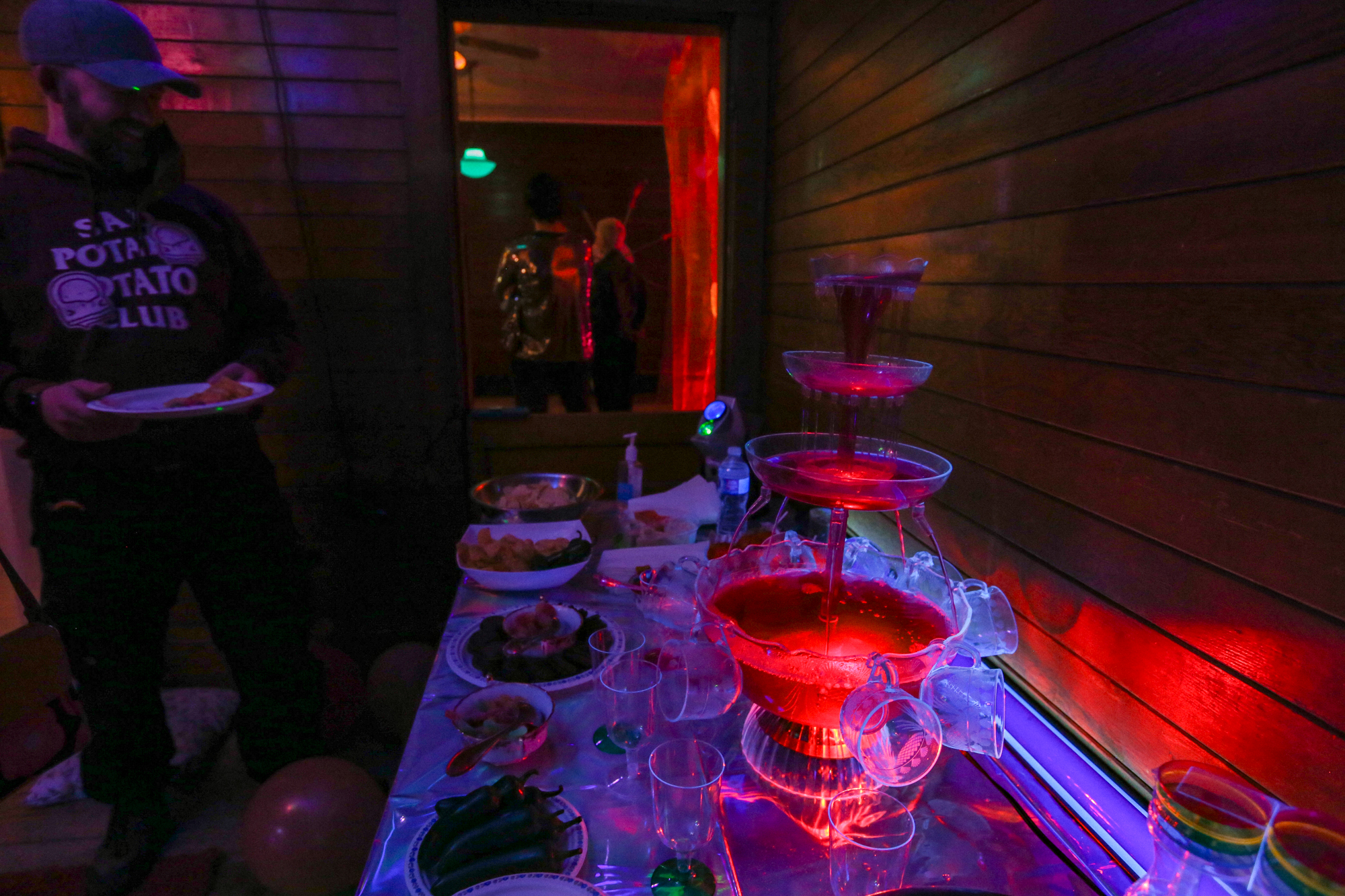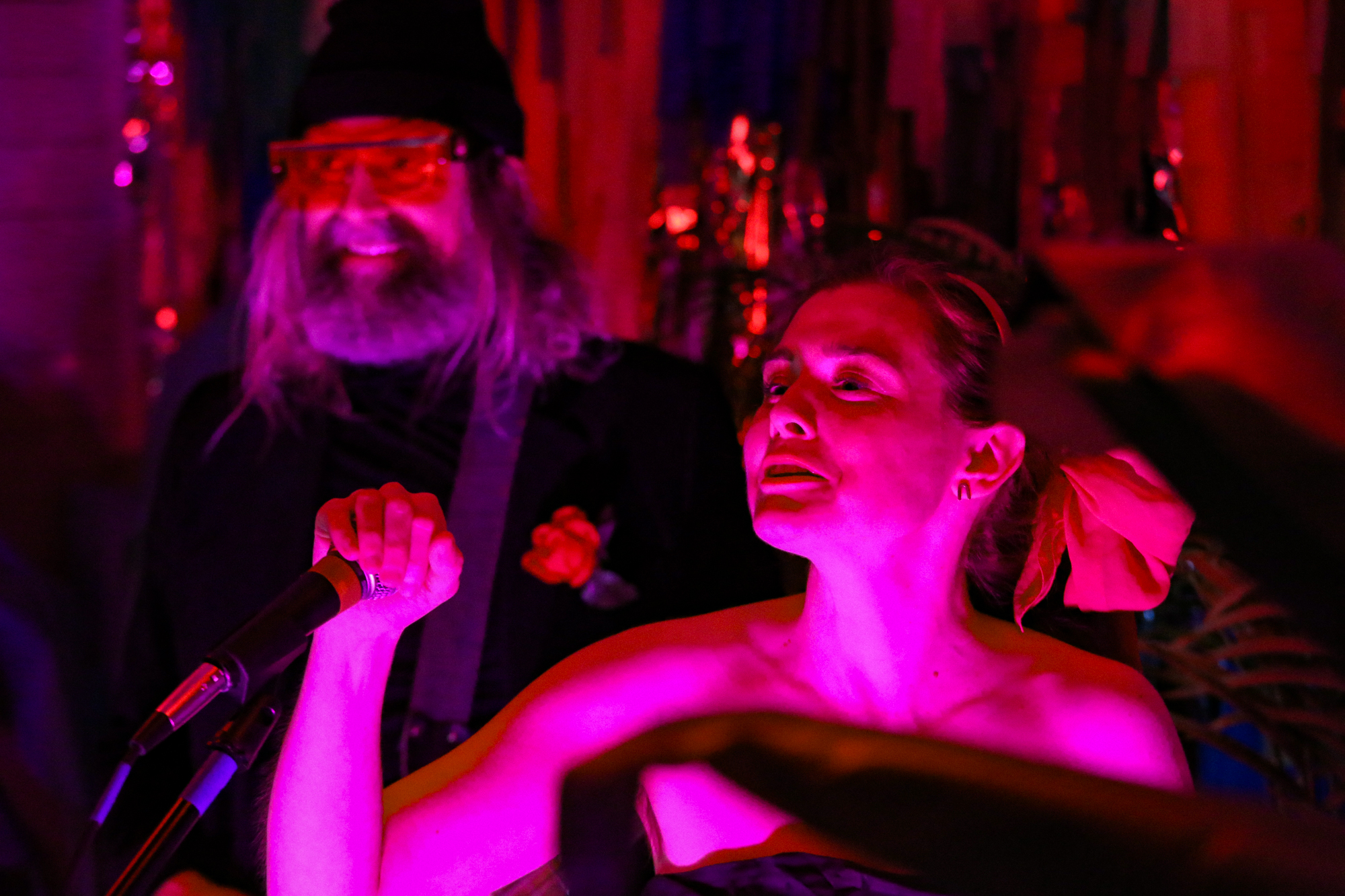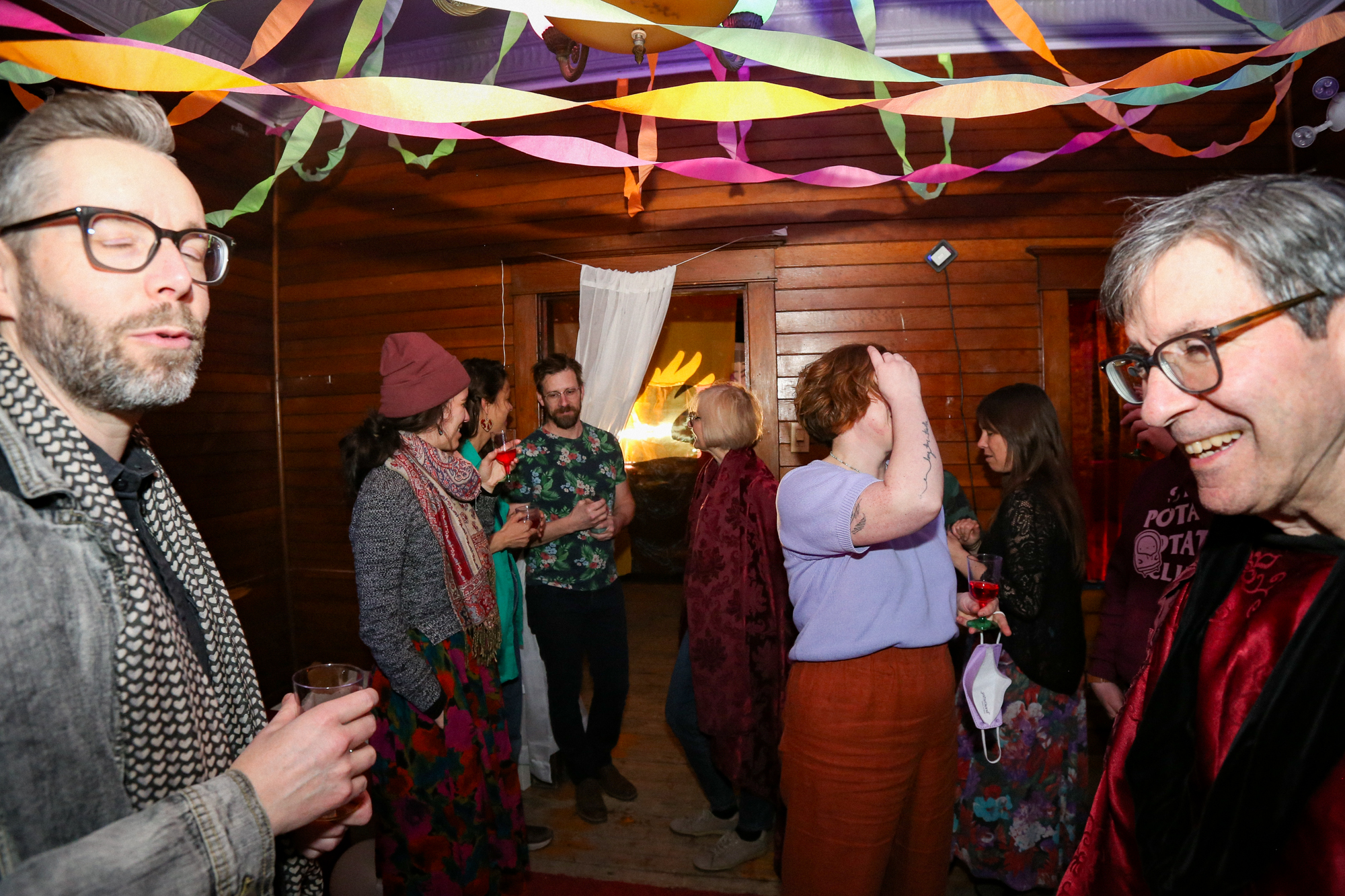Rebecca Reid, Desiree Nault, and Caitlind Brown led the project of sculpting cSPACE Eau Claire into the ideal venue for a slow dance: complete with streamers, a glowing triple-level punch fountain, luminous curtains, and warm light. Wayne Garrett and Ryan Bourne contributed to aesthetics, but – in particular – guided the sounds unfolding over our evening of Heat Seeking.
