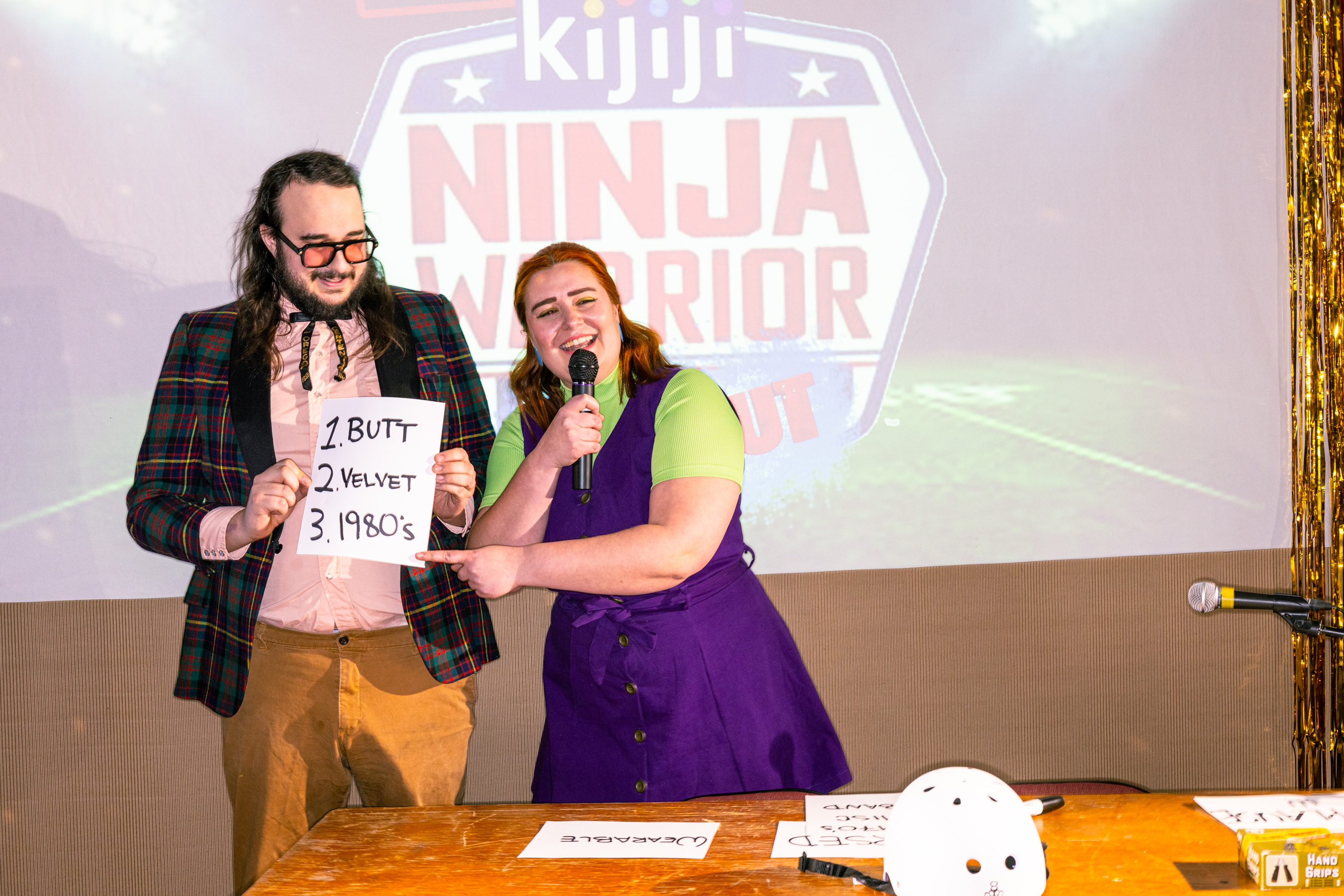 The first few bits: our Weatherman, Jack Bride, and local sports personalities, Chip McGrip (Patrick Hamilton) & Beanie Madison (Fiona McTaggart) hosted participants in the hot seat for Ultimate Ninja Warrior Wipe-Out!