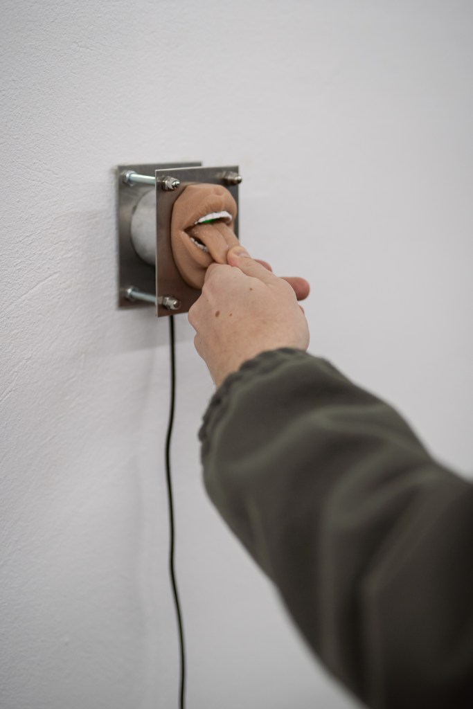 LLLAAA is an interactive sound sculpture that explores the interface between body, technology and language. A silicone mouthpiece mounted on the wall, which plays a role in body modification culture, serves here as an instrument for sound production. The movement of a silicone tongue inside the mouth, the resonance chamber, creates a continuous, digital ‘LALALA’.