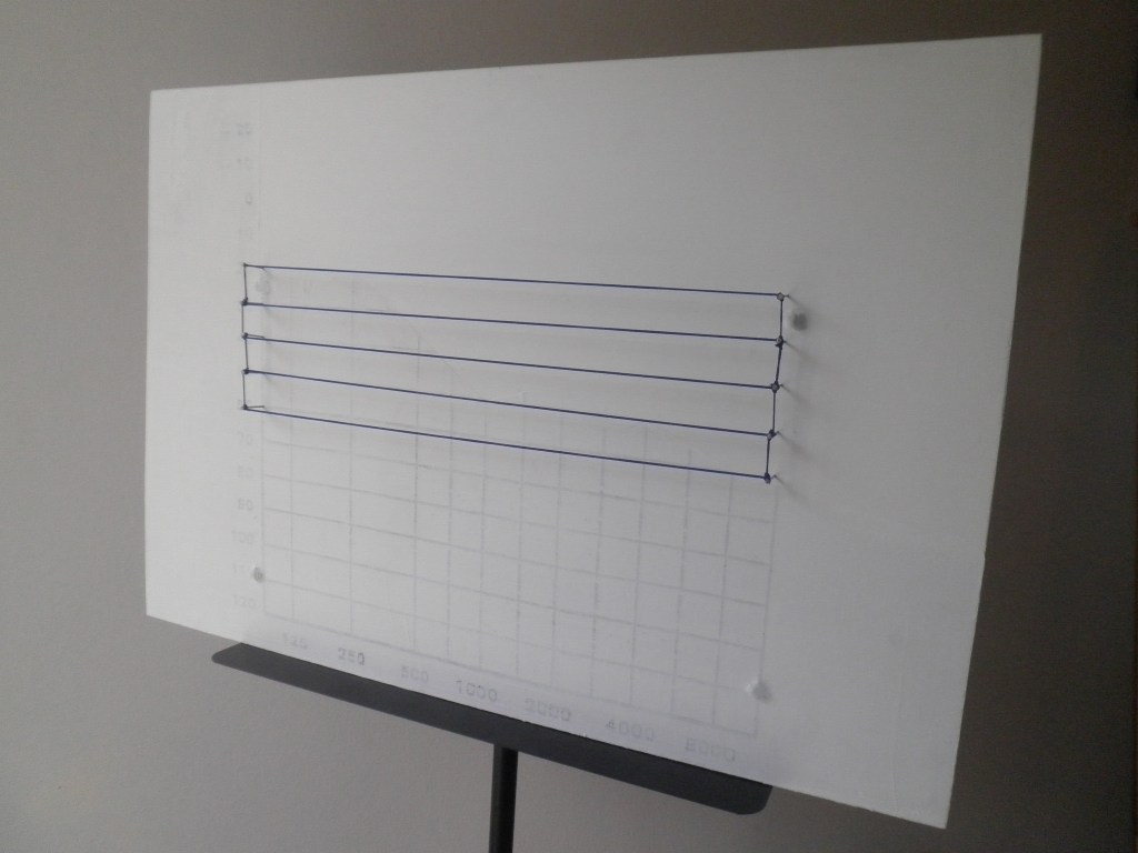 “Paralleling the title of the artwork ‘Hearing Instrument’ with a ‘Musical Instrument’, I define my hearing aids as musical instruments. By amplifying the sound the hearing aids transmit from their feedback through a microphone, I then process it on the computer and compose it with birdsong, with which it resembles. I design a music sheet based on my audiogram and more specific on the five lines which touch the borderline of my hearing and I identify them with an elastic musical pentagram. Composing the sounds this way, I make an ironic remark on moderate hearing loss, since high frequencies of 4000 – 8000Hz are the ones that a hard of hearing person usually is deprived of.”