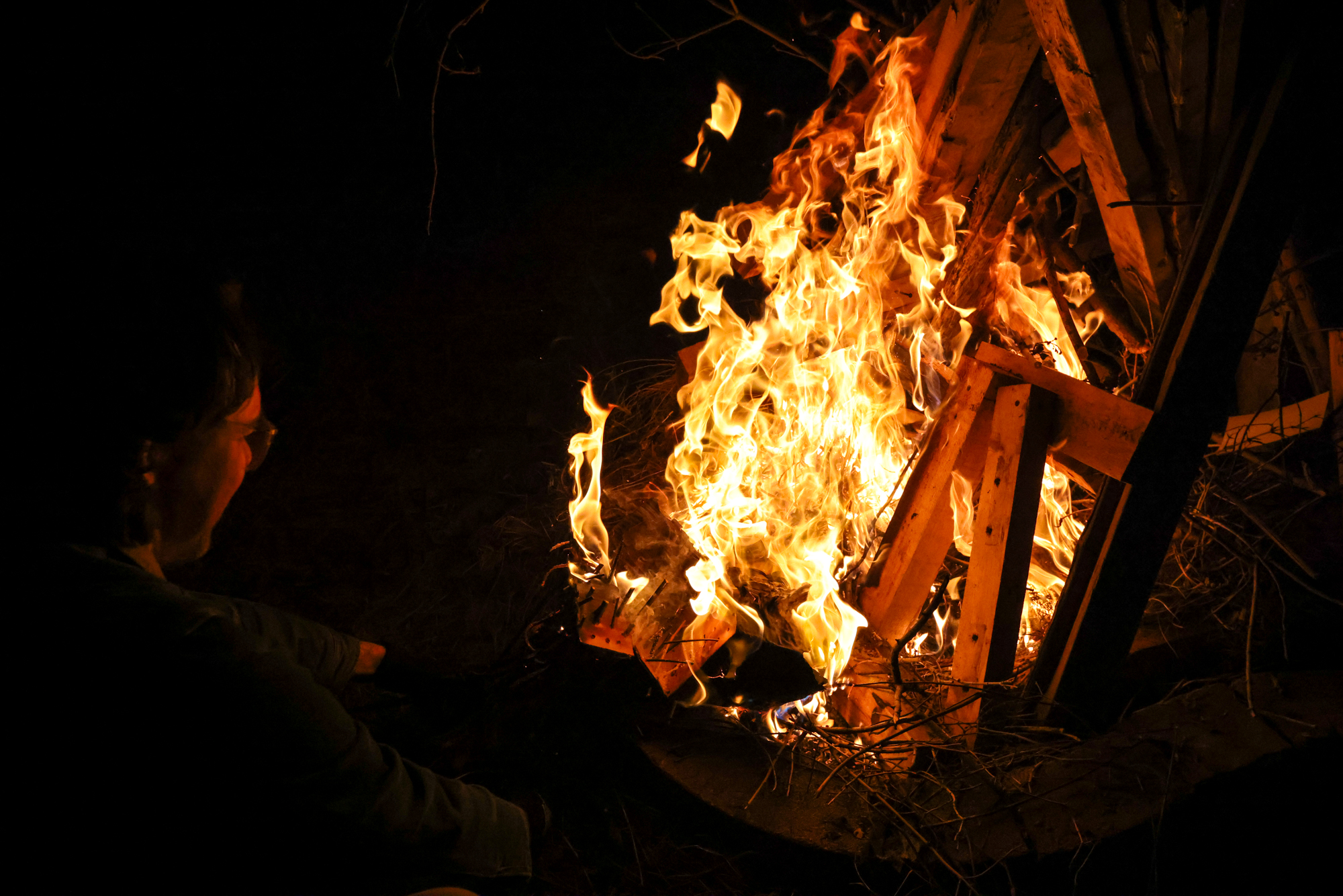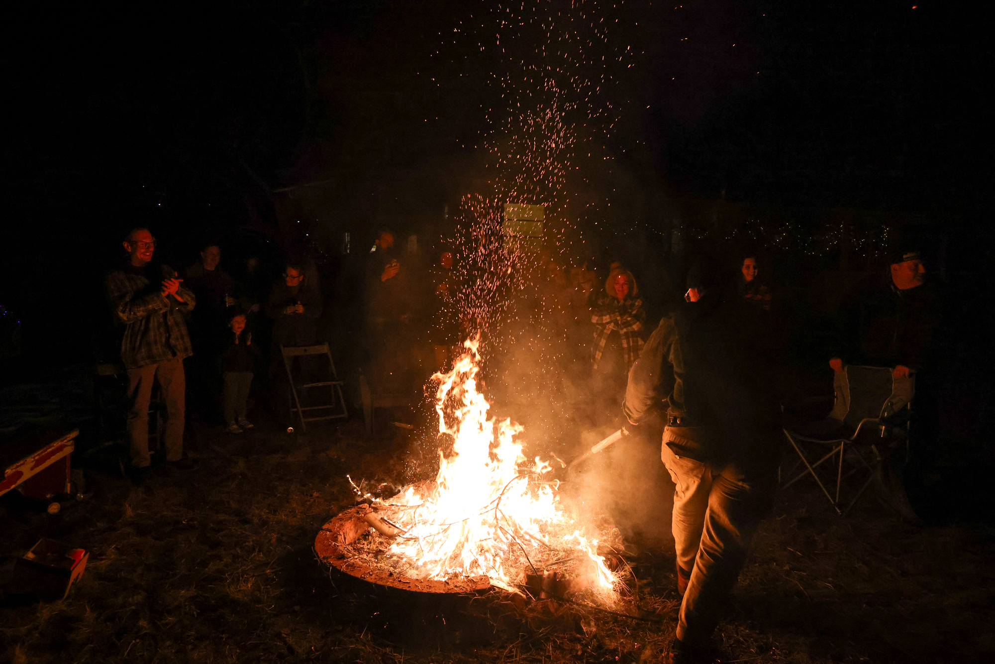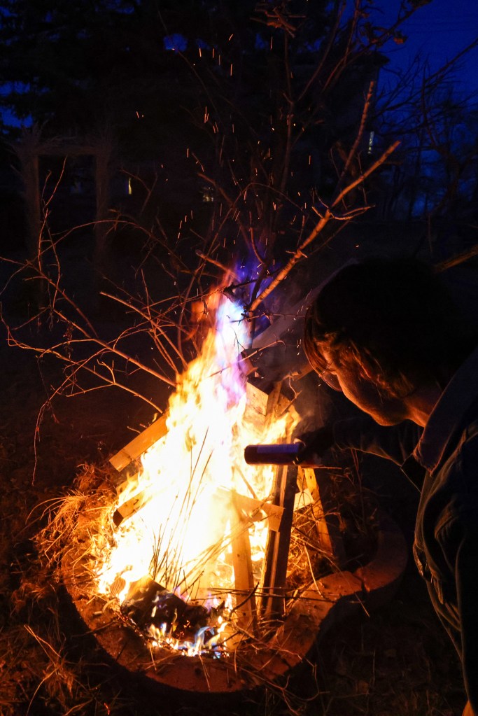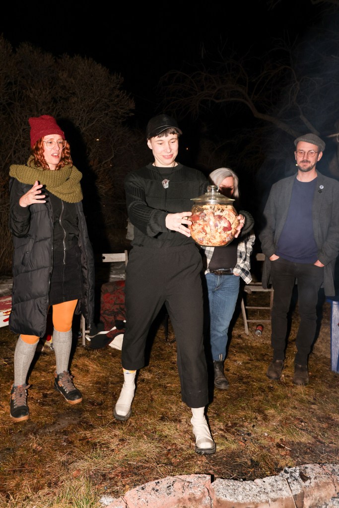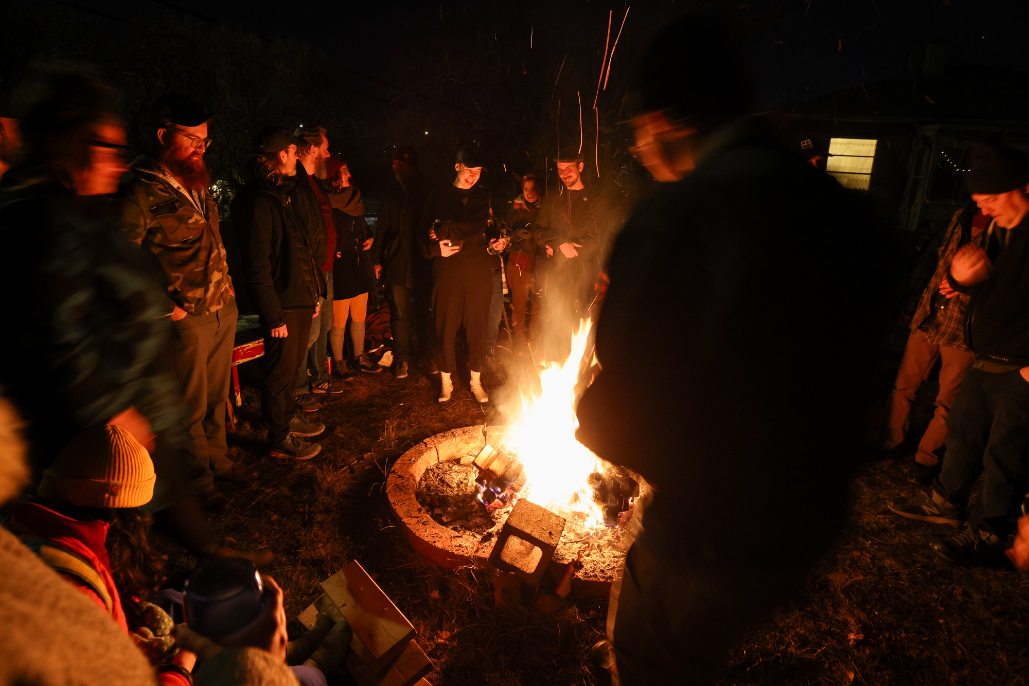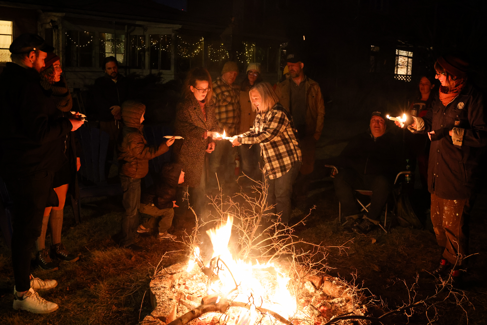 The group was invited to dip into a big jar of dried bouquets from their Mom’s old boyfriends. As a group, we threw the petals into the fire, creating a swoosh of sparks: old flames for new flames.