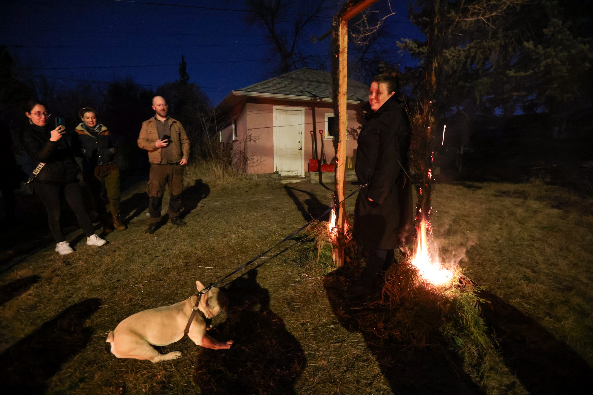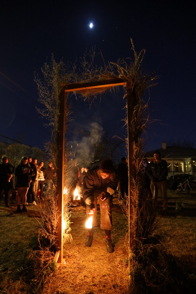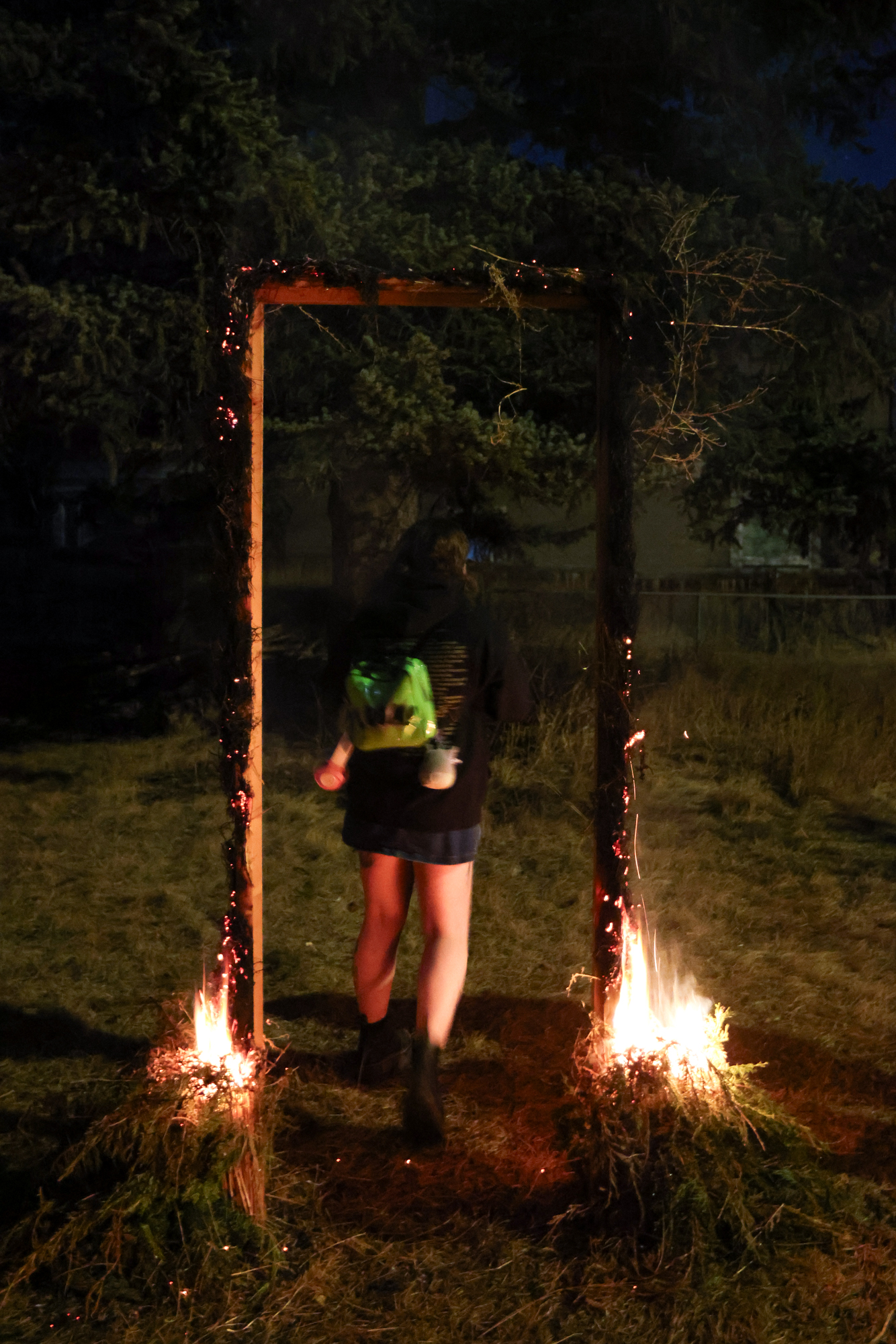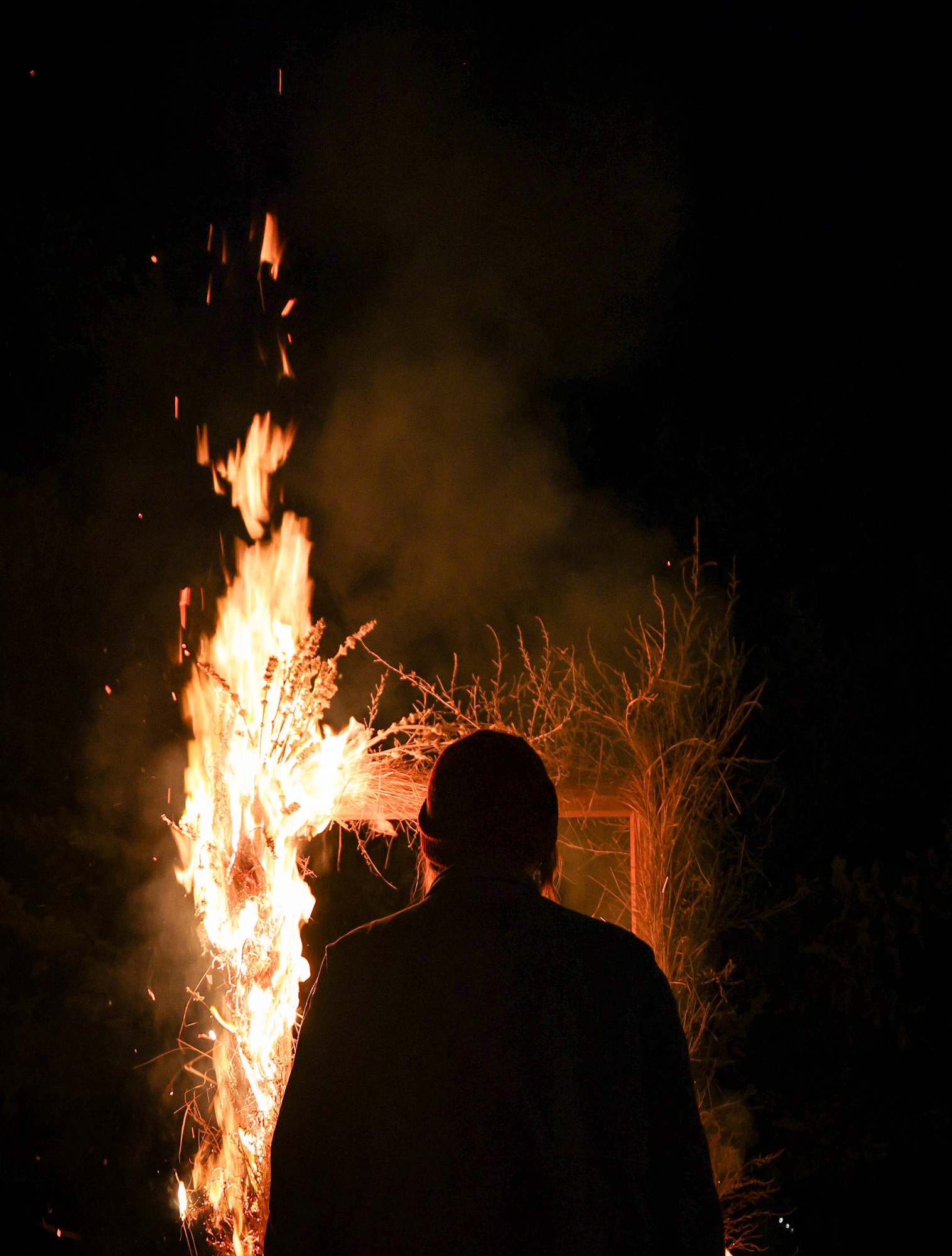 She ignited the dried grasses, and then passed slowly through the burning portal. Then the group was invited to follow, in a collective rite of cleansing.