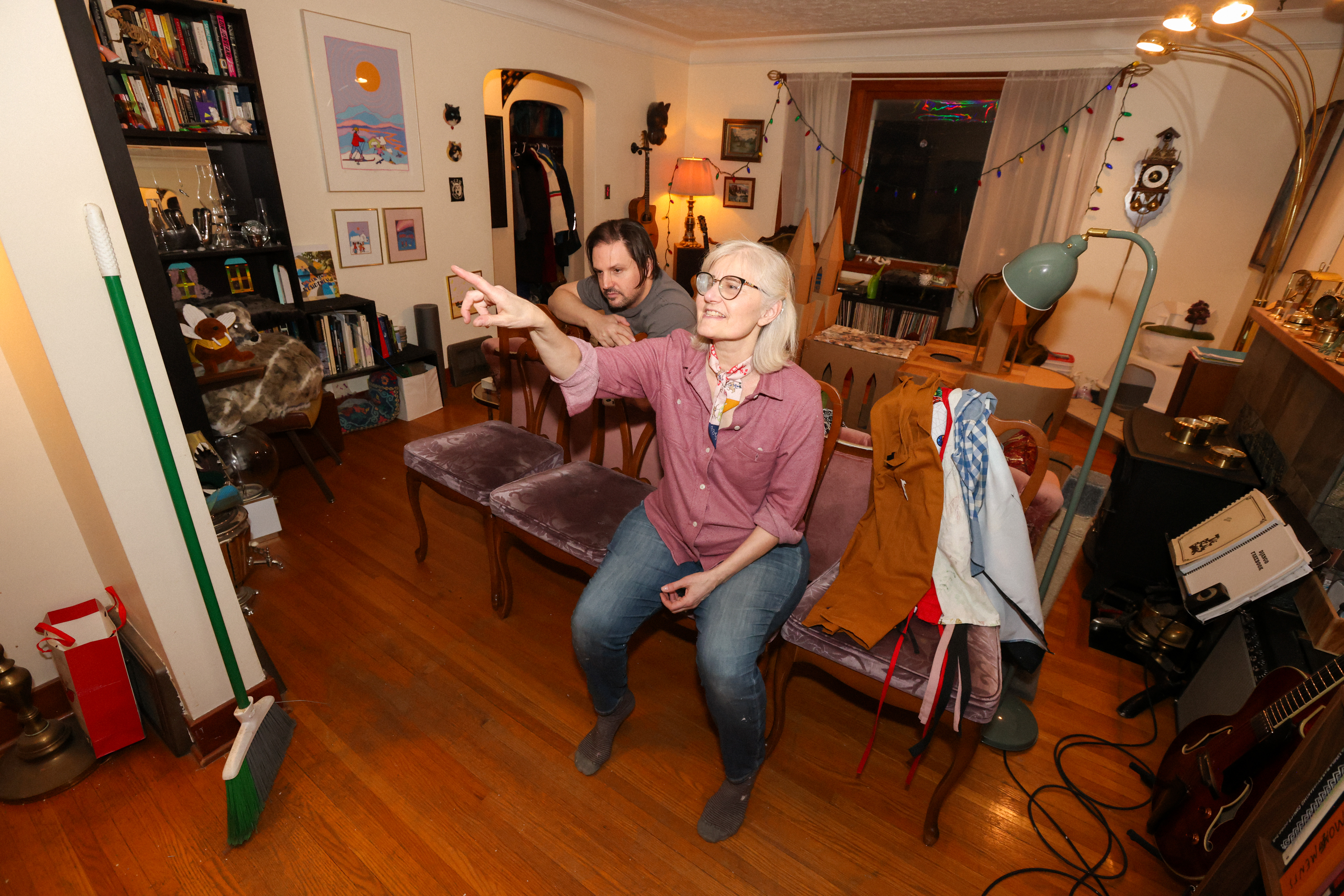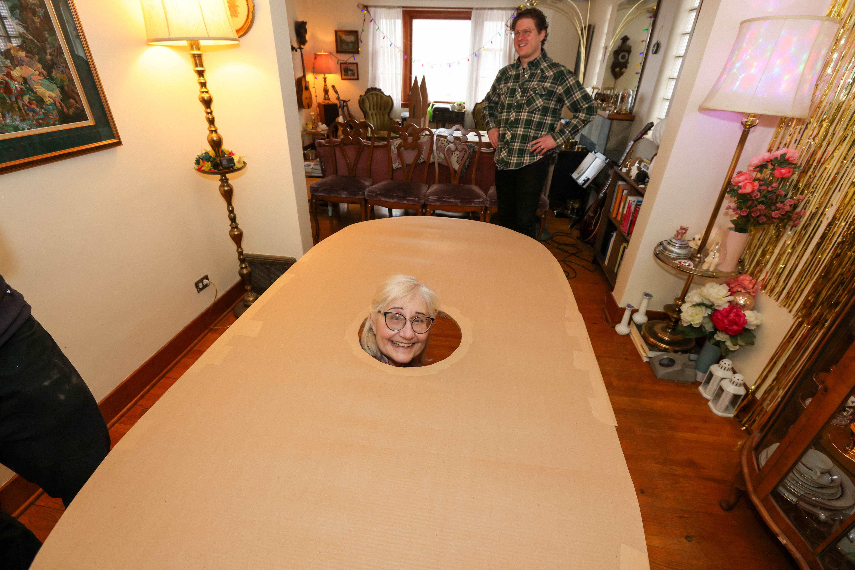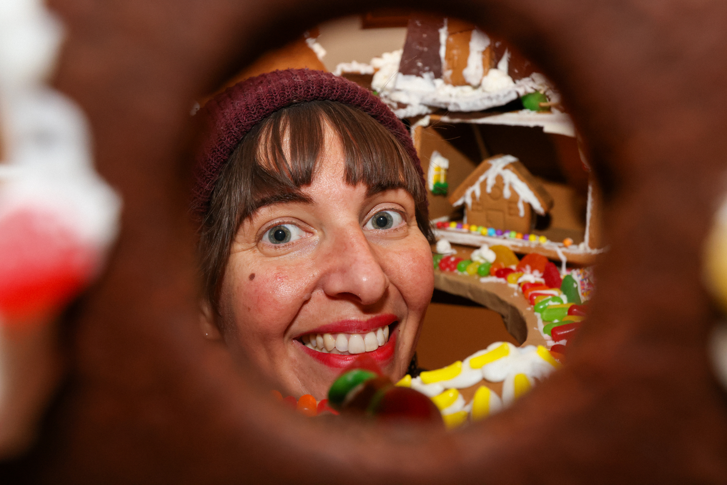 In order to “crawl inside” the gingerbread fort, we cut a hole in a leaf of our dining room table so viewers could poke their heads up inside!